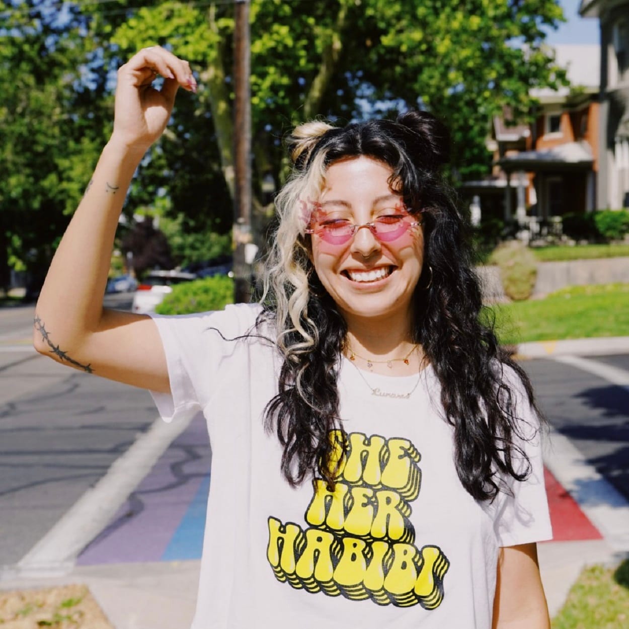 Creating cultural ties between Lebanon and the US does not stop at rug-making for El Gergi. Habibi Bazaar also kicked off a pronoun shirt campaign in collaboration with Mexican artist Alethia Lunares, who designed the t-shirt graphic. “I always put my pronouns as ‘she, her, habibi,’” said El Gergi. “I was so annoyed at the anti-pronoun discourse that I decided to put it on a t-shirt.” She produced three different shirts saying “She, Her, Habibi”, “They, Them, Habibi,” and “He, Him, Habibi.” El Gergi’s decision to include the term “Habibi,” which translates into a non-gendered way of saying “my love,” allows her to incorporate a little bit of her culture into the campaign.