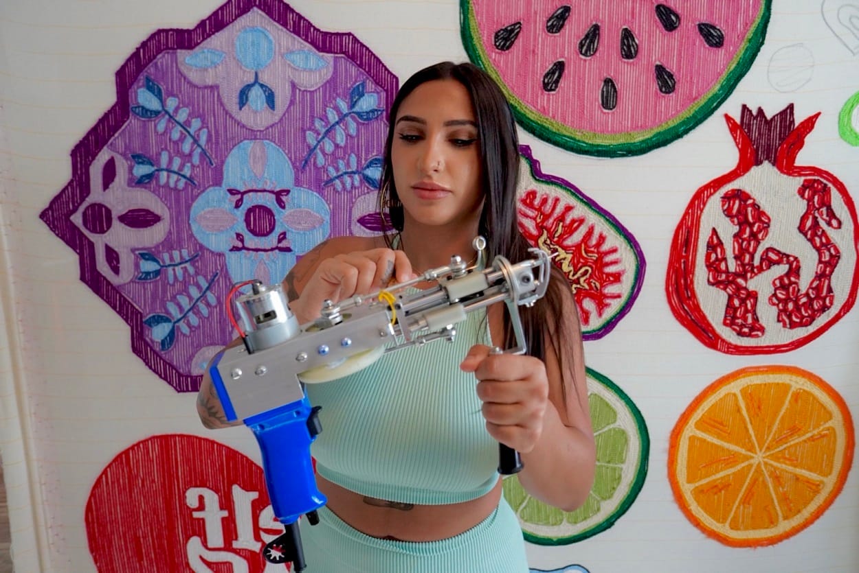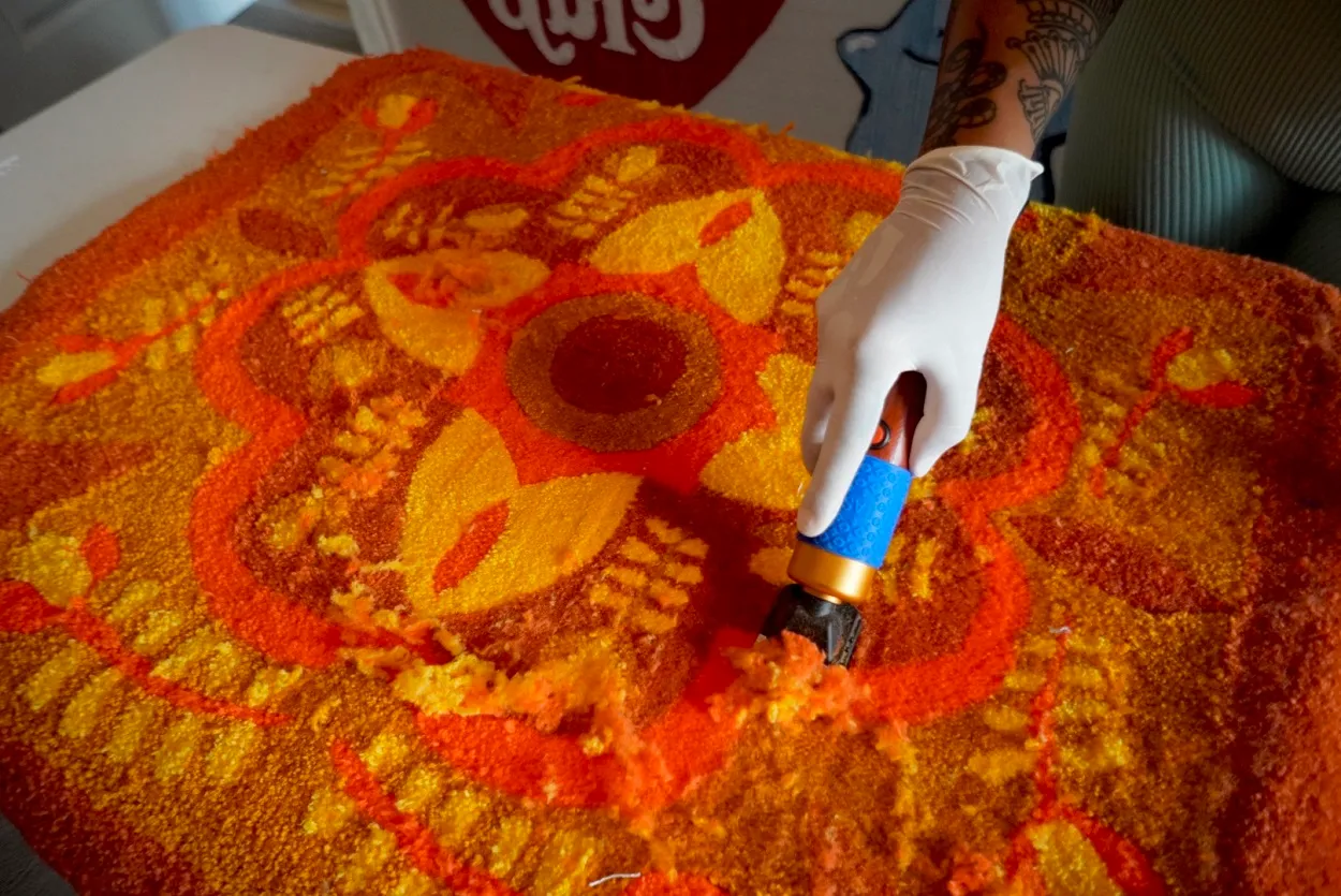 After finalizing her design, El Gergi projects and traces the outline onto her canvas, then uses the tufting gun to apply the yarn accordingly. After applying the carpet glue and backing to the other side of the fabric, she moves on to the final step. “I spend hours on each rug, shaving it properly and carving out the designs (or ‘sculpting’ the rug). I finish it all with vacuuming, lint rolling, and doing one last quality check,” she said.