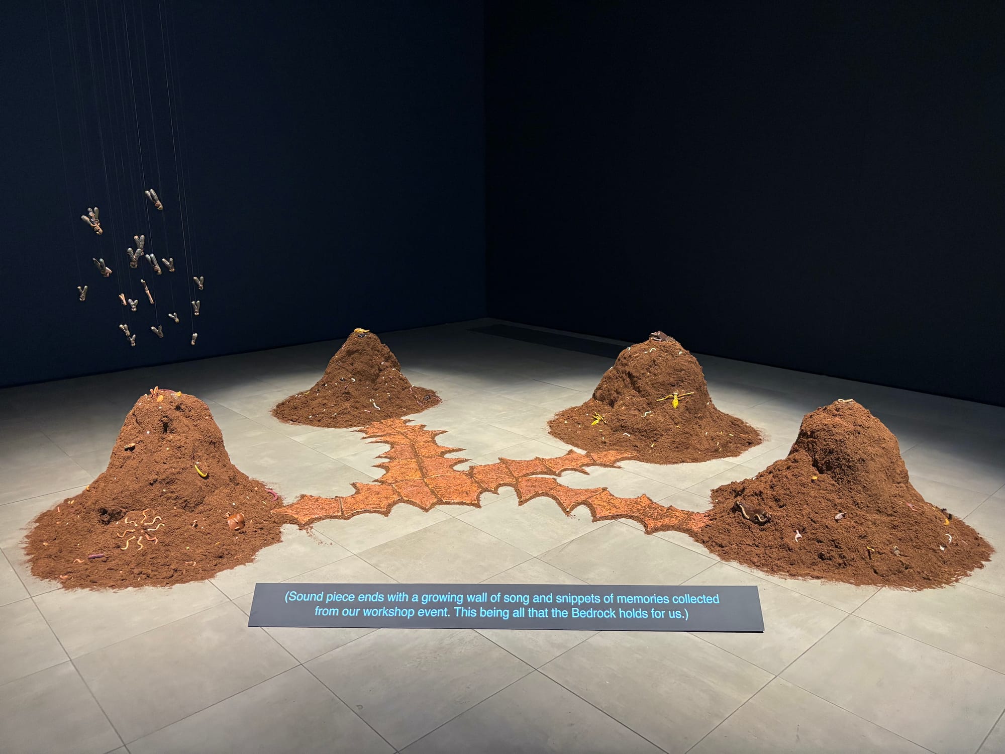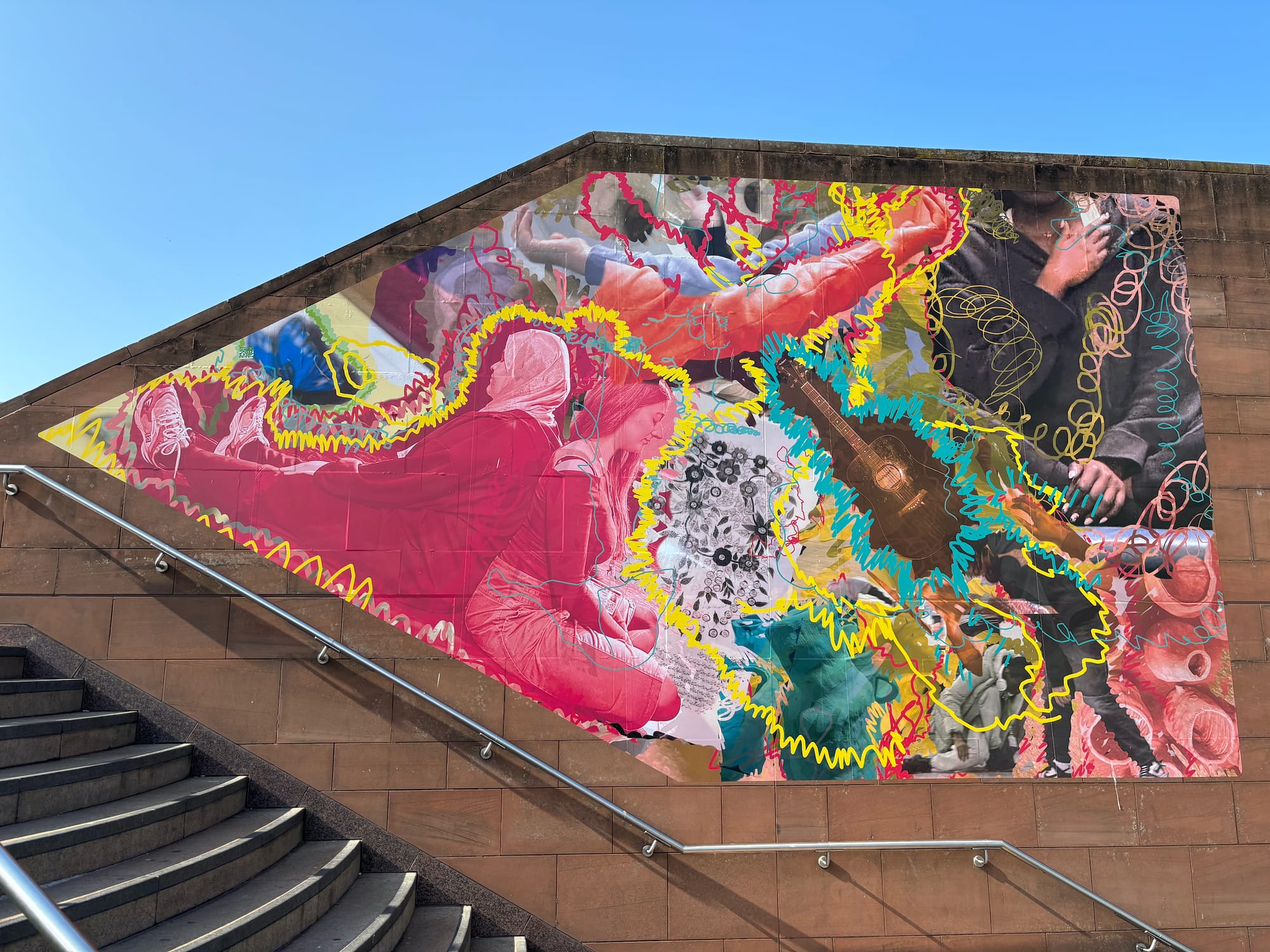 Incredibly, only one of the artists in the biennial has enduring ties to the city. Presented at Bluecoat, Liverpool-born Amber Akaunu’s documentary “Dear Othermother” (2025) shines through in its authenticity. It is a heartfelt examination of single motherhood, intergenerational bonds, and unconventional friendships in the Toxteth neighborhood. The film is deeply tied to the social fabric, given that this area historically harbored people of African and Caribbean ancestry, and one out of six households there today is headed by a single mother. A few other artists have also created meaningful participatory projects involving the local community. Through workshops, the Somali-Indian collaboration DARCH surfaces spiritual traditions around the death and grieving using soil as medium and metaphor. Dublin-based Alice Rekab’s vibrant vinyl murals “Bunchlann / Buncharriag” (2025), co-created with college students, explore assertions of immigrant identities among young people.