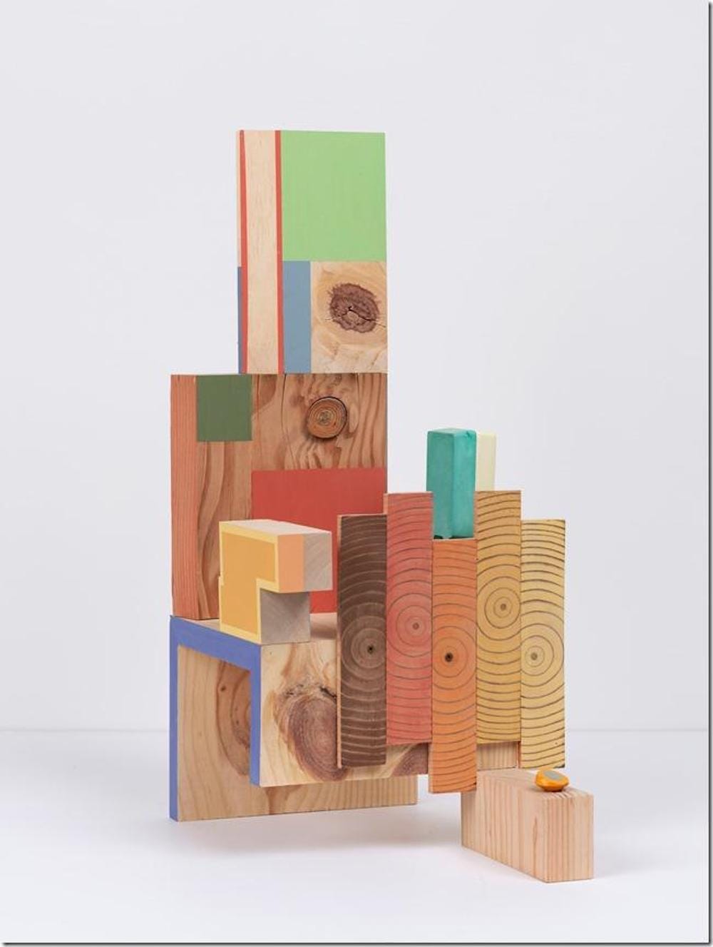Are Osman’s sculptures visions of cities, stage sets, or designs for a playground? Is it necessary to be able to name them in order to appreciate them? There is a lot to unpack in the pieces and the way they he works with paint and wood grain, applied and natural color, as well as how he questions the boundaries separating painting from sculpture. Might we not see the framed orange, yellow, and blue rectangle in “Marquee” (2021, wood, paint, and paper, 62 by 16 1/2 by 17 inches) as an affectionate nod to minimalist geometric painting? Do you see it as having a front and back, like a highway billboard? What does that tell you? Osman’s care for and attention to his modest materials, the particularities of their identity, is rare in a society where excess is celebrated daily.