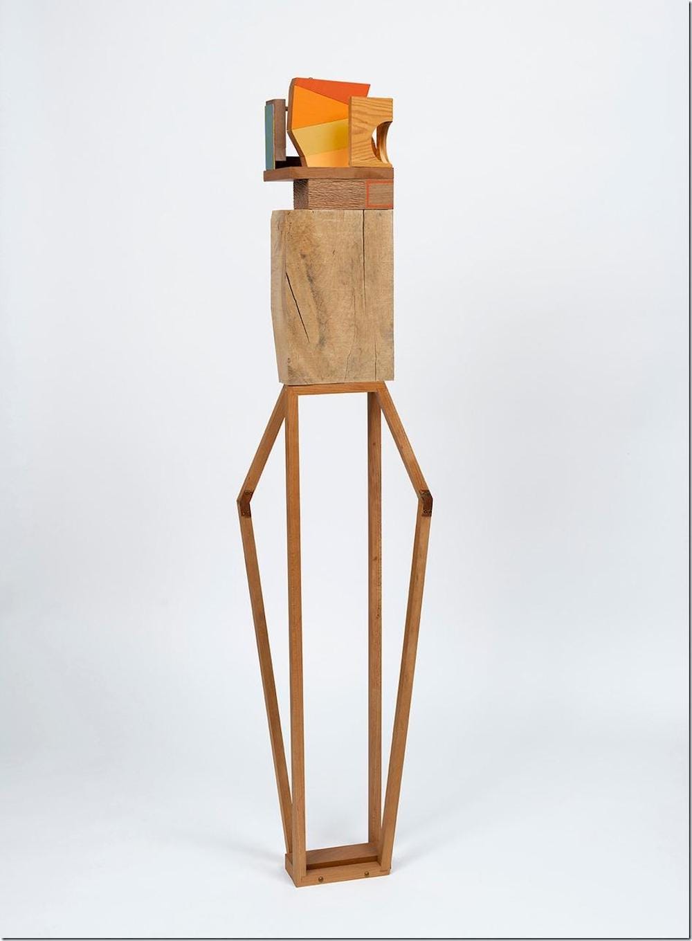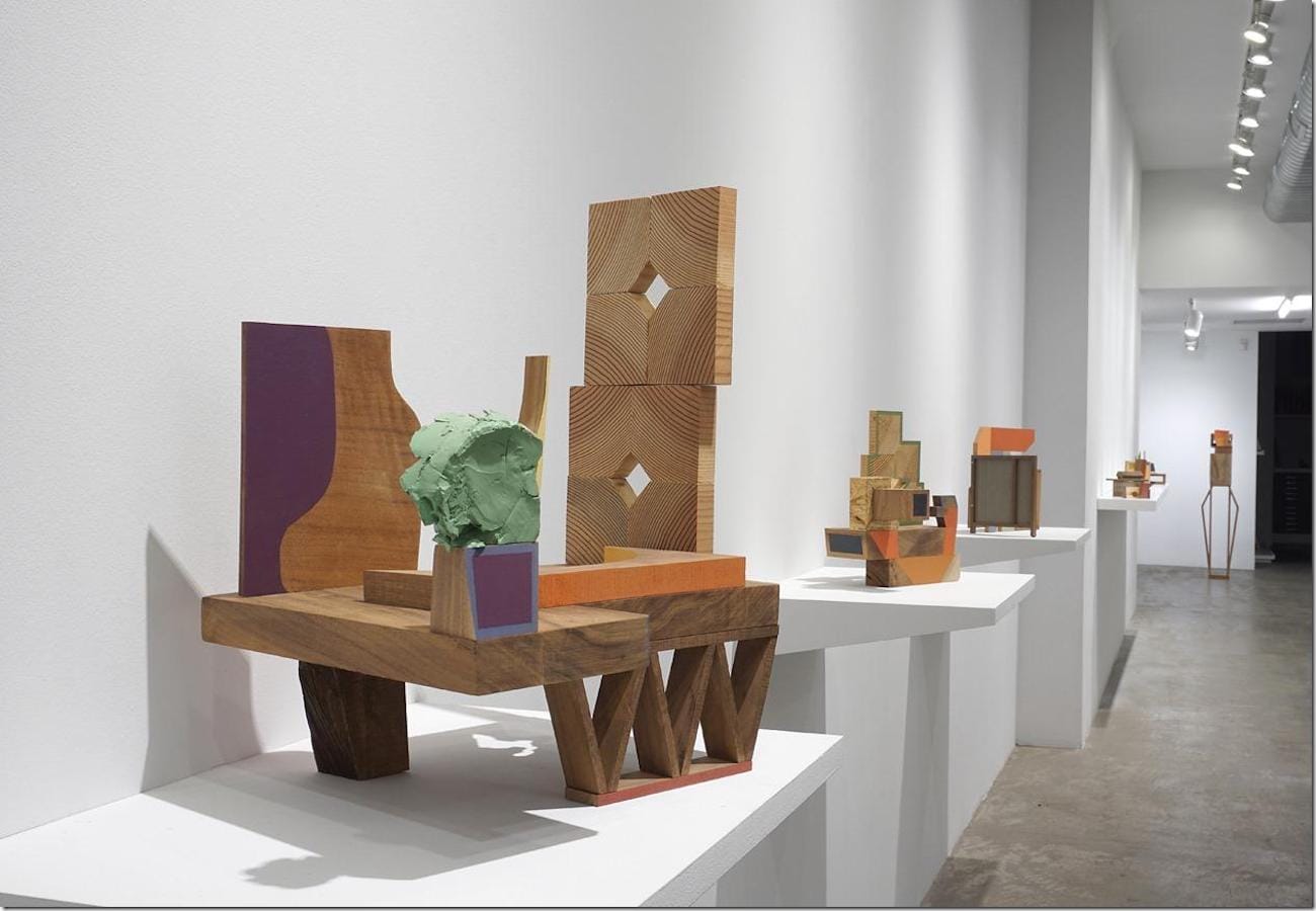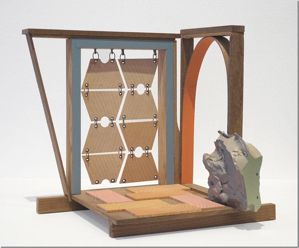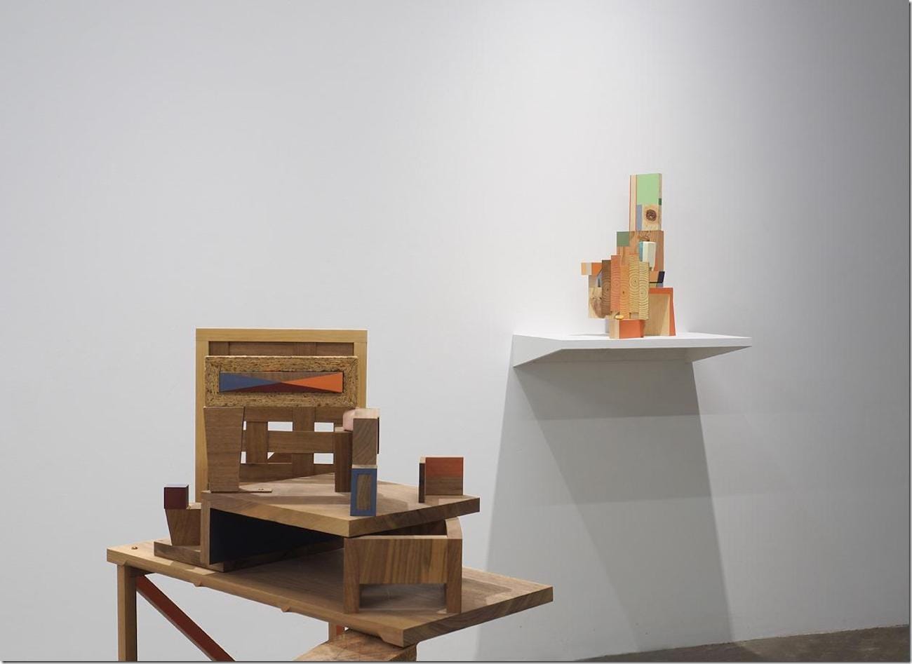 Osman, to his credit, seems to have rejected the need to work big. This is not to say he is a miniaturist, because “Lectern” (2021) is 55 inches in height. He is sensitive to wood grain patterns, color, and surface. He uses OSB, a kind of particleboard, along with other types of finer natural wood. He tends to cut the wood into only planar shapes. In addition to paint and hardware, he uses plaster and colored paper. As the exhibition’s title conveys, Osman’s interest in wood is also driven by its varieties; walnut is an American hardwood that has unique patterns and is easy to shape.