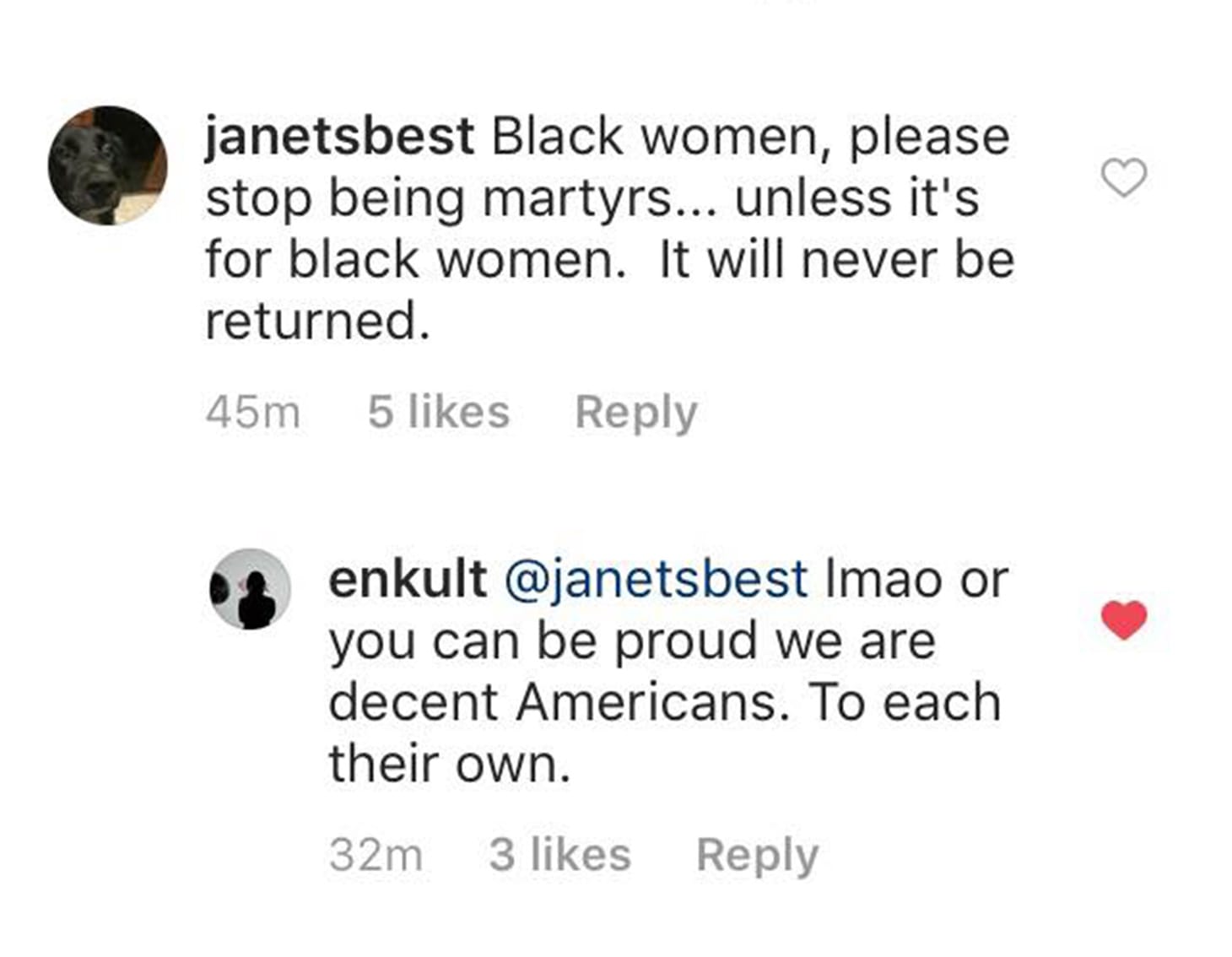 Okoumou has received widespread support for her brave actions, notably by other Black women. BadNewsWomen, a social media blog run by artist Elizabeth Axman, posted a screenshot of a tweet by @TheNYCFilmChick, saying, “My Girl is perched on the STATUE. OF. LIBERTY. Pink sneakers, legs crossed, giving the side eye…Black women are amazing.” Another artist, Sienna Shields, has offered to send art to those who donate to her legal fund in her private Instagram feed, reposted on my timeline. Besides being a performance of protest, her presence there, alongside the Statue of Liberty, was a rallying cry, feeding our spirits. And she didn’t just do it for the children — she was also representing herself and her right to self-expression.