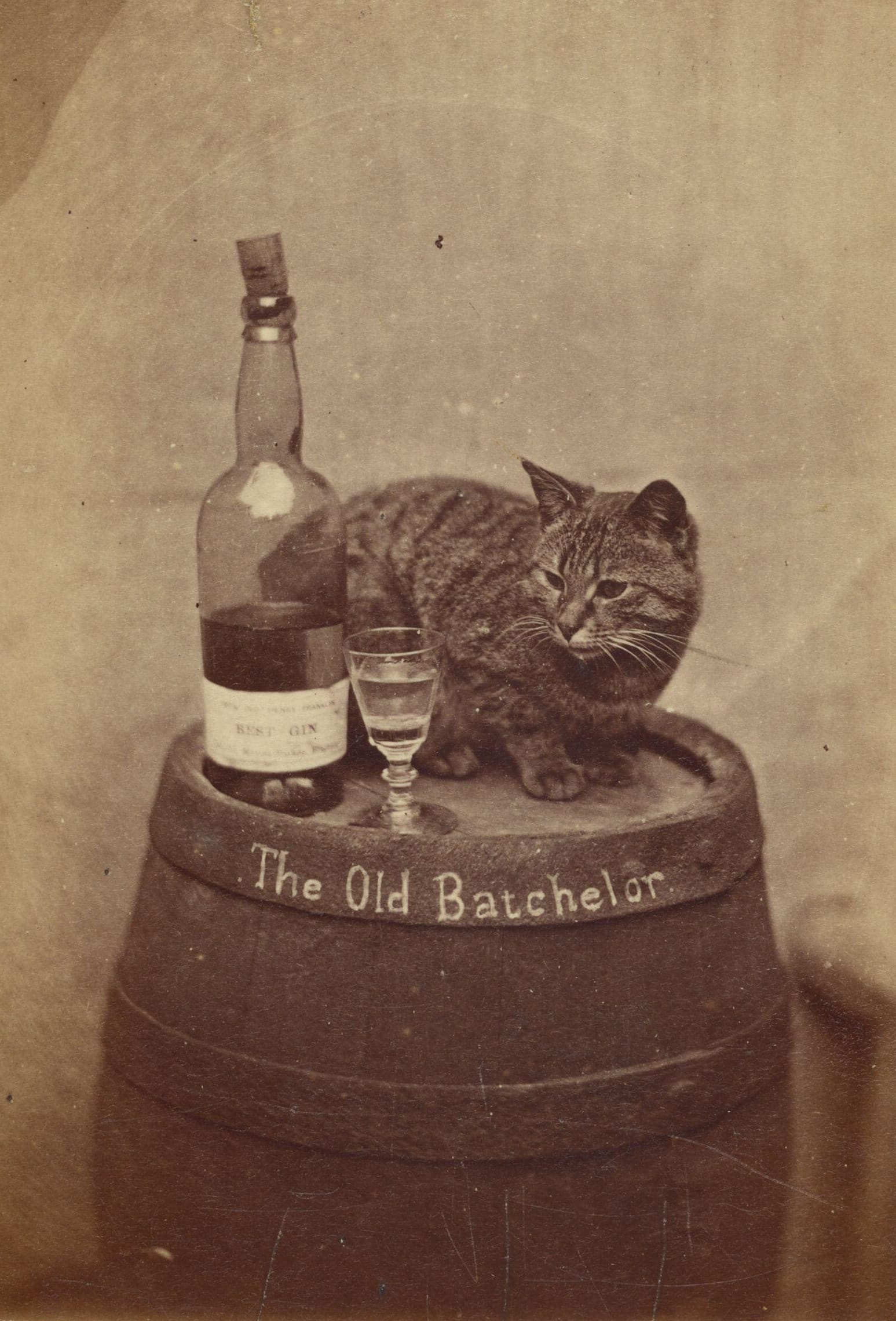 As William Wegman can tell you, the only thing better than a portrait of a pet is a portrait of a pet seeming to partake in human activity. In a post-1860s image titled “The Old Batchelor,” a cat appears atop a wine cask, alongside a glass and corked wine bottle. The image is an example of a “cabinet card” — the photographic rage of its time — which used an albumen process to produce a high-contrast image with a vague sienna wash. Cabinet cards were designed to be exchanged or shared with family and friends, so they were essentially the first memes. (Get it? It's a "batch" of wine, and we all know that bachelors drink a lot, and the cat is like ... well, not all memes are funny, anyway.)
