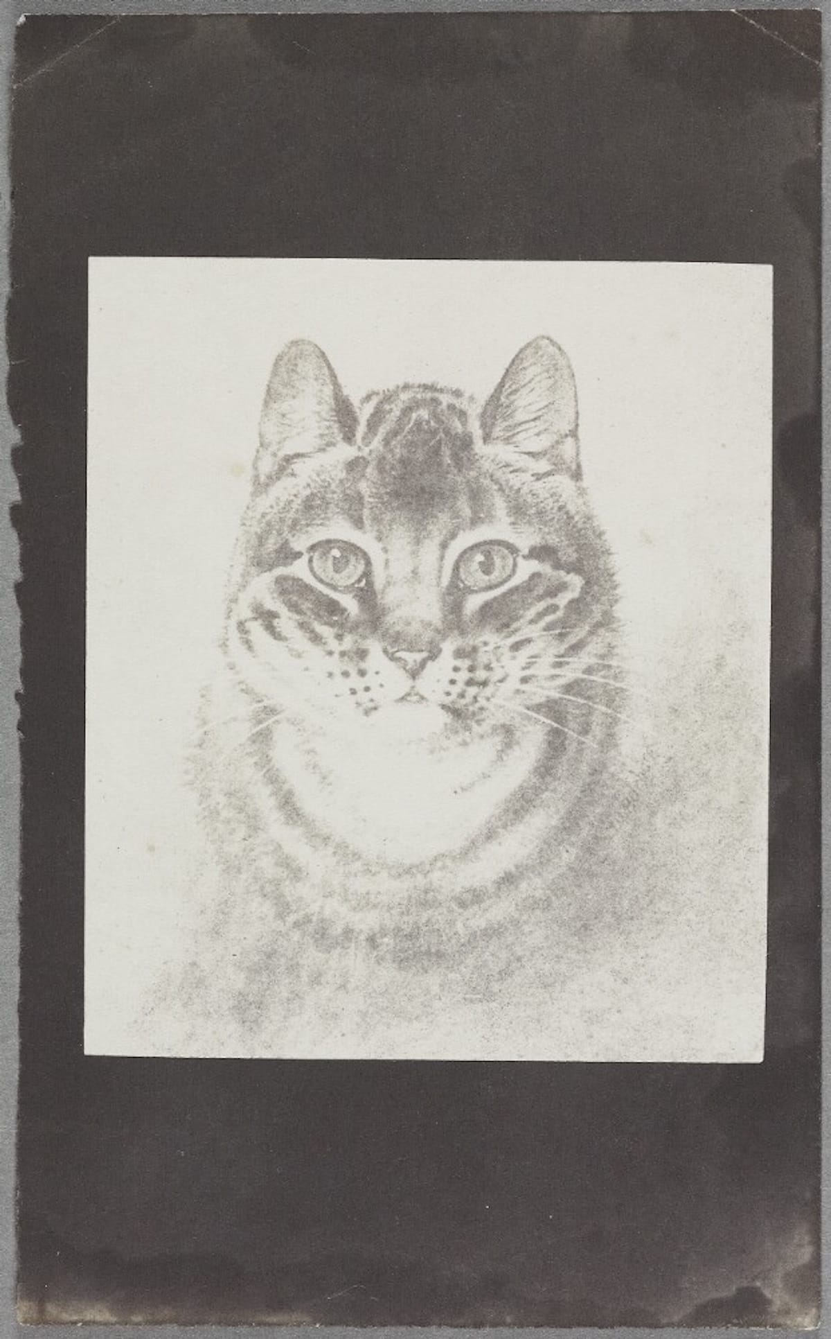 This first image in the exhibition, made by artist J.M. Burbank, utilizes the negative/positive process in silver-based photography, an 1834 breakthrough by William Henry Fox Talbot, to depict a favorite cat. Though the softly shaded image looks more like a pencil drawing than a high-contrast photograph, it stands as not only a successful technological experiment but also a cat-tivating portrait of his feline subject. It's also an example of Burbank's modest mark on history: He would go on to exhibit animal studies throughout the 1830s in Britain.