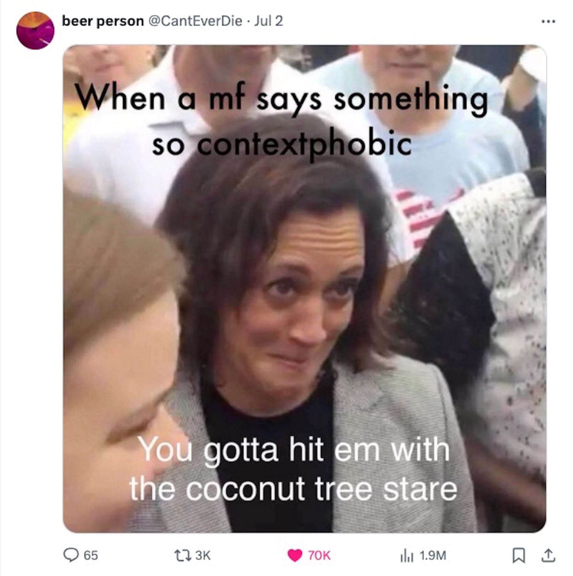 And for whatever reason, people ran with that. More like sprinted, somersaulted, and did a tumbling routine into a split, by the looks of the sheer volume and complexity of coconut tree memes. The sound bite reportedly emerged in February, but edits and visual references have since spread like wildfire after Biden's poor performance during his first presidential debate with Trump late last June, paired with memes of Harris manifesting a candidacy nomination.