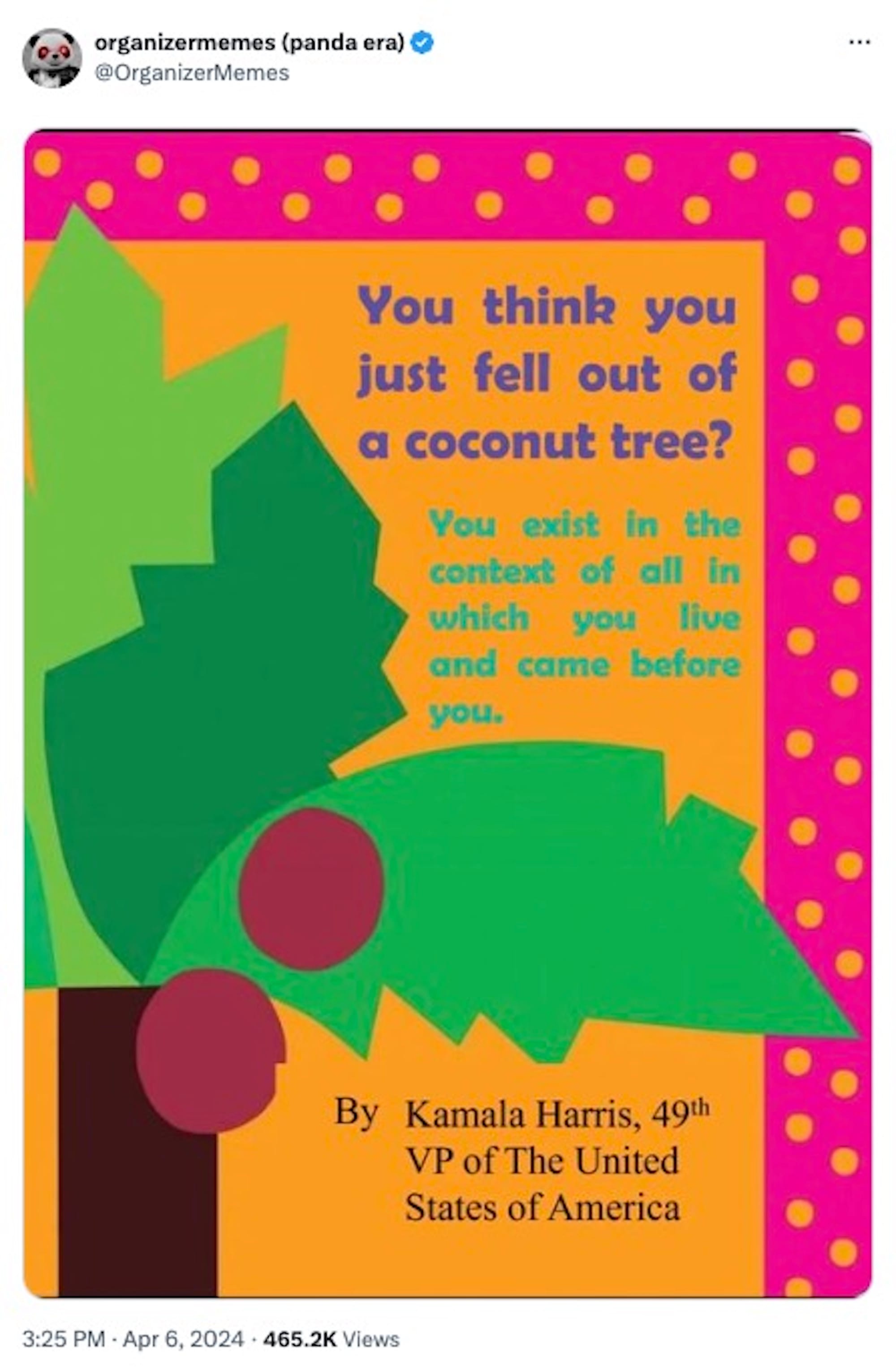 Practically ubiquitous, the coconut tree meme comes from a portion of Harris's speech at a May 2023 ceremony for the White House Initiative on Advancing Educational Equity, Excellence, and Economic Opportunity for Hispanics, when she shared a brief anecdote about her mother.