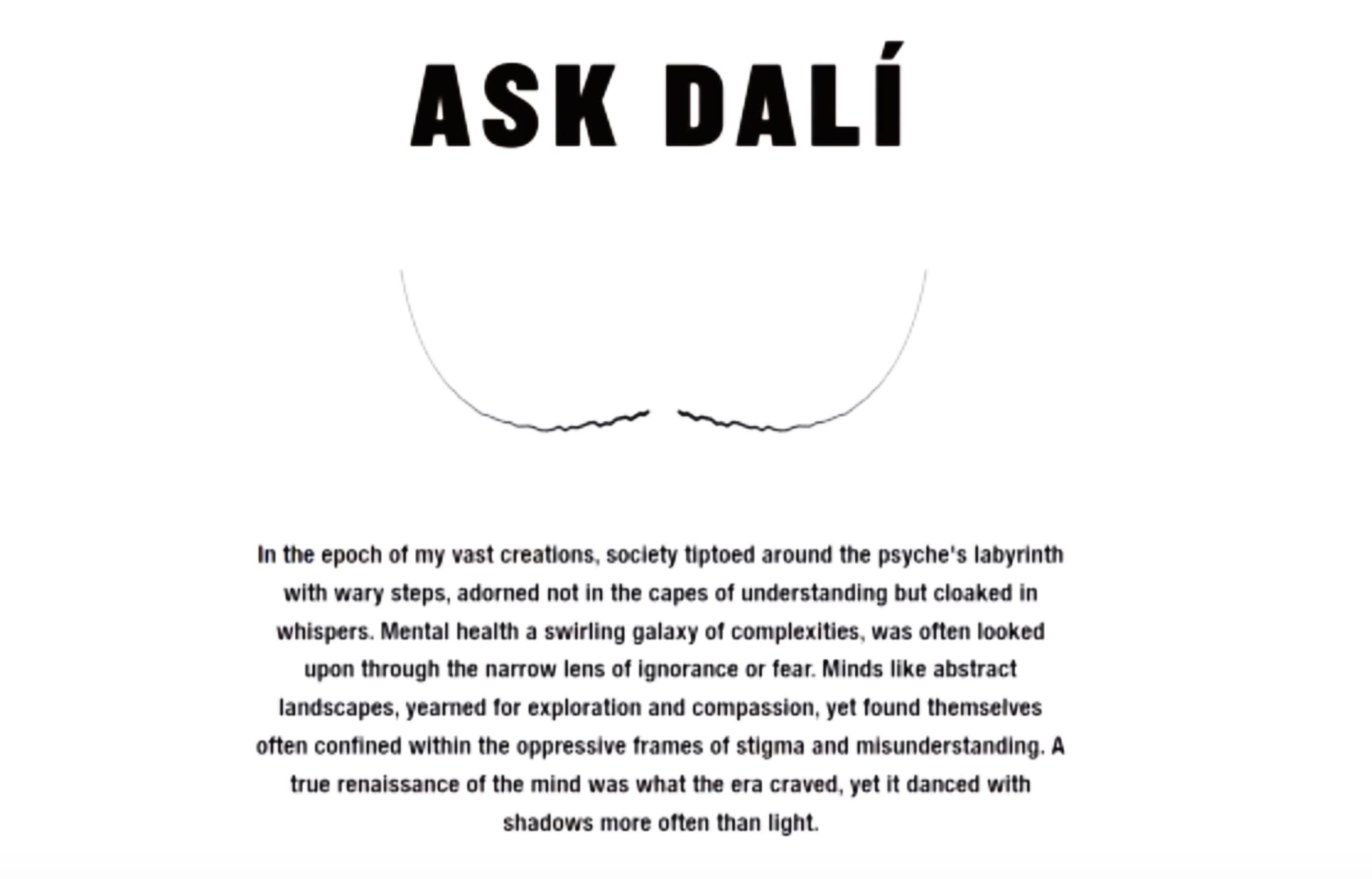 My fault entirely, of course. Ludvigsen explained that AI Dalí "has a personality, and isn't fond of the mundane," so he'll politely redirect what he considers uninteresting questions into a different line of conversation instead of outright refusing to answer them. I asked Ludvigsen about pressing the artist on his unsavory proclivities — namely, his affectionate reverence of fascism and violent history, to keep it somewhat PG — and how Ask Dalí would respond.