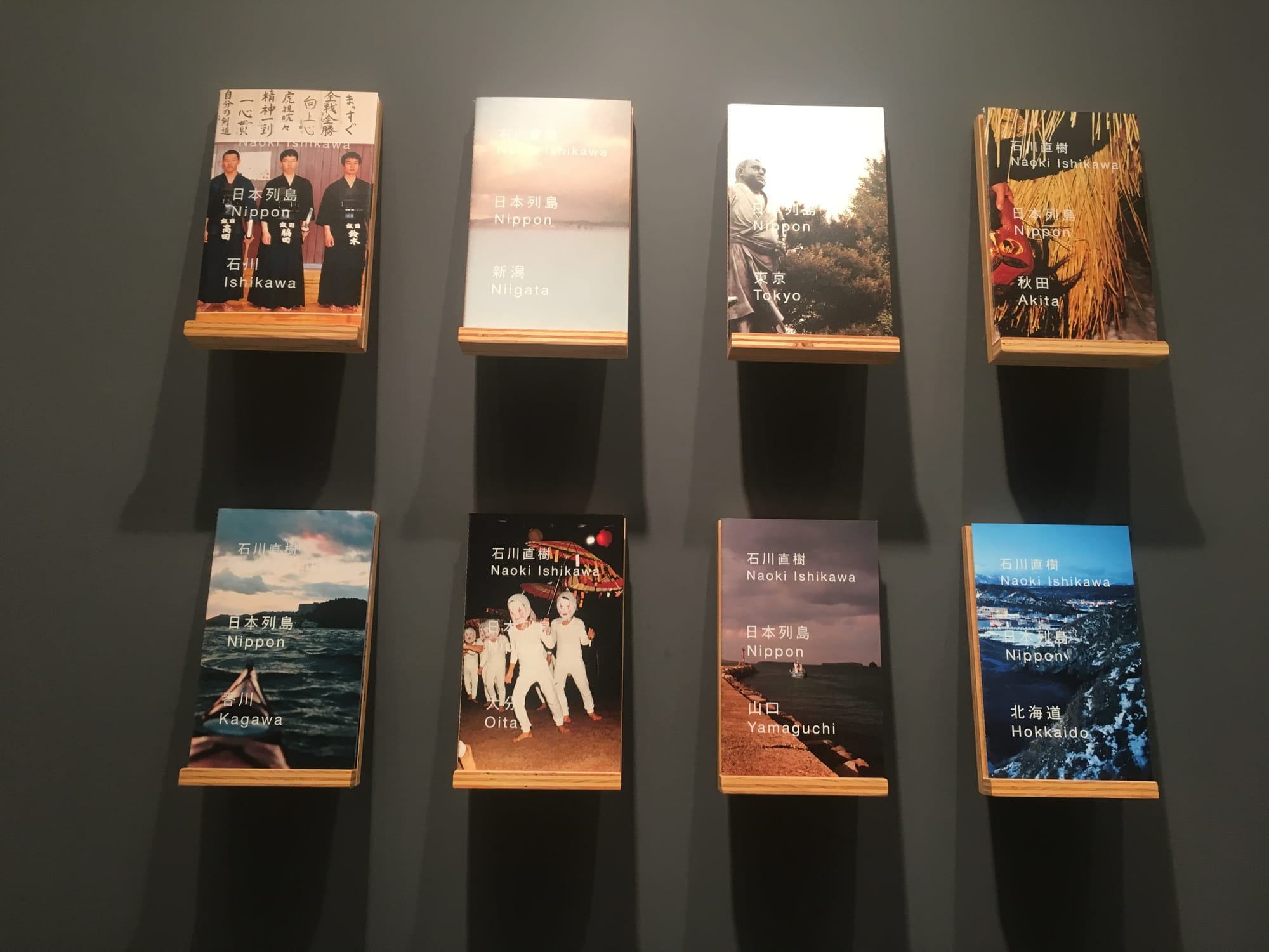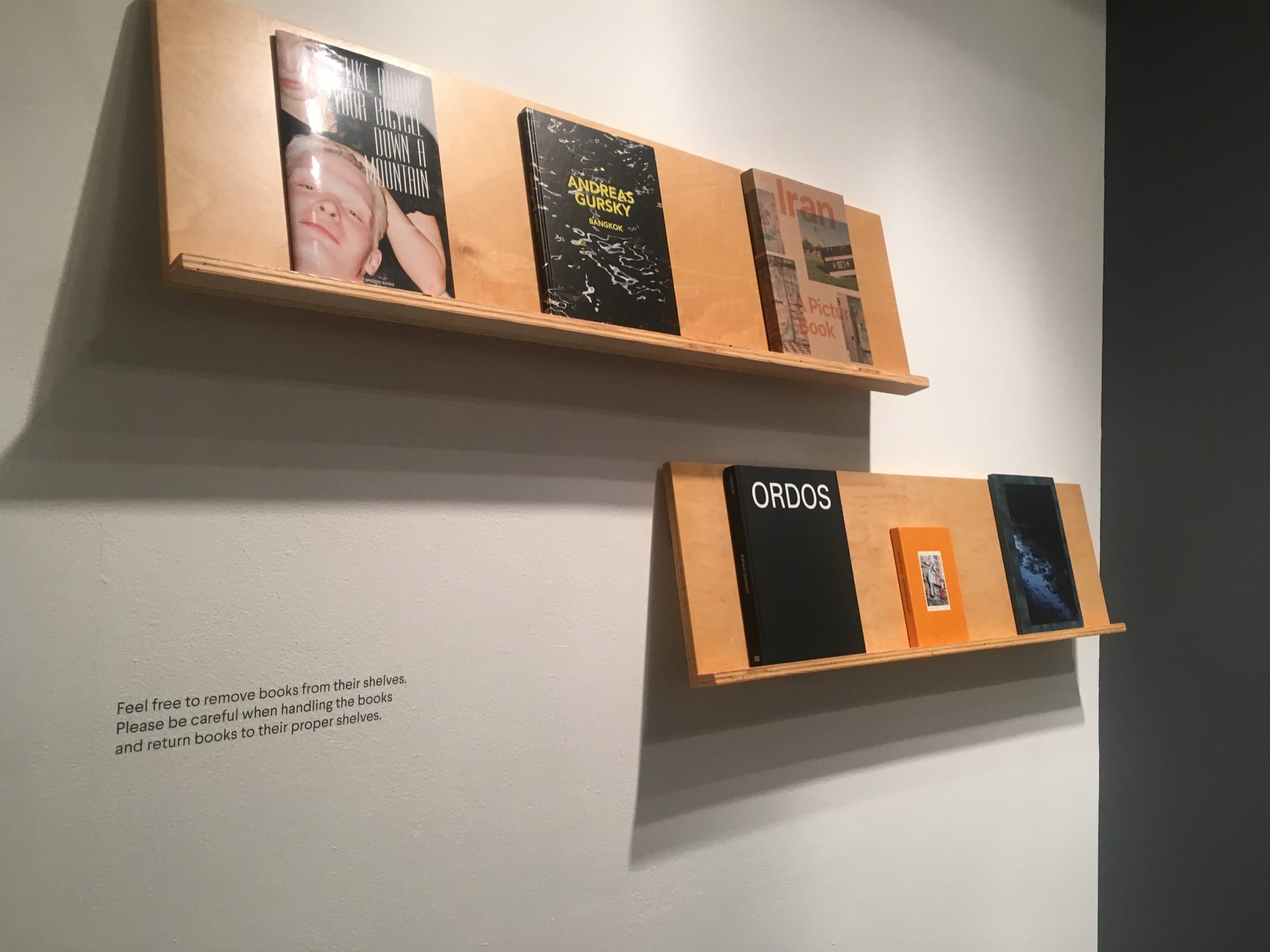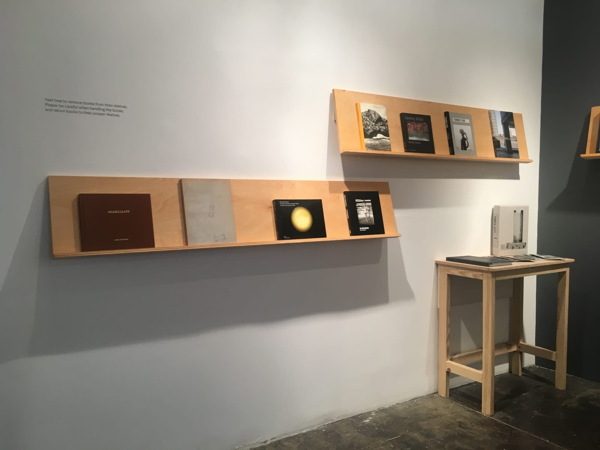 The books, from locations around the world, are displayed on shallow wood shelves with their covers facing outward. Vinyl wall texts throughout instruct viewers to “Feel free to remove books from their shelves.” A rare allowance in an art exhibition, even one centered on books, it transforms the show from an experience of distanced viewing into an active reading room. A table in the gallery is scattered with copies of a reference guide that lists all the titles, organized by artist, with a screenshot of a map indicating the location documented in the books’ photographs, along with excerpts from press releases for more information on the titles.