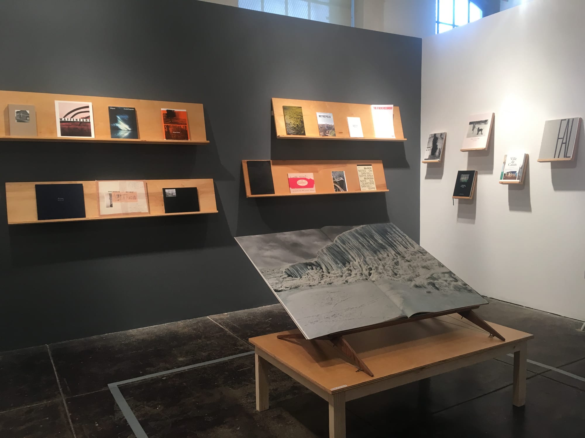 The titles offers glimpses into different locations with the slow and detailed pace of that comes with reading books. Oliver Hartung’s Iran, A Picture Book (Spector, 2016) is an oversized floppy book with matte photographs printed in a dreamy CMYK color palette. From 2011–14 Hartung photographed political monuments as well as domestic settings filled with posters of Western celebrities, granting foreign readers access to the everyday life and landscapes of a country Americans often see only as a tragic site of war and destruction. Iran, A Picture Book rests on a shelf near books like Andreas Gursky’s glossy Bangkok (Steidl, 2012), which features photos of the Chao Phraya River’s waters that resemble abstract paintings.