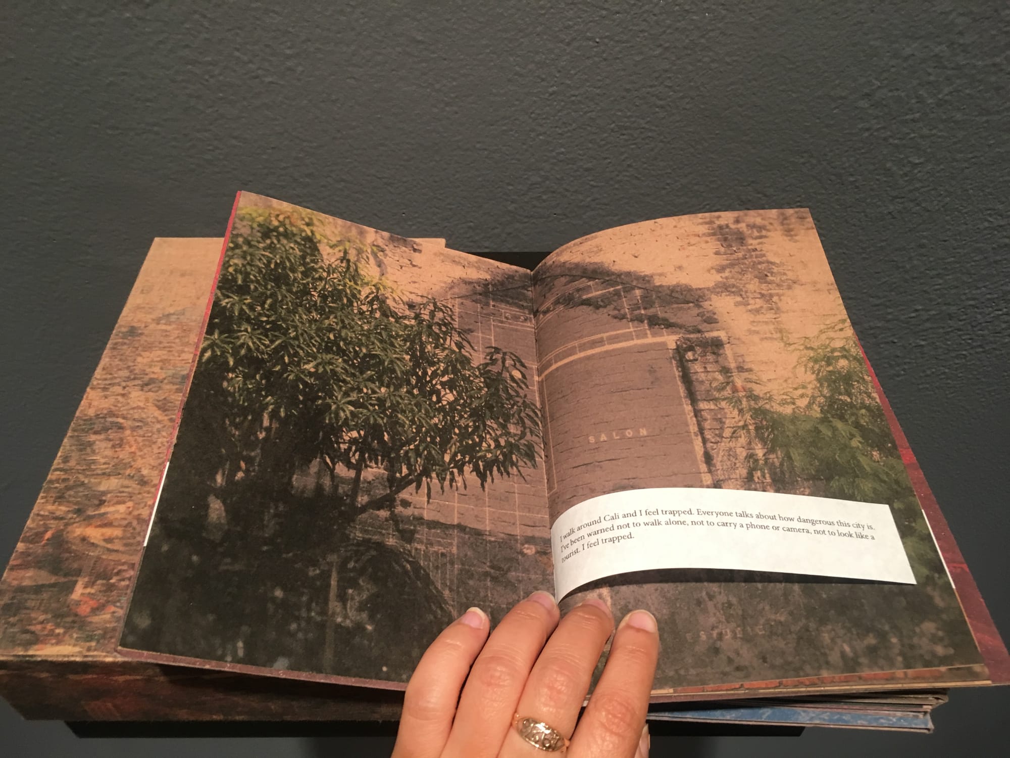 I applaud Brilliant’s positioning of widely accessible books as art object — most of the titles are available in bookstores and online. But the exhibition also includes unique books, such as Laura Barrón’s Absentia (2019), a self-published artist’s book composed of seven booklets stored together in a sleeve. The books have the texture and color of heavy-weight cardboard, yet are fragile, with slips of smaller typed text pages sewn into the bindings between full-page pictures of water, brick walls, parks, and other nondescript but specific markers of place. Each booklet serves as travel journal, cataloguing the artist’s journey through Cali, Buenos Aries, Quito, Lima, Havana, La Paz, and her final destination, Mexico City, which marks her return to her home country.