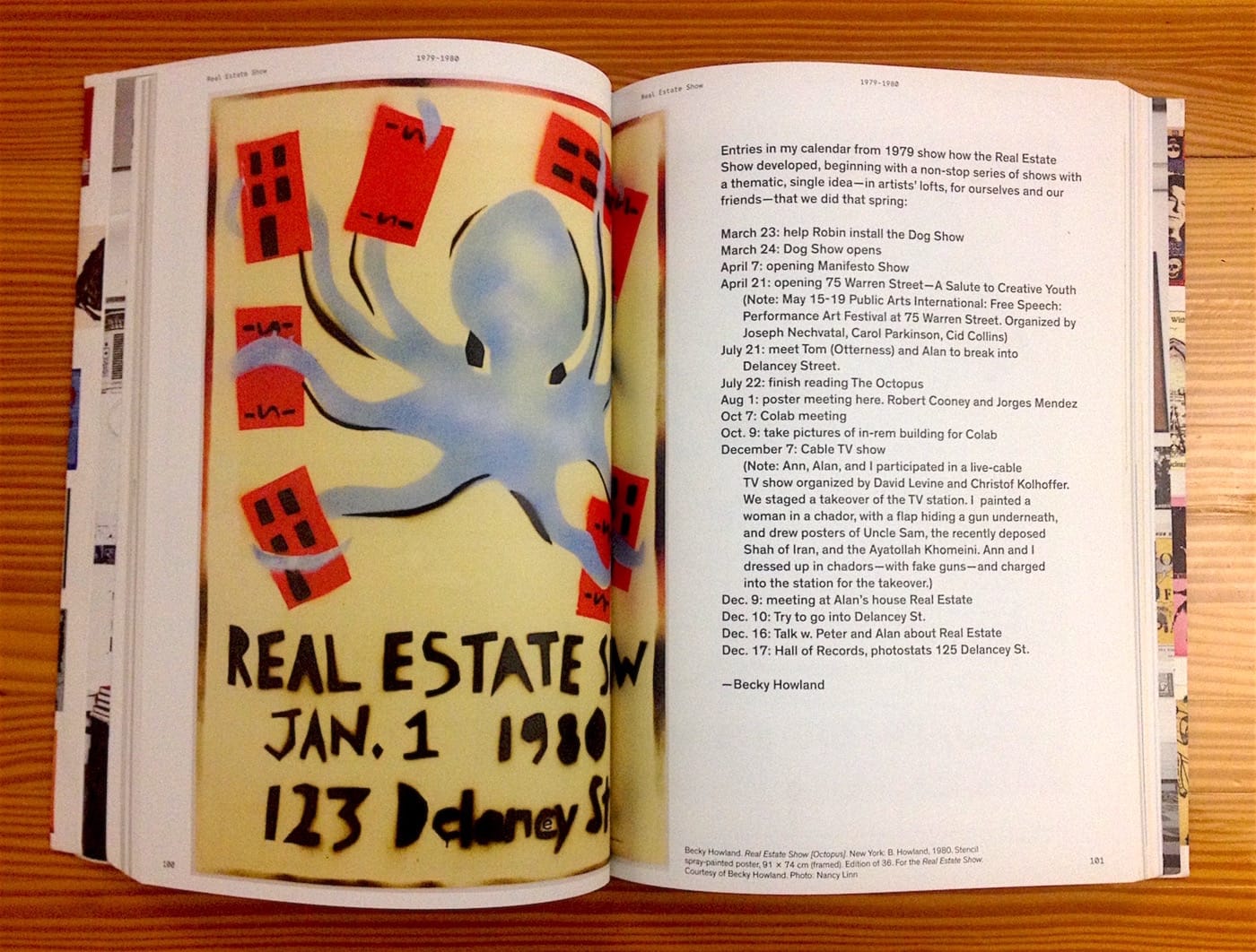 The book, which is roughly chronological, is divided into sections dedicated to particular projects. Author names appear at the end of each contribution — most of which are brief — which has the effect of diluting the reader’s expectations. Unless you turn the page or read ahead, you often don’t realize whose words you’re reading. With the exception of Robinson’s foreword and afterword, no single contribution is given any sort of headline treatment. Unsurprisingly, the Times Square and Real Estate Shows — the exhibitions for which Colab is best known — comprise the largest sections.