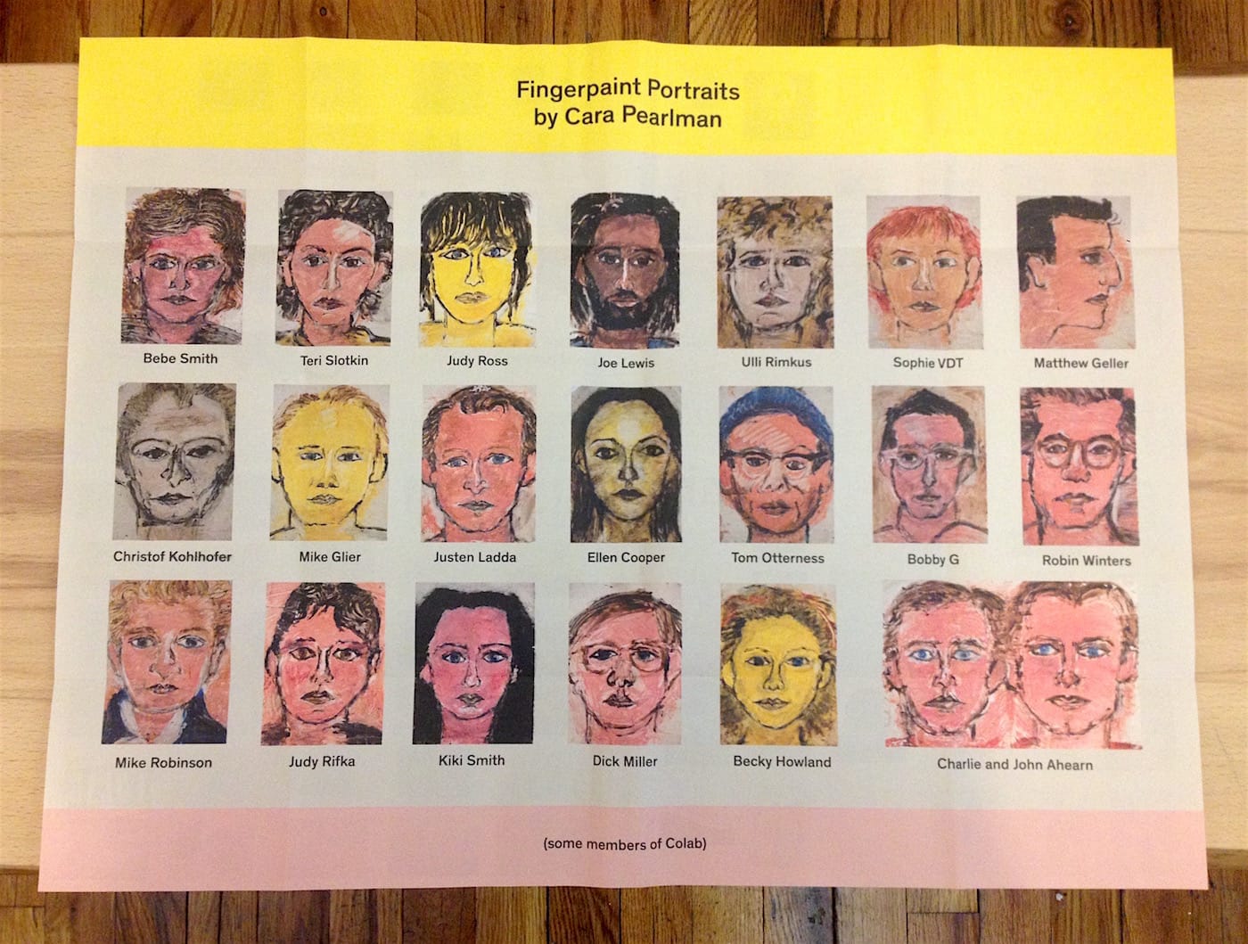 Colab’s entire ethos is further complemented by the book’s wraparound cover, which doubles as a reversible, fold-out poster. The front is comprised of an assortment of flyers and artworks by various members of the group, while the reverse features Cara Perlman’s finger-paint portraits of “some members of Colab” (1981–2) (amusingly, John and Charlie Ahearn are featured together as a single portrait). The thumbnail images on the book’s cover evoke the displays of the A. More Store, while also embodying Colab’s celebration of the multiple.