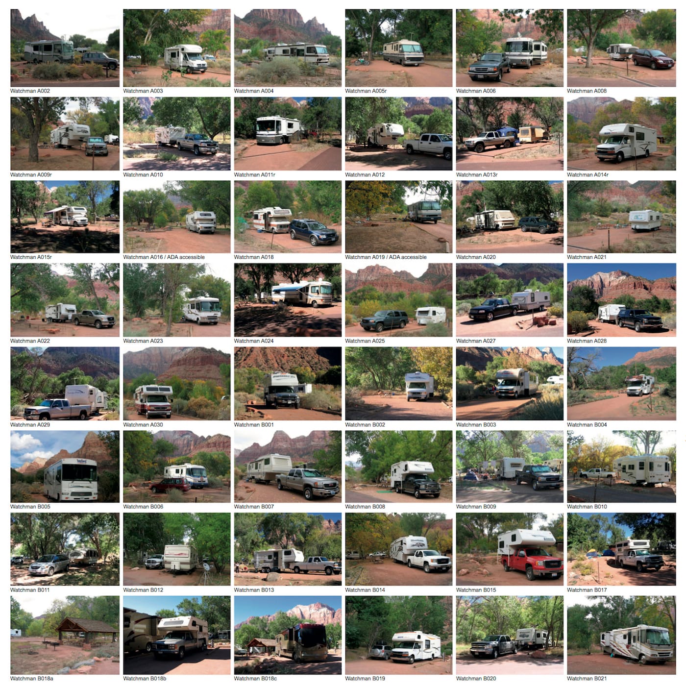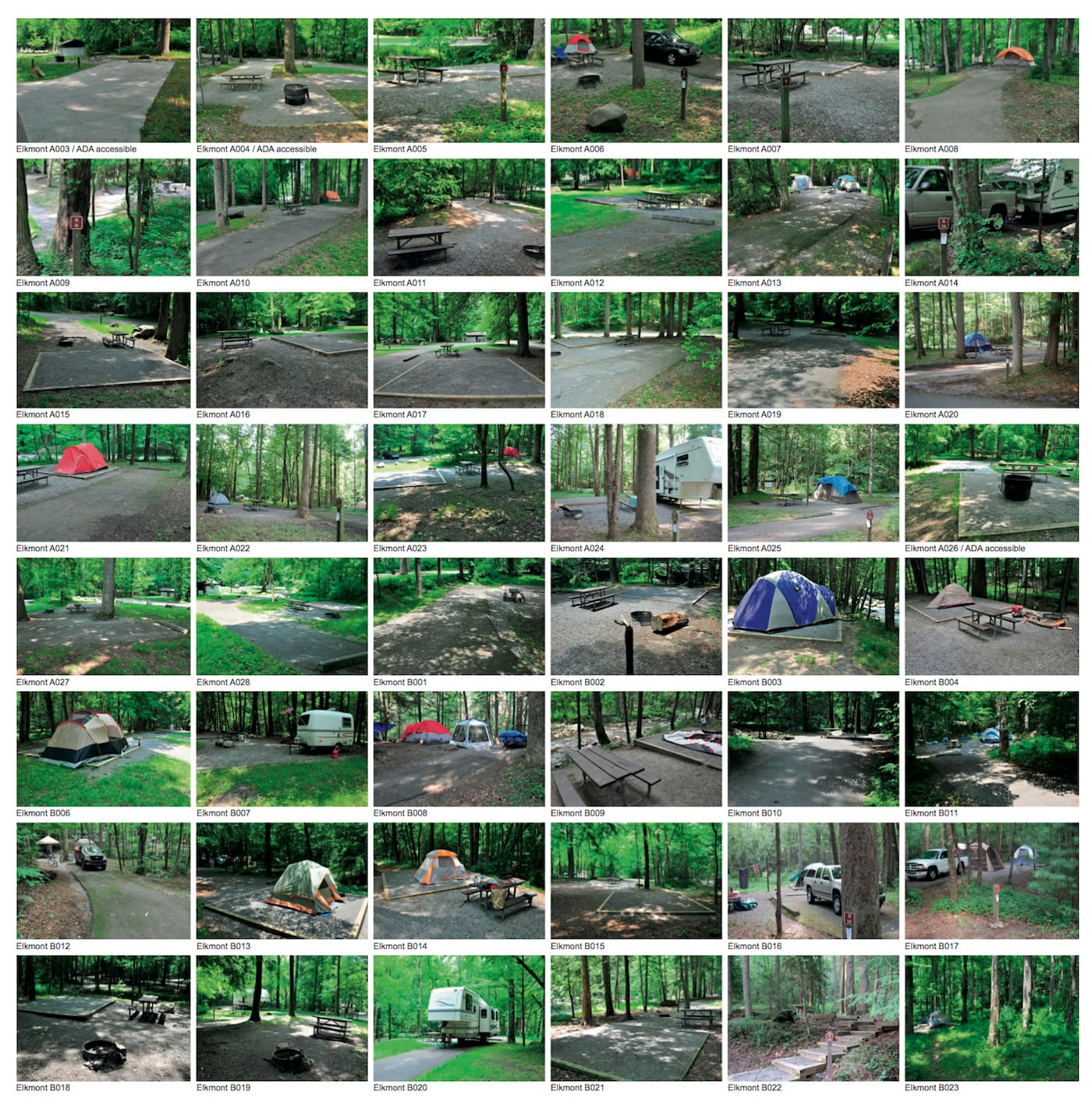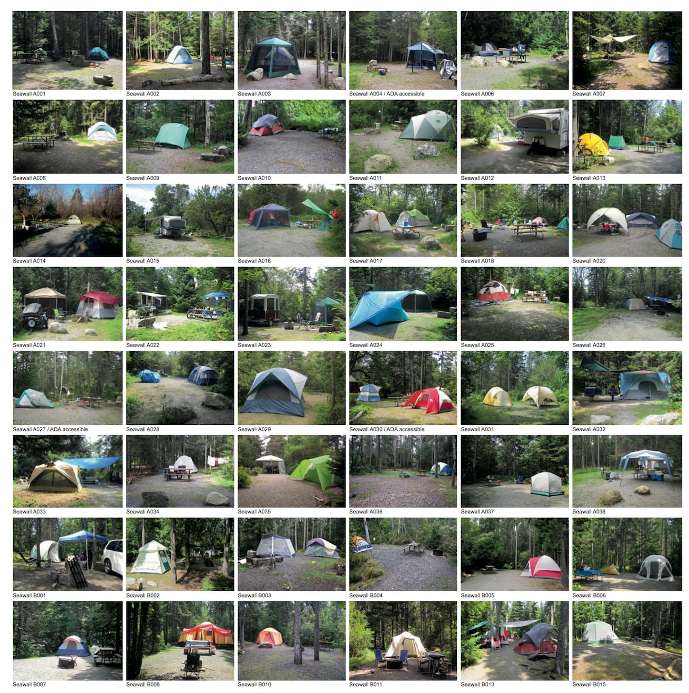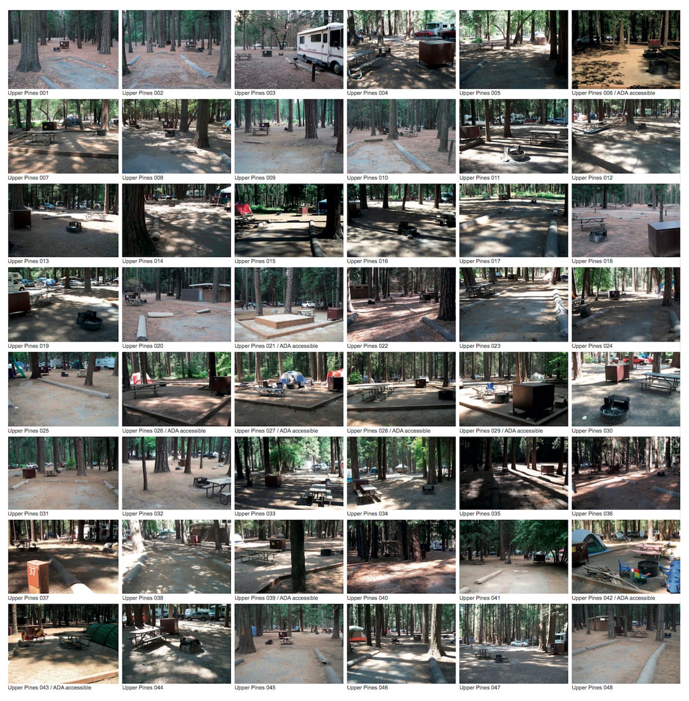 If your summer plans include camping, you may find yourself spending more time preparing online than in the REI store. Rather than scout some isolated vista alongside the hiking trail, most tents in state or national parks are pitched in digitally reserved campsites. The repetitive photographic documentation of these sites, especially in the United States where camping is so rooted in nostalgia, fascinated Martin Hogue, a landscape architecture teacher at the College of Environmental Science and Forestry at the State University of New York. He spent hours combing through nearly 6,500 US campgrounds’ online reservation sites, compiling their photographs in a visual survey. His resulting grids, which consider the campsite as a paradoxical space where consumerism and wilderness collide, are compiled in Thirtyfour Campgrounds, recently released by the MIT Press.