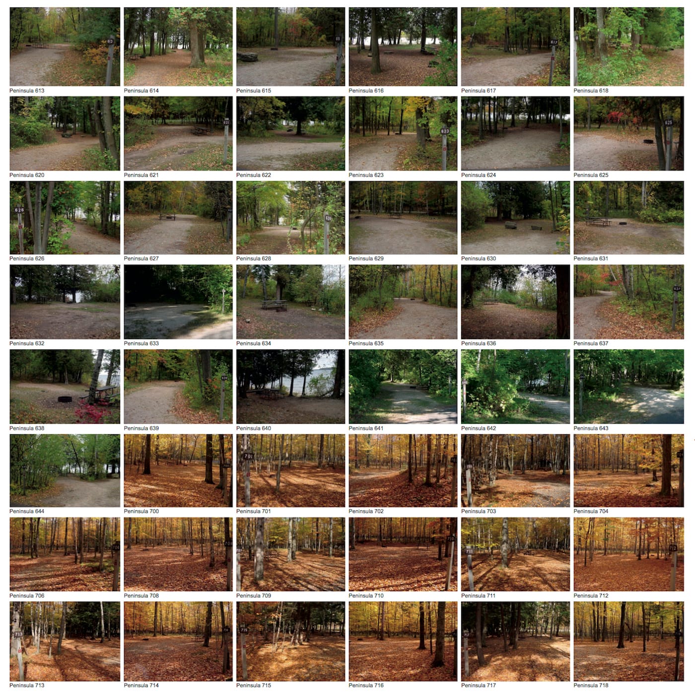 Autumn might suddenly appear through the fallen leaves in one photograph, standing out from the summer scenes around it, while the adjacent “wilderness” is sometimes glimpsed in the mountains and rivers in the background. And there are intriguing distinctions to the locales. National Park Service campgrounds almost always show a populated campsite, such as the tents of varying primary colors pitched among the tall trees at Maine’s Acadia National Park, seeming to suggest something aspirational for the viewer. Meanwhile, the empty and numbered slots awaiting campers at the Mississinewa Lake campground, run by the Indiana Department of Natural Resources, are more of a blank slate.