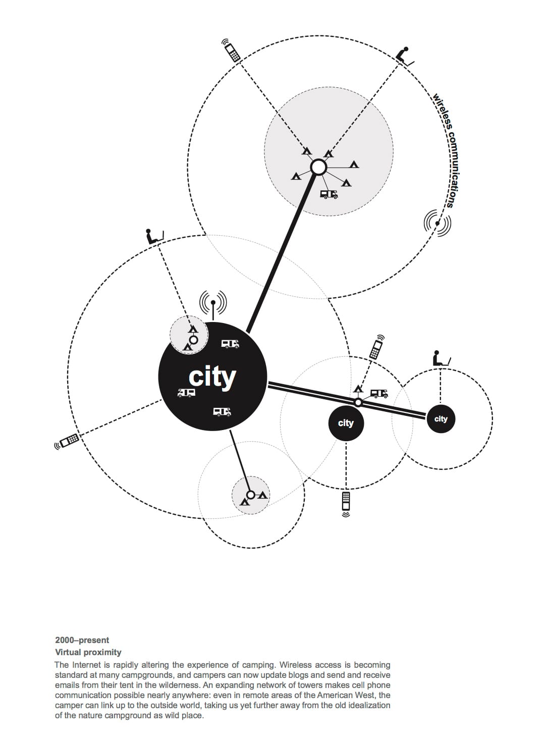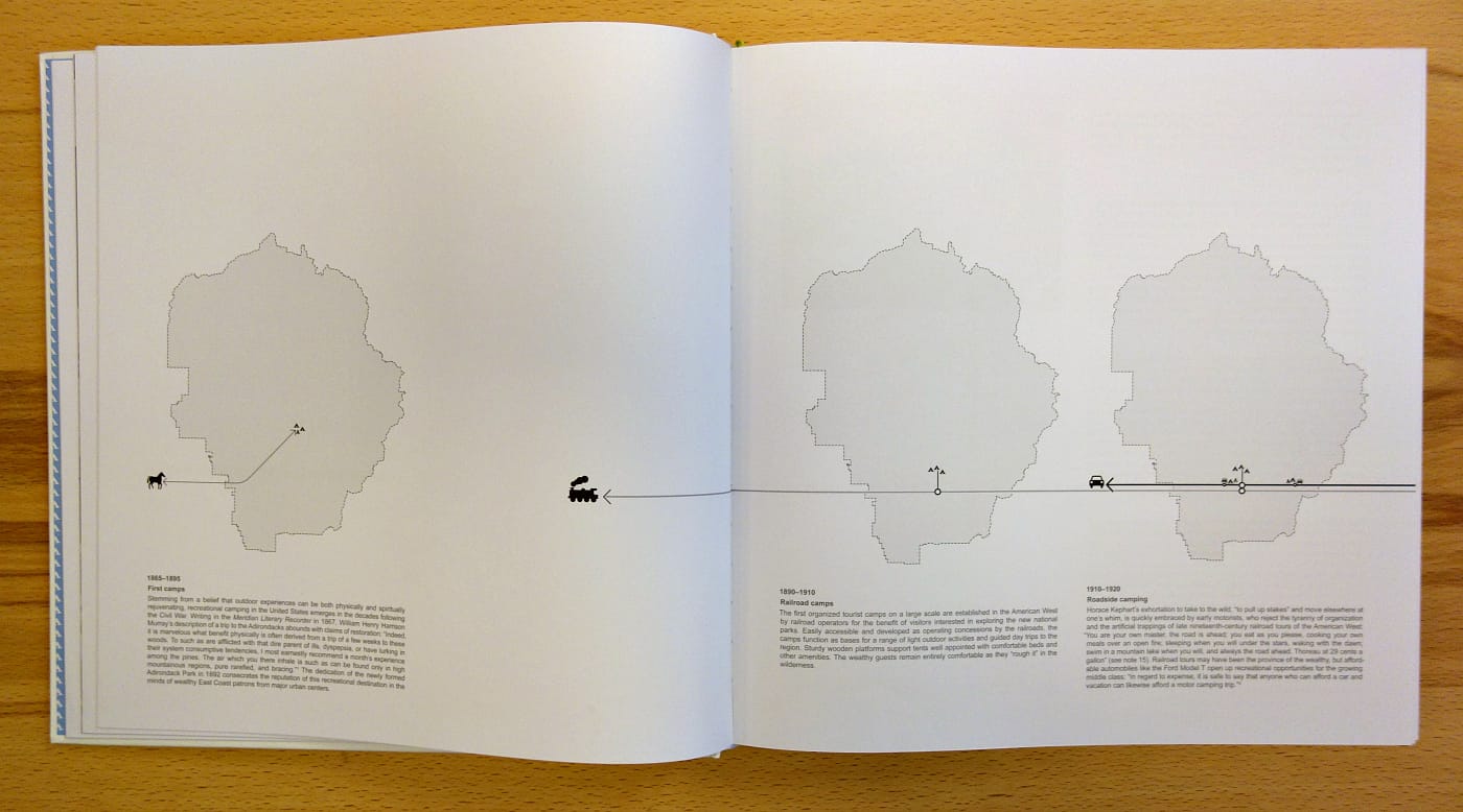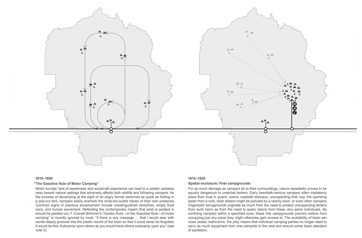 Many of the campsites advertise some comfort of home, even when you are supposedly trying to get away from it all. Early 1900s camping guides encouraged Americans to use their new cars to get healthy air out of the cities, to “escape” from rapidly modernizing life. The images in Thirtyfour Campgrounds, supported by Hogue’s timeline of diagrams, show how we’ve slowly brought that life along with us. Clean restrooms, orderly tables, and, yes, wi-fi, are all available, and Thirtyfour Campgrounds explores how our desire for these amenities in the great outdoors has created a distinct form of landscape to be consumed.