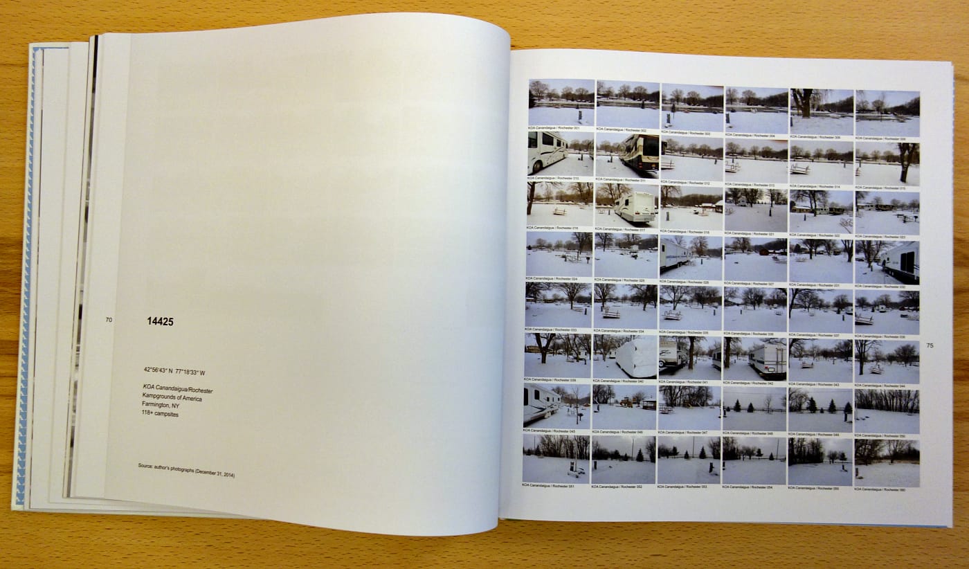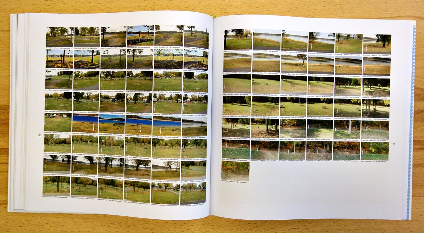 The hardback book — its endpapers decorated with tiny tents and an attached green ribbon playfully suggesting you might want to bookmark a site for your own camping excursion — has the earnestness of an academic text, which Hogue employs to give some humor to his endeavor. He acknowledges that, “Not surprisingly, perhaps, the individual campsite images are more often than not woefully impersonal, low resolution, inert, and dull.” His title references Ed Ruscha’s Thirtyfour Parking Lots, which has aerial photographs of vacant parking lots that celebrate and lampoon the concrete-heavy landscape of Los Angeles. Hogue also mentions the influence of the systematic industrial portraits of water towers and silos by Bernd and Hilla Becher. His typological composites of campsite photographs, all culled from websites like reserveamerica.com and recreation.gov, similarly reveal both the uniformity and subtle individuality of the repeating images.