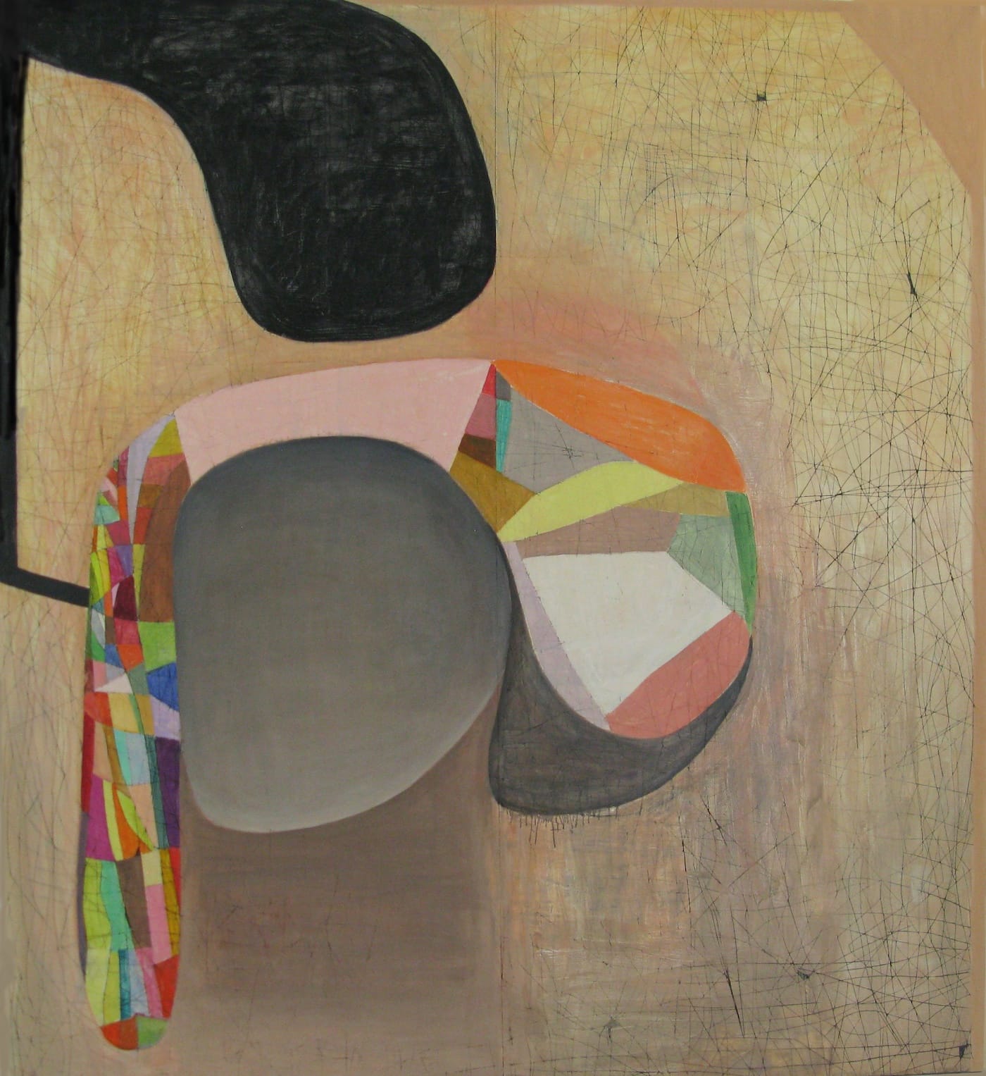 Impending began with the big black shape at the top of the painting. One day, in a conversation about the president, that shape came to me and I said to myself, “That’s Trump!” Working from my unconscious and a surface full of deep scratch marks, shapes emerged and, by the time it was done, an abstracted figure was draping over a big, grayish ball-shape. All this impending doom is hanging over me (all of us) and over this ball filled with warmth, love and tenderness. I desperately need to protect all that is good from Trump.