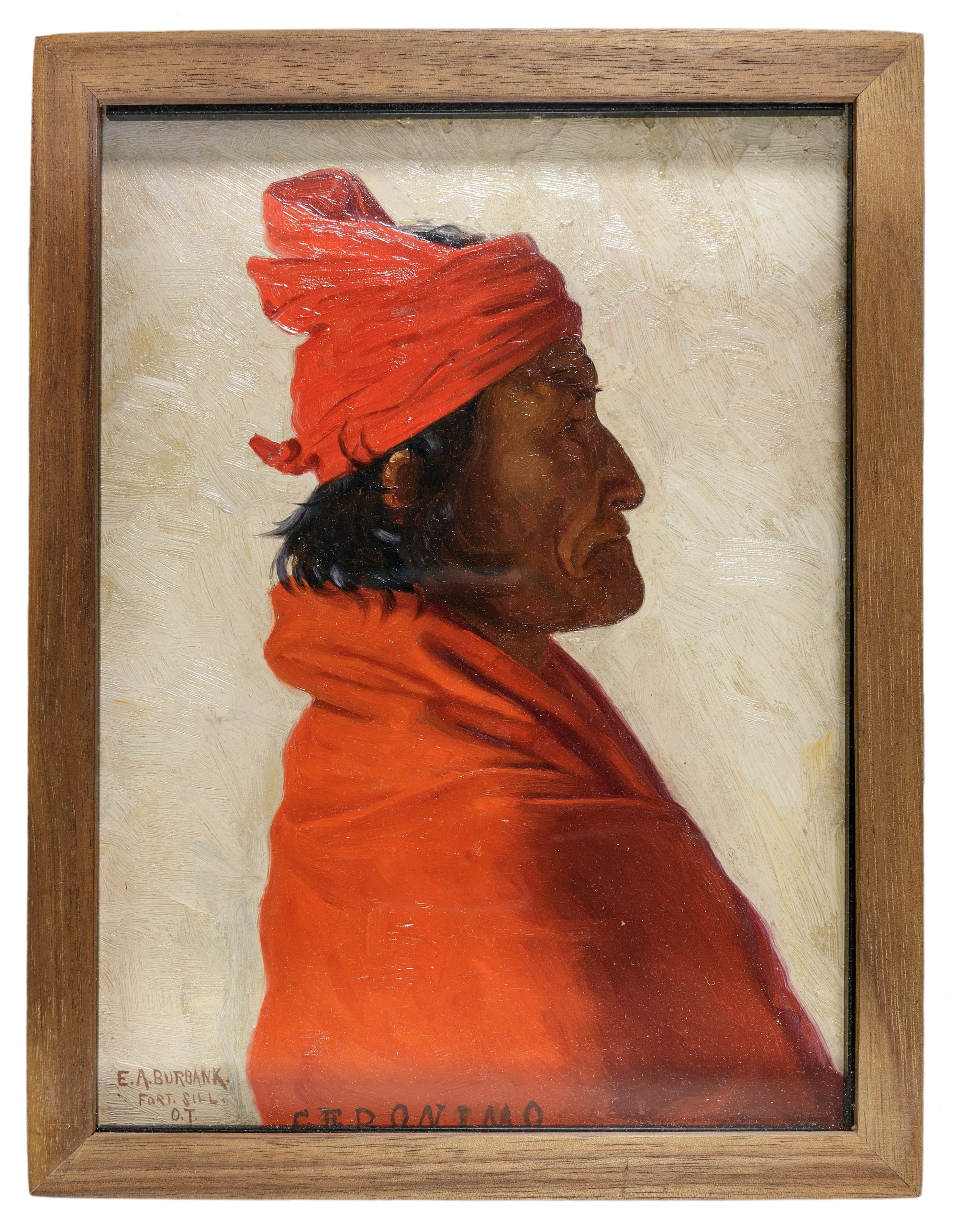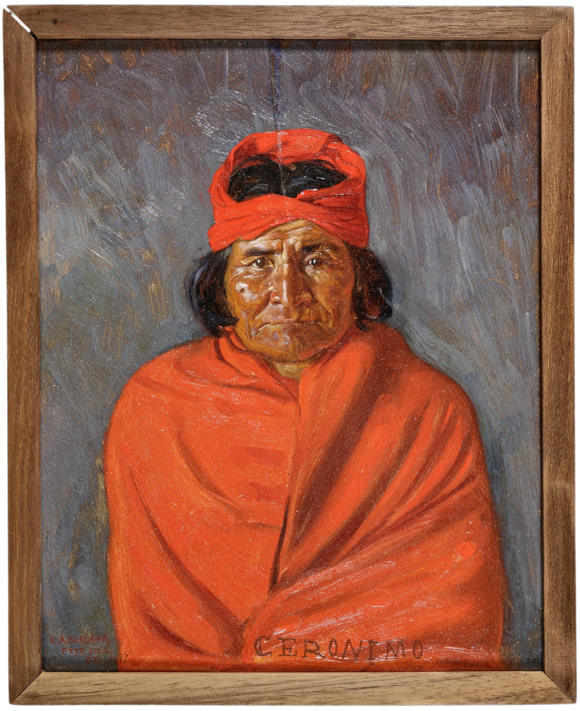 Geronimo faces the viewer wearing a luminous red blanket. The arresting swath of color lingers on the eye, a saturated counterpoint to the gray background and the sitter’s deeply wrinkled face. His dark eyes stare directly at the viewer. He had posed for photographs on numerous occasions, but this was the first time he allowed a painter to capture his likeness. That painter was Elbridge Ayer Burbank. Completed in 1897 at Fort Sill, Indian Territory, it was the first portrait done by Burbank of a series commissioned by his uncle, Edward Everett Ayer, then the director of Chicago’s Field Museum. Geronimo was a prisoner at Fort Sill, having surrendered to the US government along with some 30 Chiricahua Apaches in 1866. The army first sent them to Fort Marion, Florida, where they remained for about a year. The group was then transferred to Fort Sill, which is where Burbank, as he put it, “journeyed in search of [Geronimo] on what was to be the first of twenty years of hunting the real Americans for my canvas.”