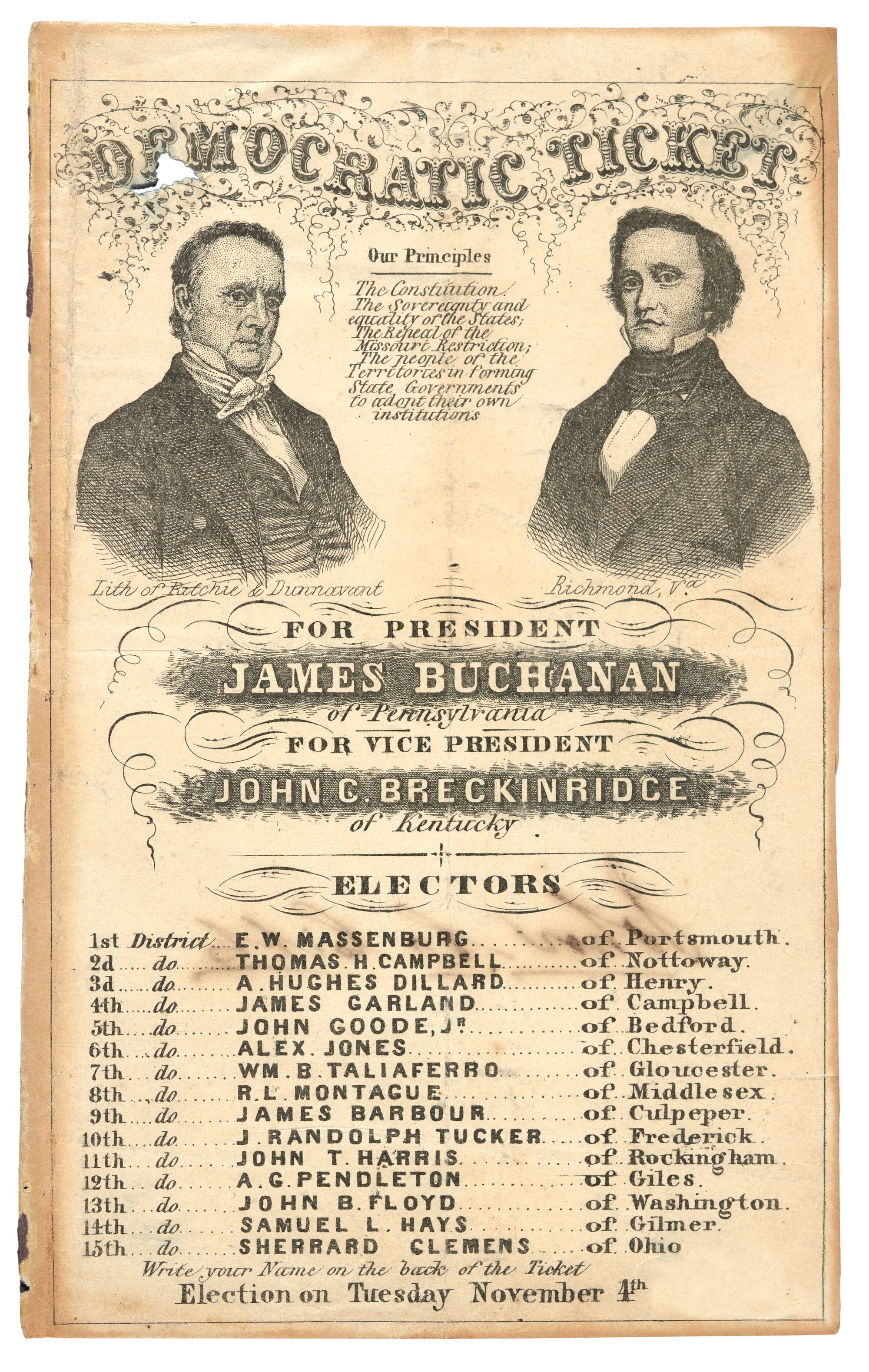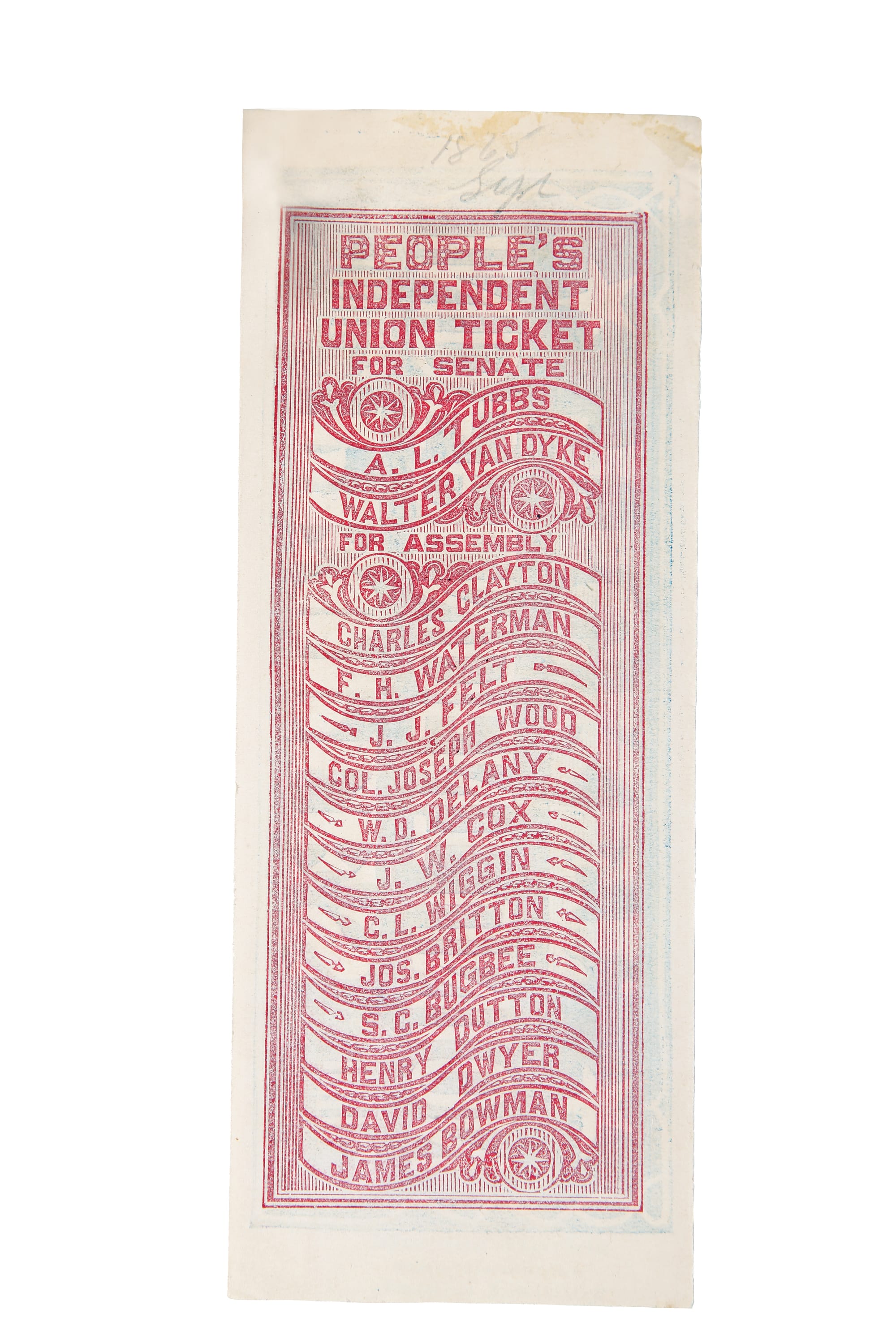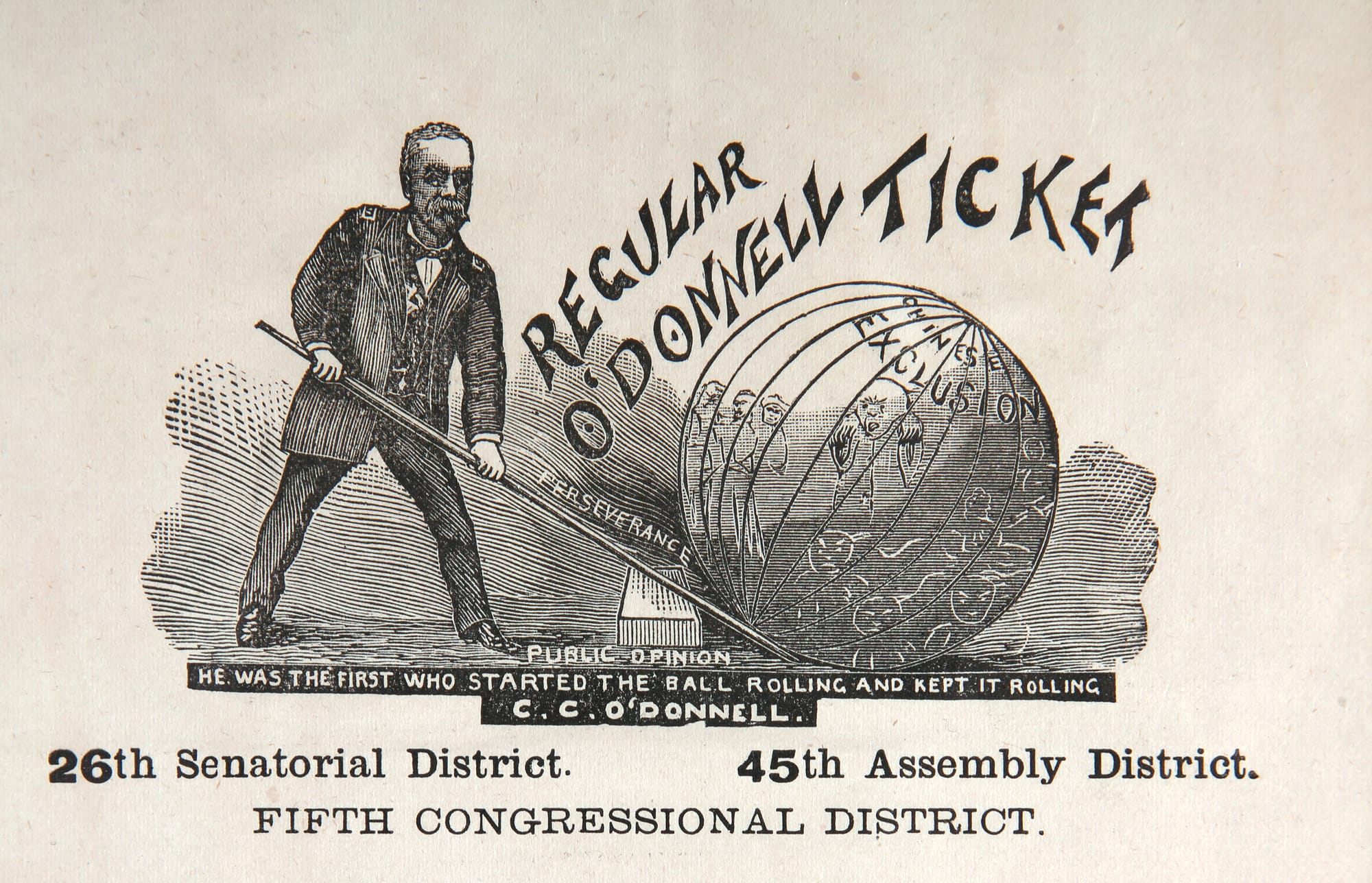 In the early days of the paper ballot, at the start of the 1800s, each municipality had its own requirements, which were not systematically enforced. Early ballots were slips with just one name or handwritten. Voting was an open system, and in some places, party workers solicited voters, handing out “straight party” tickets, which could be put in ballot boxes with no selections made. Cheng found blatantly racist and anti-immigration ballots, such as one in 1876, in San Francisco, where candidate Dr. C. C. O’Donnell pledged to deport all Chinese immigrants within 24 hours of taking office. Cheng describes the lettering used on this ballot as “early Chopsticks.” Printed ballots were required to be destroyed, so these examples shouldn’t really exist at all, Cheng says, quoting one collector who described them as “the most fugitive ephemera.”