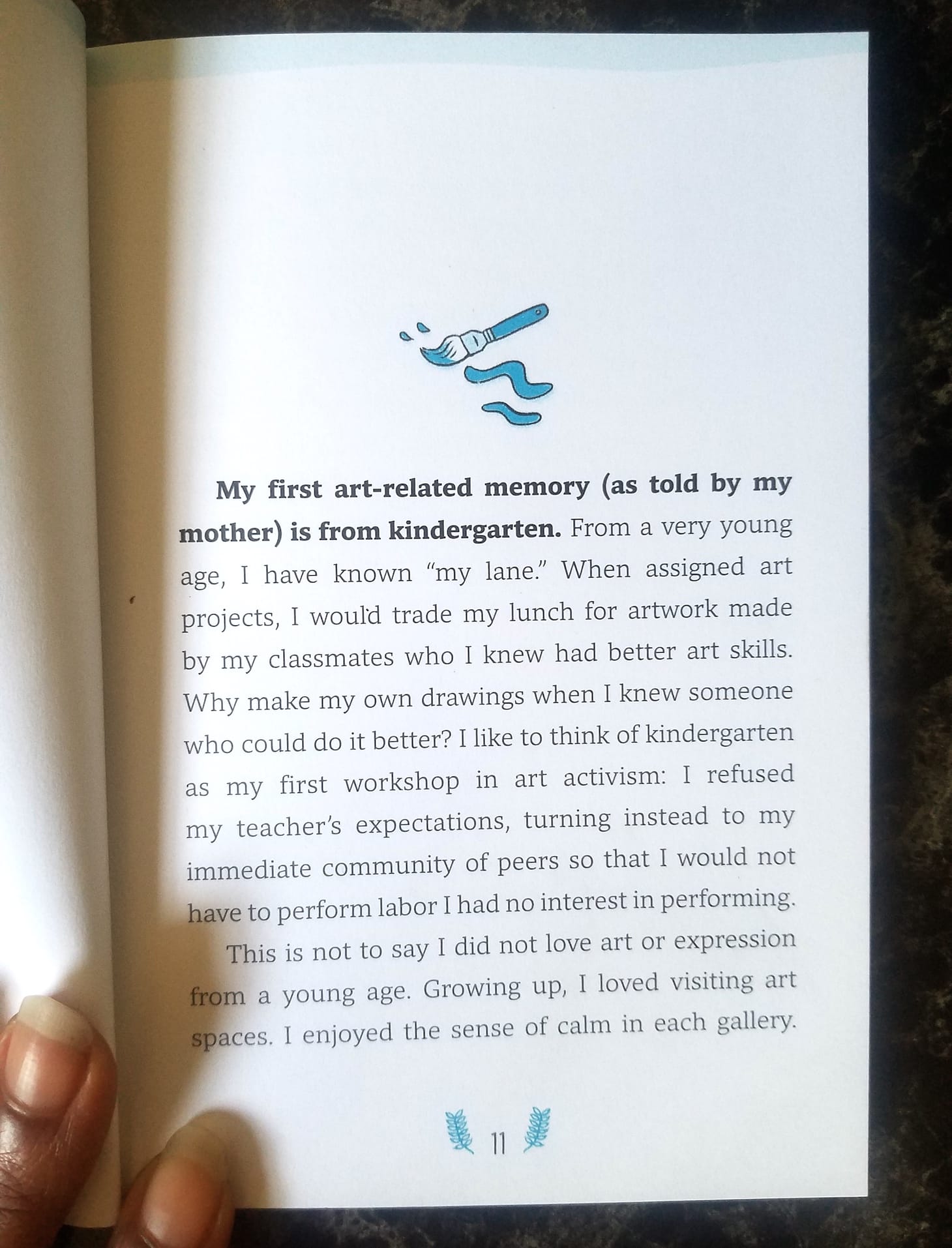 Drew sprints through lessons learned at various institutions: Smith College, Creative Time, the Studio Museum in Harlem, and the Met. A revelatory, paid internship at the Studio Museum introduces her to artists like Jean-Michel Basquiat, Lorna Simpson, and Glenn Ligon — a stark contrast to the whitewashed art history courses she took during her last years at Smith. She challenges that lack through her blog, which became her way “to resist the erasure of Black artists.” A string of post-graduate jobs deepened her commitment to physical accessibility and community accountability. Still, a tension emerged between her vision of what the museum could be and the museum as it is, stubborn and reluctant to change. Drew alchemized her frustration into projects and initiatives meant to disrupt the boundaries imposed by art institutions on cultural production. She turned her own Instagram account into a roving gallery, documenting as many free shows as possible in an effort to demystify the art world to those excluded from its processes. The book is a brief tribute to the limits of institutions, leaving readers to ponder (and hopefully activate) the question: how to transform museums into arbiters of care?