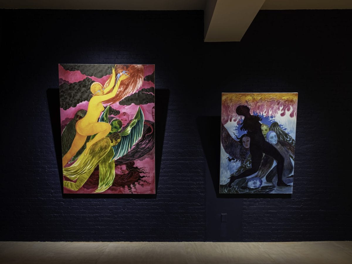 Naudline Pierre’s whimsical paintings also call upon a womanist tradition. Drenched in electric hues, Pierre’s paintings present Black femme nude bodies embracing, defending, and fondling each other amid mystical landscapes. The artist renders these figures with the opulence found in Western religious painting: floating with feathered wings, they watch from above like guardian angels. Dense crowns of hair tumble regally, recalling sheets of gold, and protecting their power. Using her own body as prototype, Pierre masquerades as protector and provider in tender scenes of queer affection.
