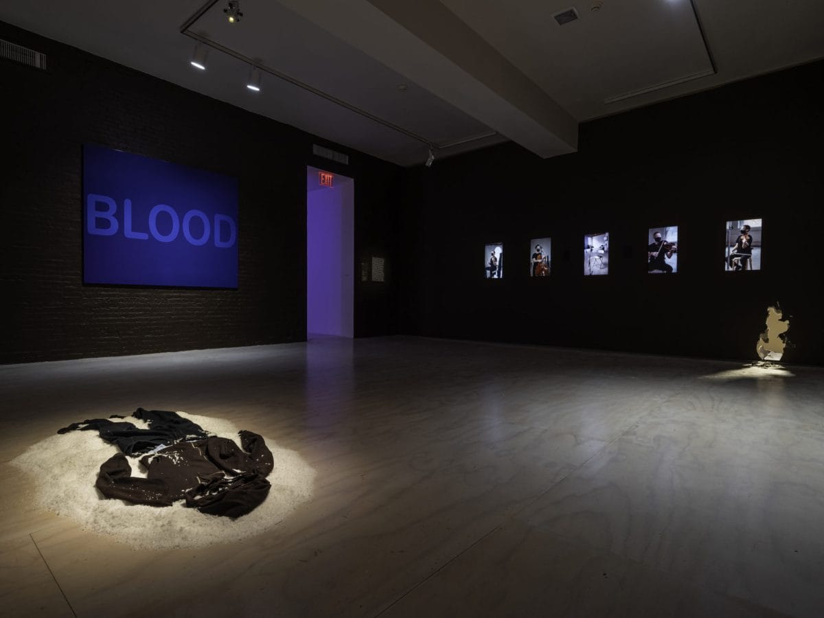 Meanwhile, performance artist Elliot Reed uses his body to process the carnivorous desires of others. “Supernumerary” (2020), bores through gallery walls painted the color of Reed’s skin tone — a work itself titled “Hue” (2020) — via five 32-inch monitors. We watch the artist direct a live string quartet as he reads his essay, “In An Attempt To,” which narrates his investigation of the murders committed by Ed Buck, an affluent white man known to drug young Black gay men to the point of unconsciousness and stage fantasy scenes in his apartment with their bodies. Reed often interrupts his reading with guttural howling and gurgling, while the quartet interprets these tormentous outcries. In concert, the discord is an embodied response, exposing histories of hunger and lust for Black flesh.
