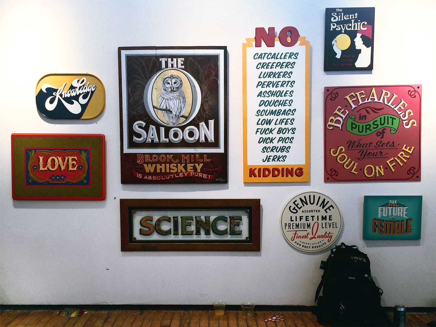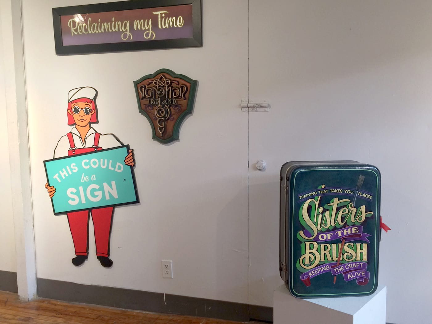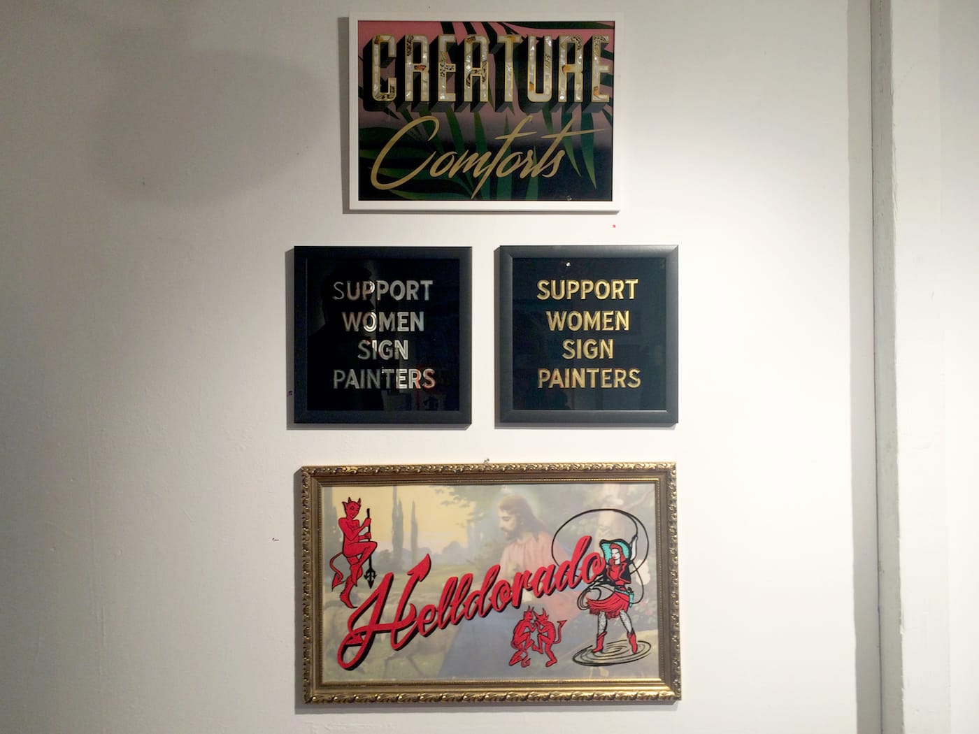 Feminist messages or not, these works all assert a woman’s rightful place in the sign-painting business. Aside from being part of a male-dominated trade, women sign painters are often in a male-dominated space. During a panel last weekend, many of the artists mentioned that they are almost always the sole woman on a team working on a commission.