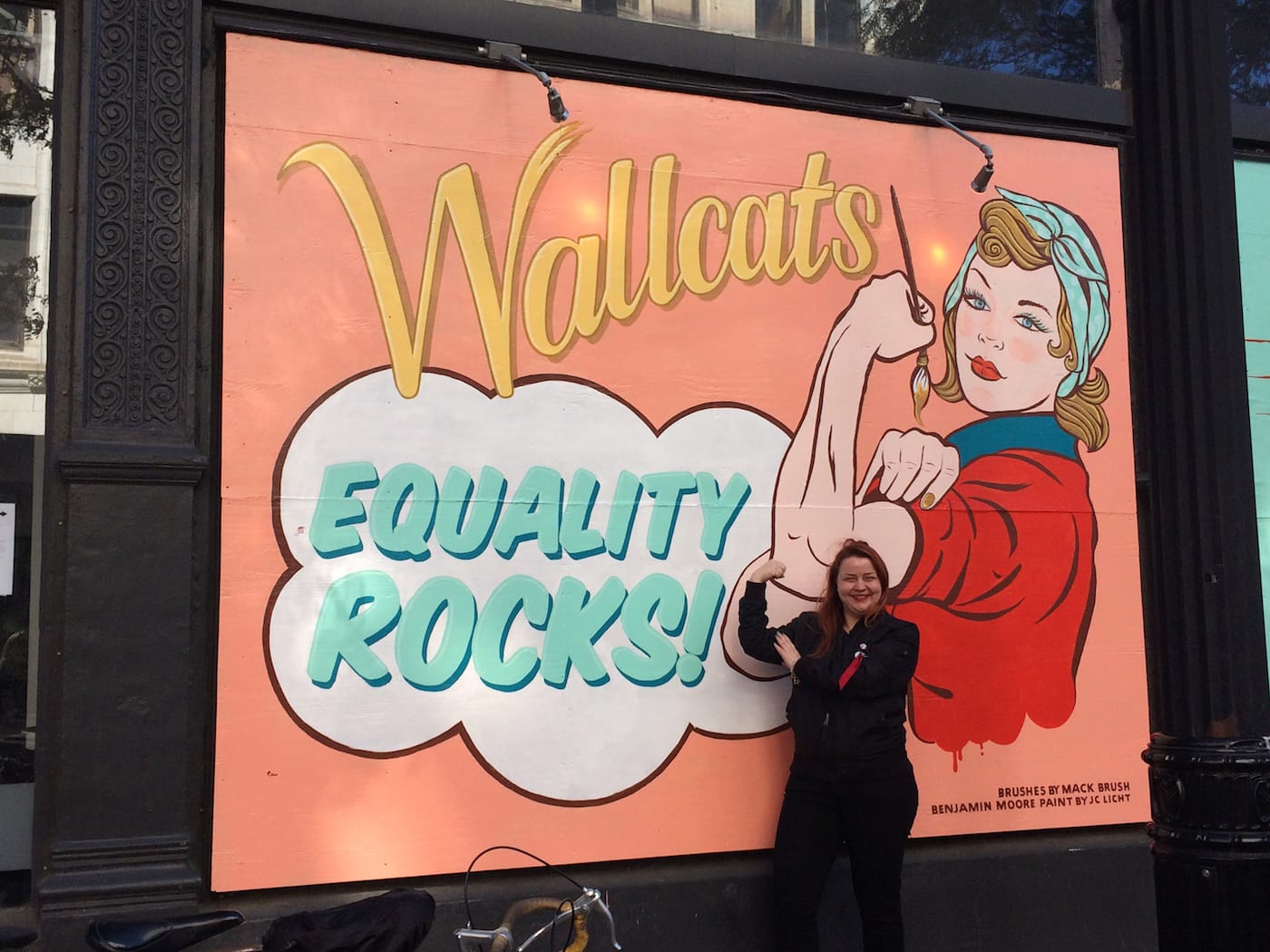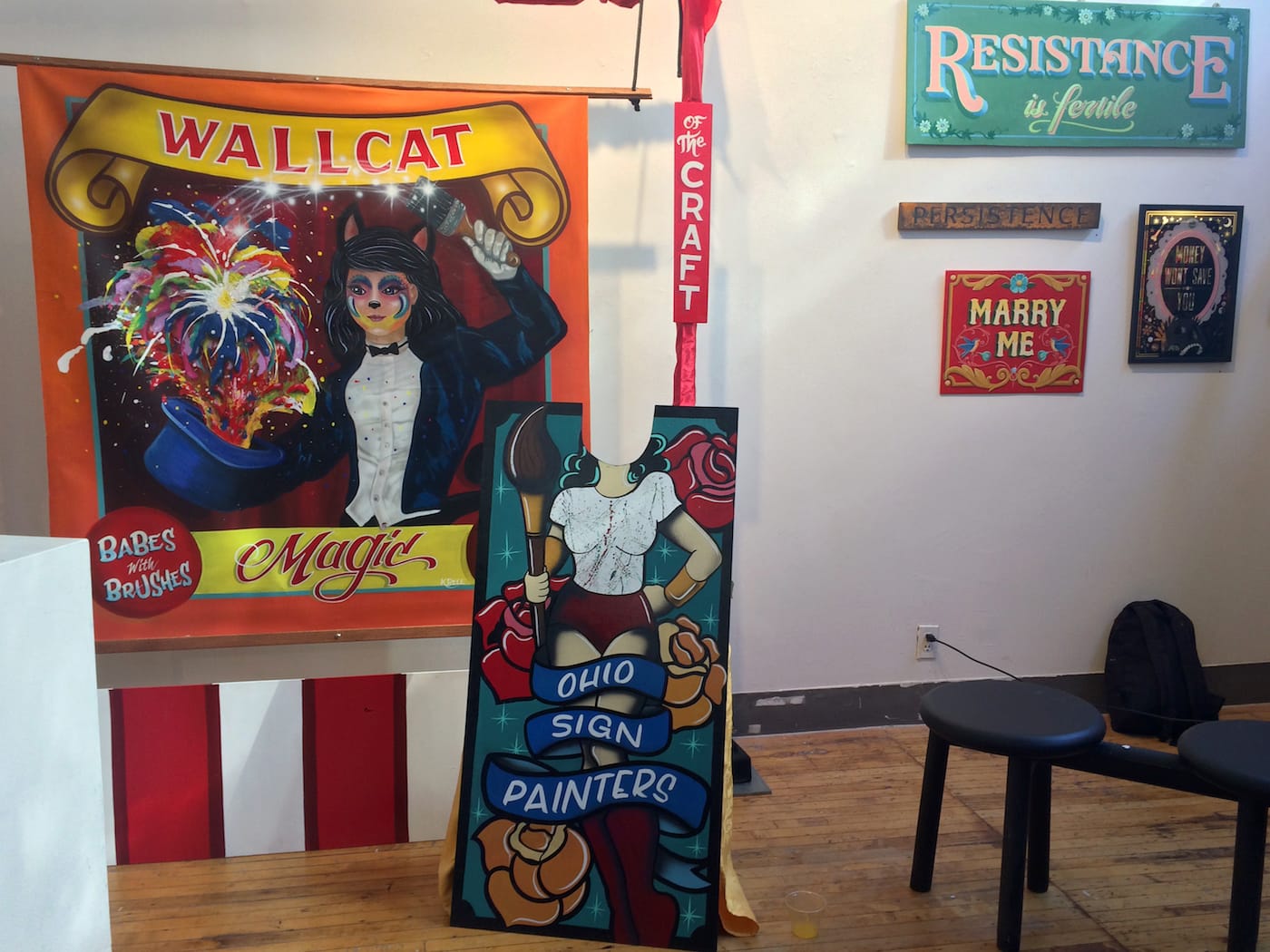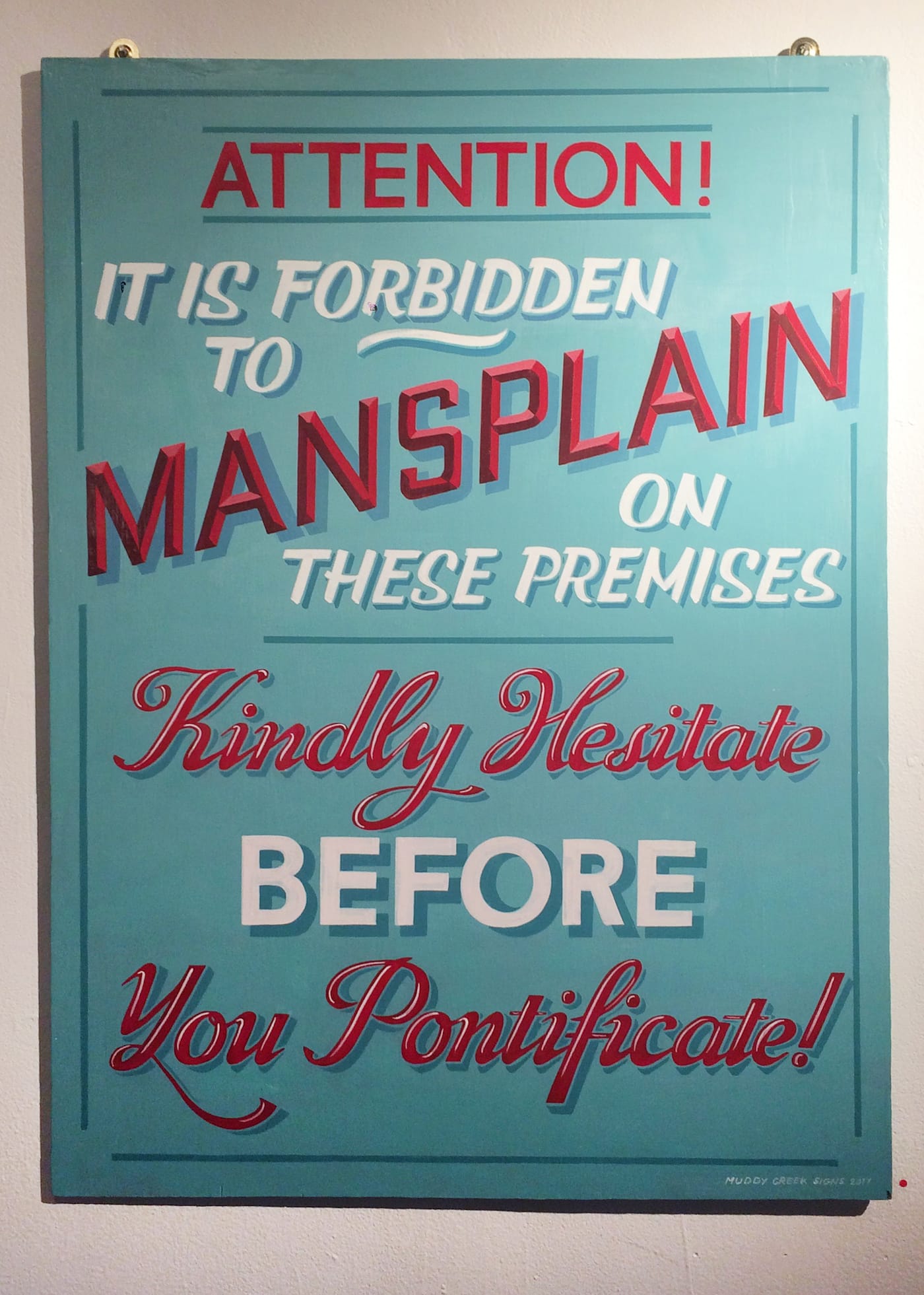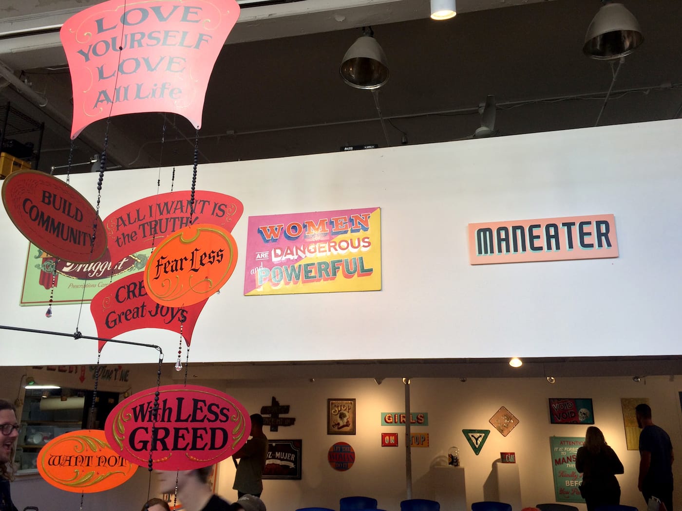 Feminist messages or not, these works all assert a woman’s rightful place in the sign-painting business. Aside from being part of a male-dominated trade, women sign painters are often in a male-dominated space. During a panel last weekend, many of the artists mentioned that they are almost always the sole woman on a team working on a commission.