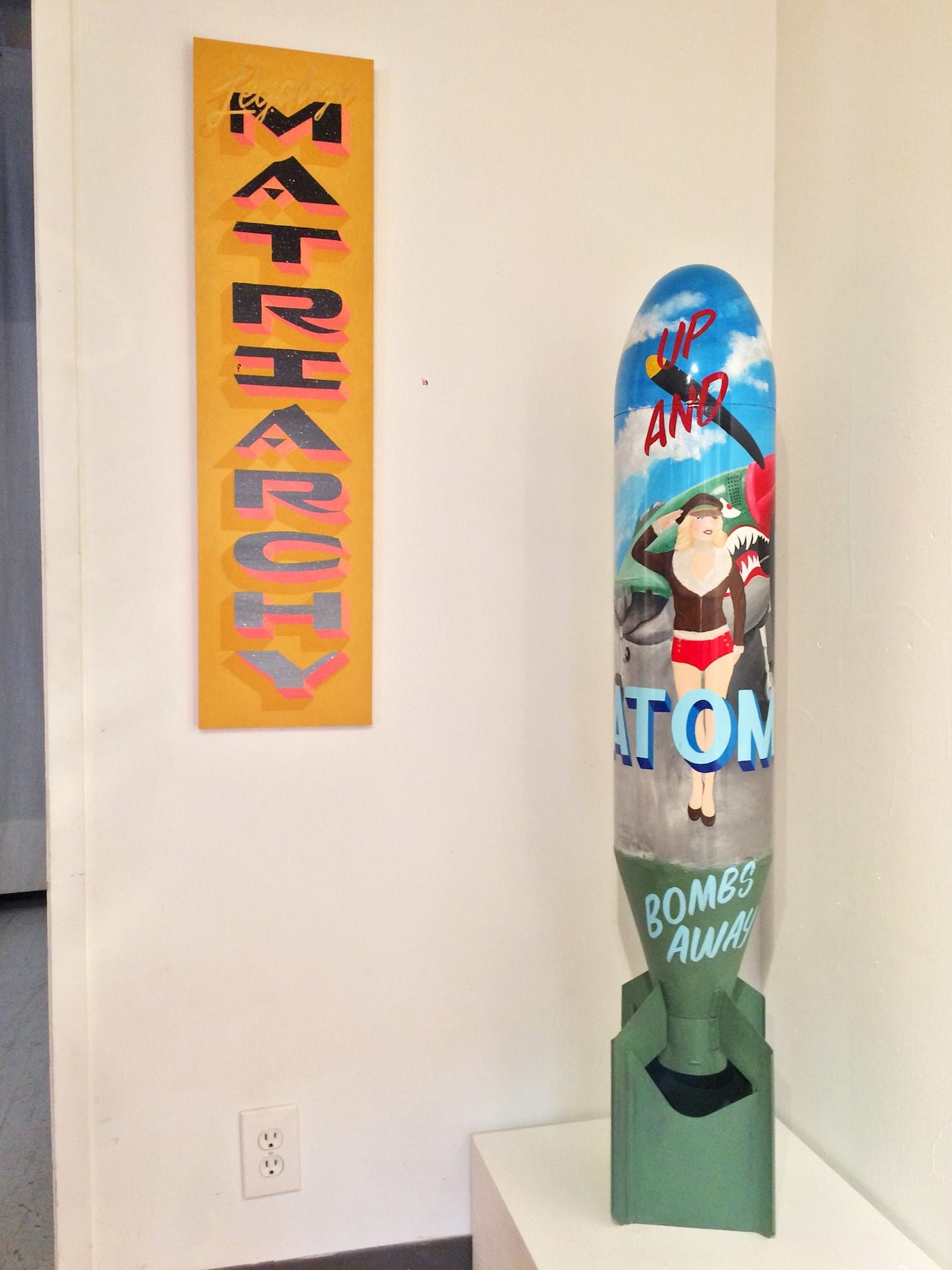 Signs in all forms are to be found here: aside from conventional wall pieces, there’s a condom machine that Marissa Cianciulli painted with a cheeky message as well as a massive mobile by Remedios Rapoport comprised of multiple signs. The Portland-based artist’s slow-turning structure dangles demands like “Vote” and “Make Love, Use Birth Control” over your head, revealing new messages every few seconds. And beyond the gallery space, three dynamic murals by Rodeffer, Tone Emblemsvåg, and Anna Frederick announce the show to passersby.