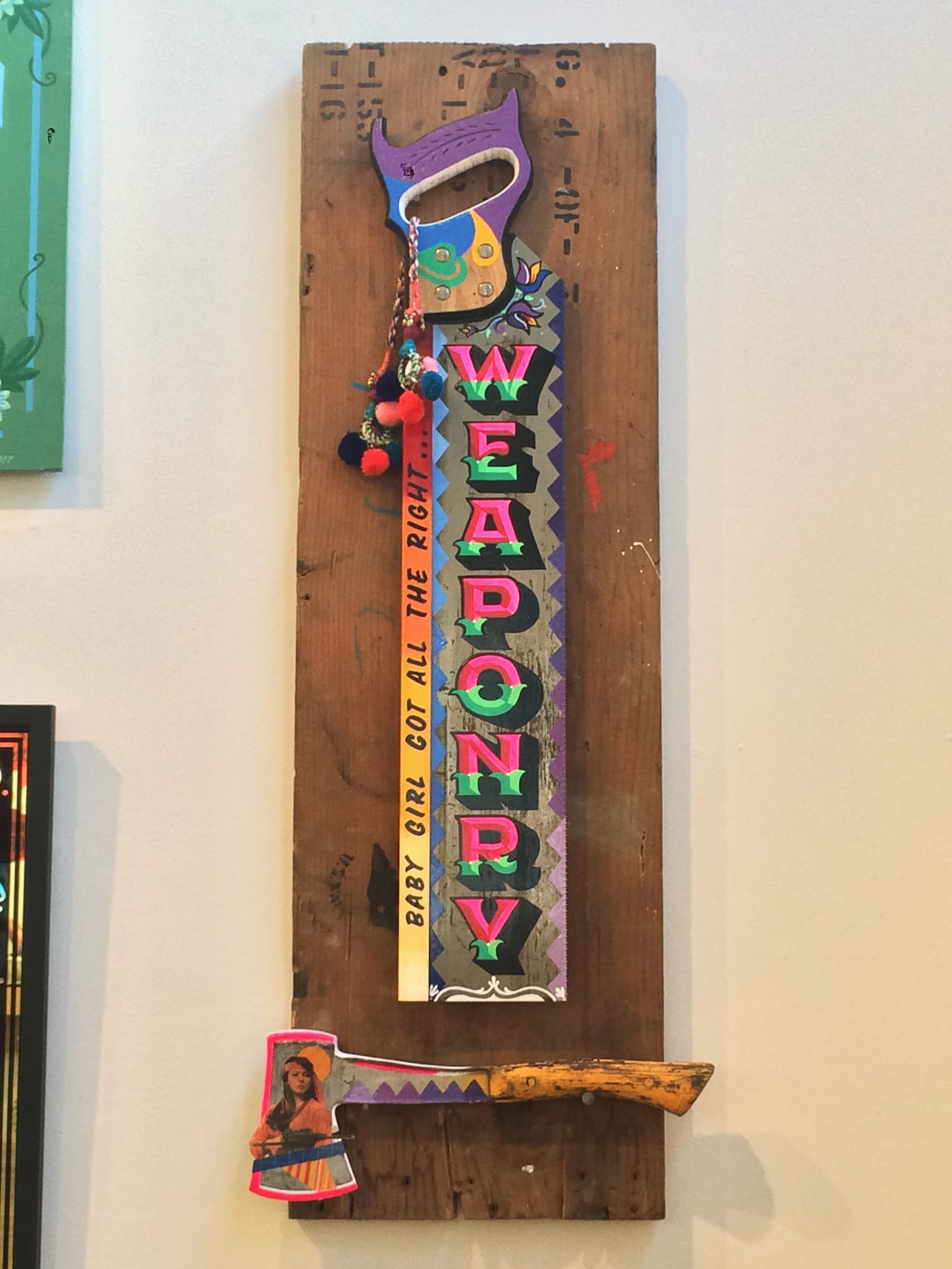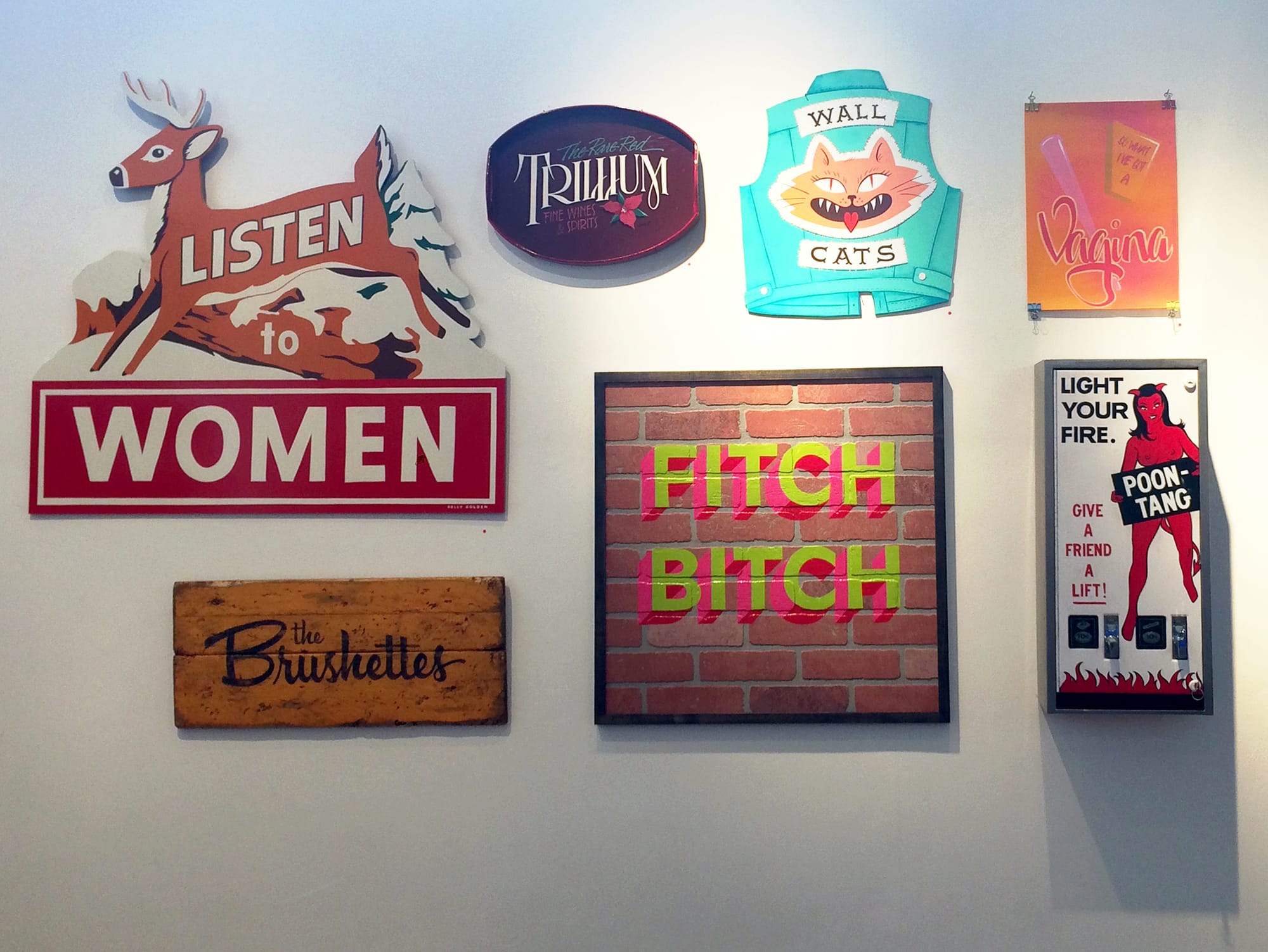 As you might expect, most of the signs on view assert female power and women’s rights, from a springing deer by Kelly Golden emblazoned with the demand, “Listen to Women” to the many visualizations of phrases popularized in the Trump era — a “Stay Nasty” sign by Brooklyn-based design firm Dirty Bandits; “The Future is Female” by California painter Ashley Fundora“; and the Audre Lorde-inspired “Women are Dangerous and Powerful” by Rachel Millar, who hails from Glasgow. Still others are apolitical, including Debra Styer‘s sign for an optometrist store and a beautiful gold leaf-embellished glass sign by Sarah Linkus that simply celebrates waffles.