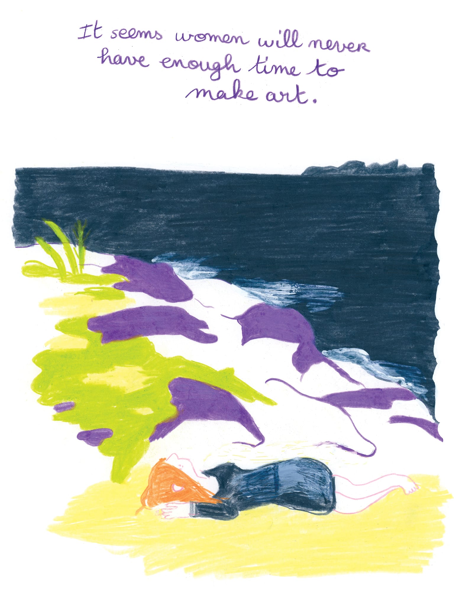 This Woman’s Work gets a charge about two thirds of the way through, when Delporte’s sadness is finally transmuted into anger. She writes about the gender pay gap (though without noting that this gap is especially wide for female artists of color). She rages against the gap in studio time between female and male visual artists. She starts to look forward to aging, after being inspired by the vital work Jansson made in her 60s.