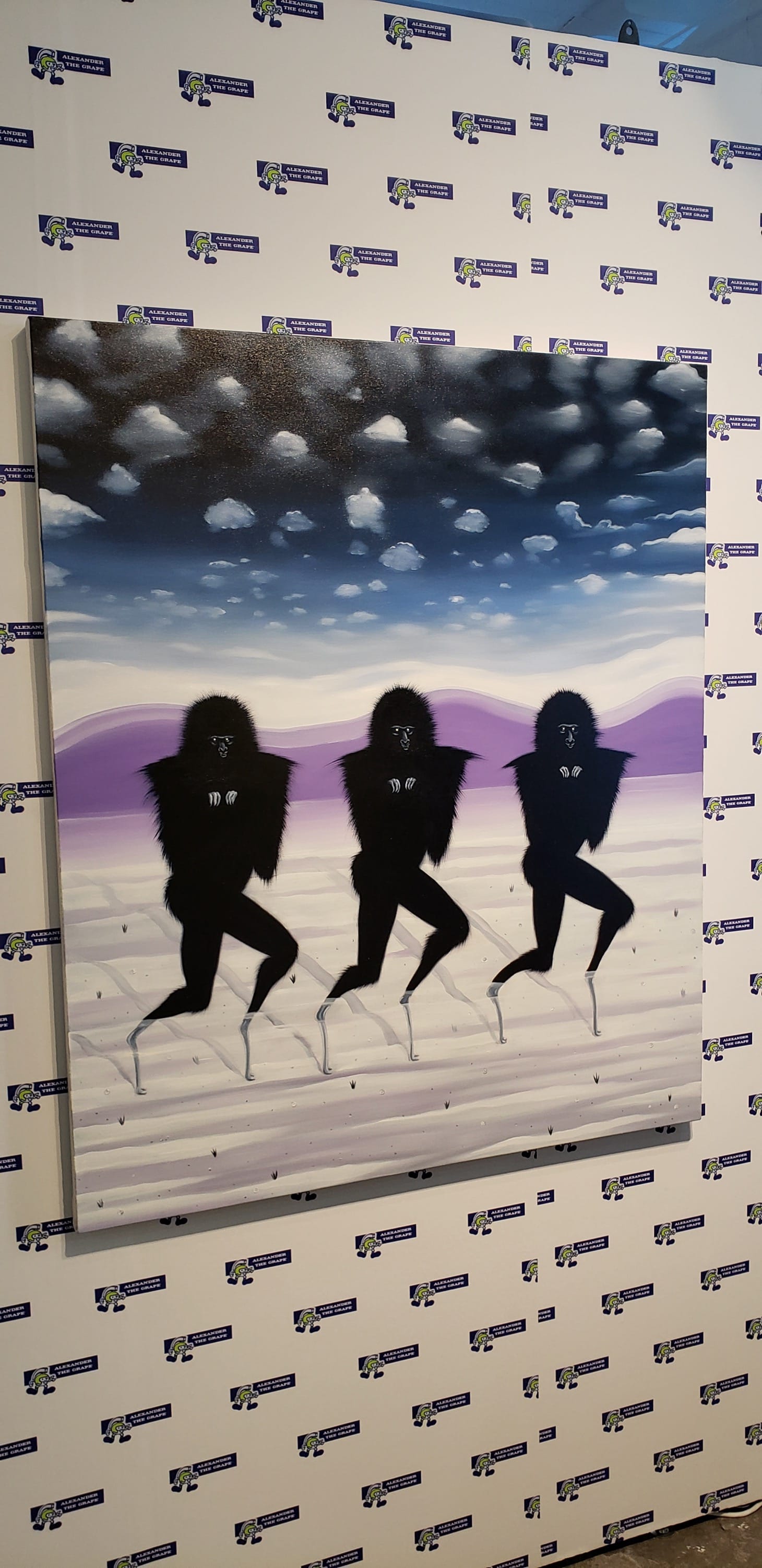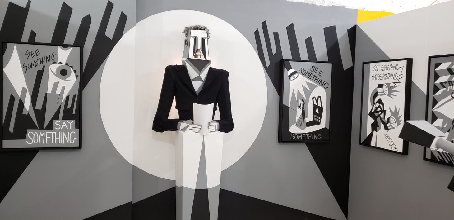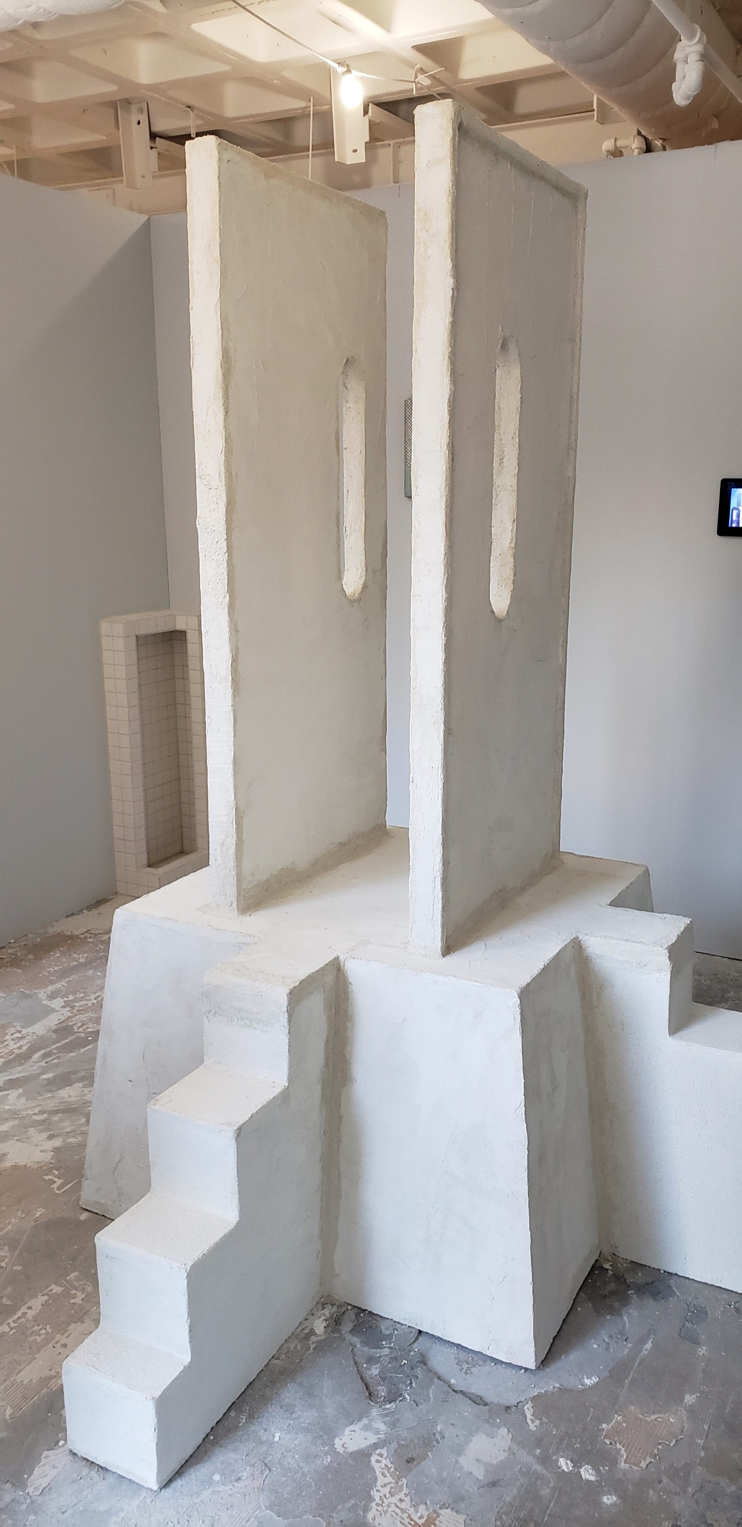 I very much liked the idea behind Nadine Faraj’s installation for Anna Zorina gallery. Her paintings are mounted in a cave-like grotto to give the feel of one of those ancient underground tunnels, like those at Lascaux, although here the images are of sexy and sexualized male and female forms, in some instances mere impressions and at others wholly realized bodies. One has to see it with a flashlight borrowed from the attendant standing outside. Another fully realized experience was Empty City, an exhibition of Stella Zhong’s work, curated by Wai Ying Zhao, which contains what look like whitewashed concrete structures, like monuments we might develop in the future. Unhee Park exhibited a booth (curated by Suechung Koh and Katelin Kim) mostly comprised of images she had found on the internet and then blew up to room size, mounted on cardboard, so that the cat, fireplace, and armoire within seem to float between two and three dimensions. The depths of the room are extended by the images that are wall size, but this illusion is also broken by the images’ white grid lines, resembling tiles. James Moore’s apocalyptic “Chernobyl Wall / Neon with Cement Pedestal” (2019), part of Elektra KB’s installation “The Politics of Healing, Destroying Silence” (2019), curated by Nico Roxe and Valeria Castro, features a wall that is left barely standing after being shelled by artillery. But this might as easily be the backdrop of a Berlin nightclub, with its accoutrement of neon fencing.