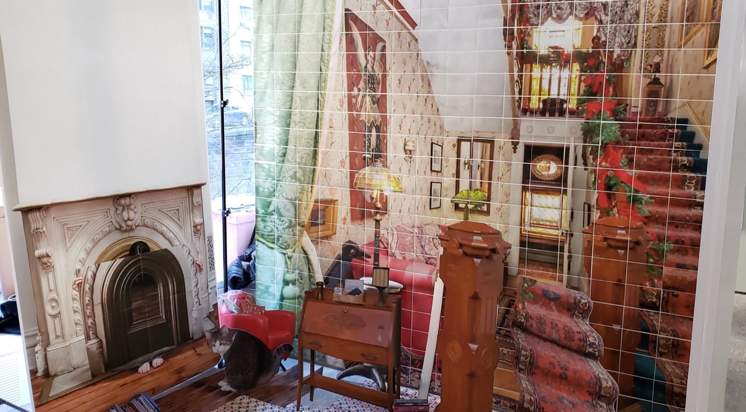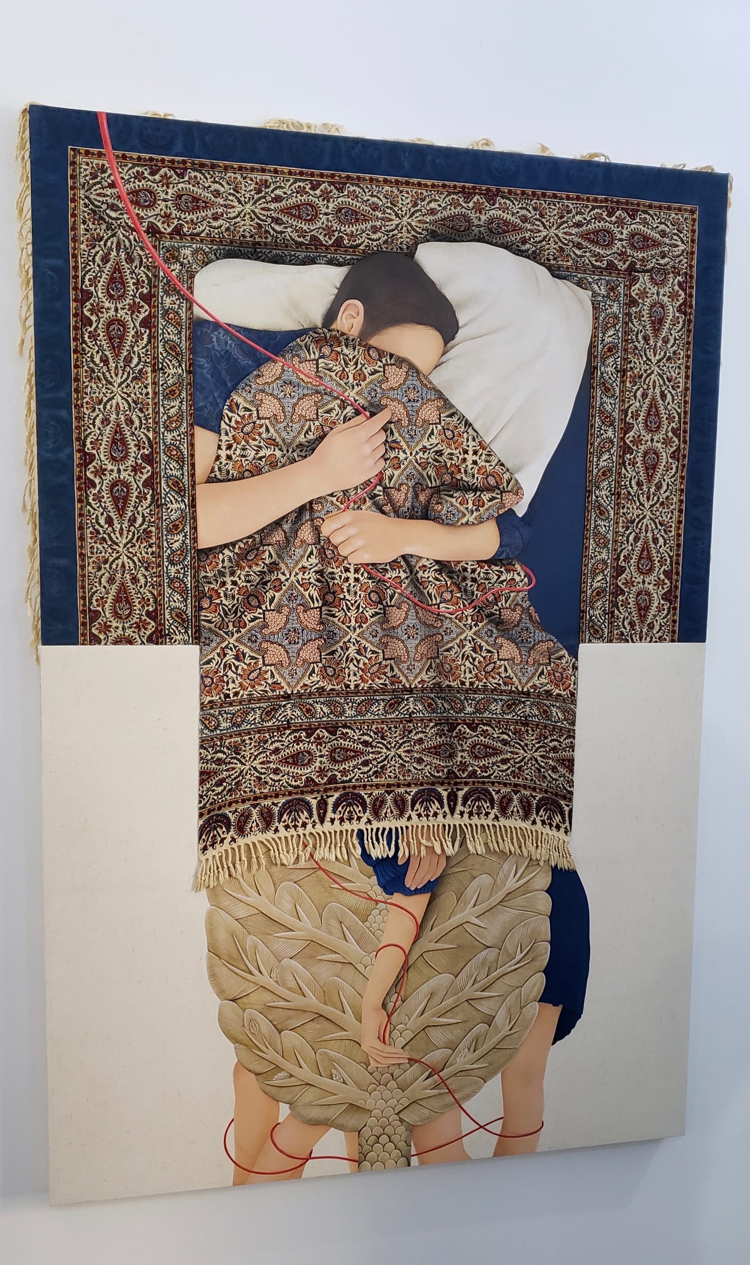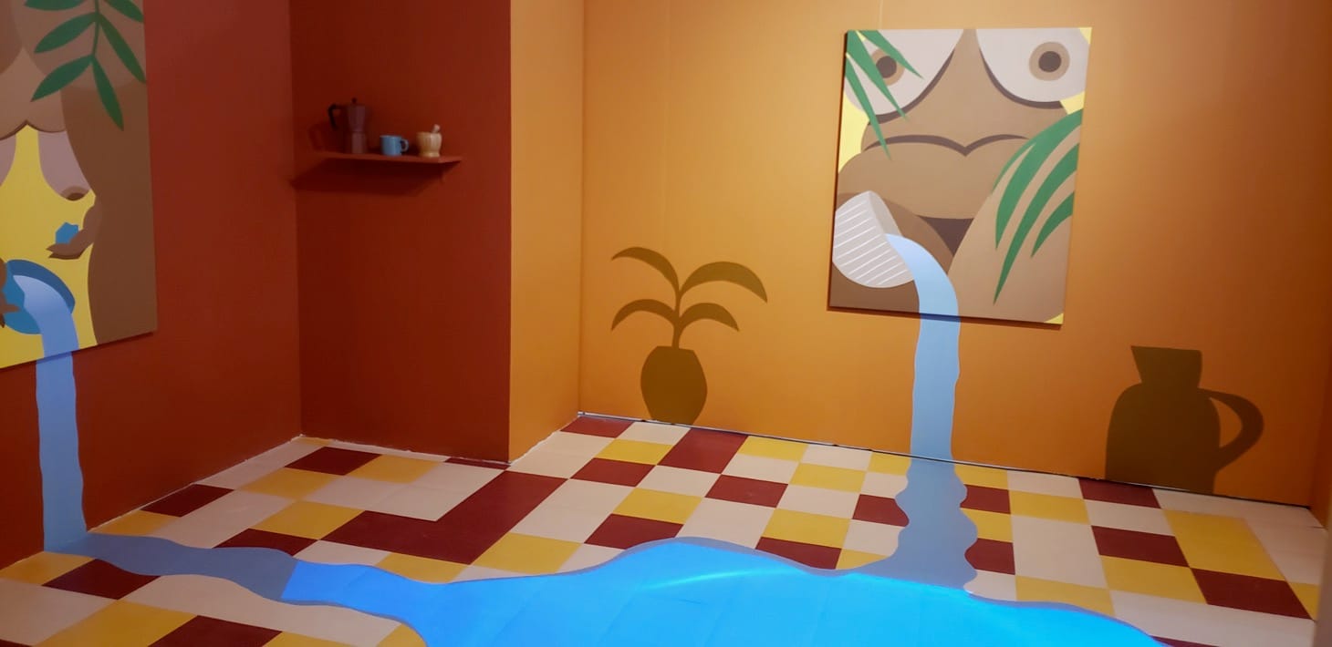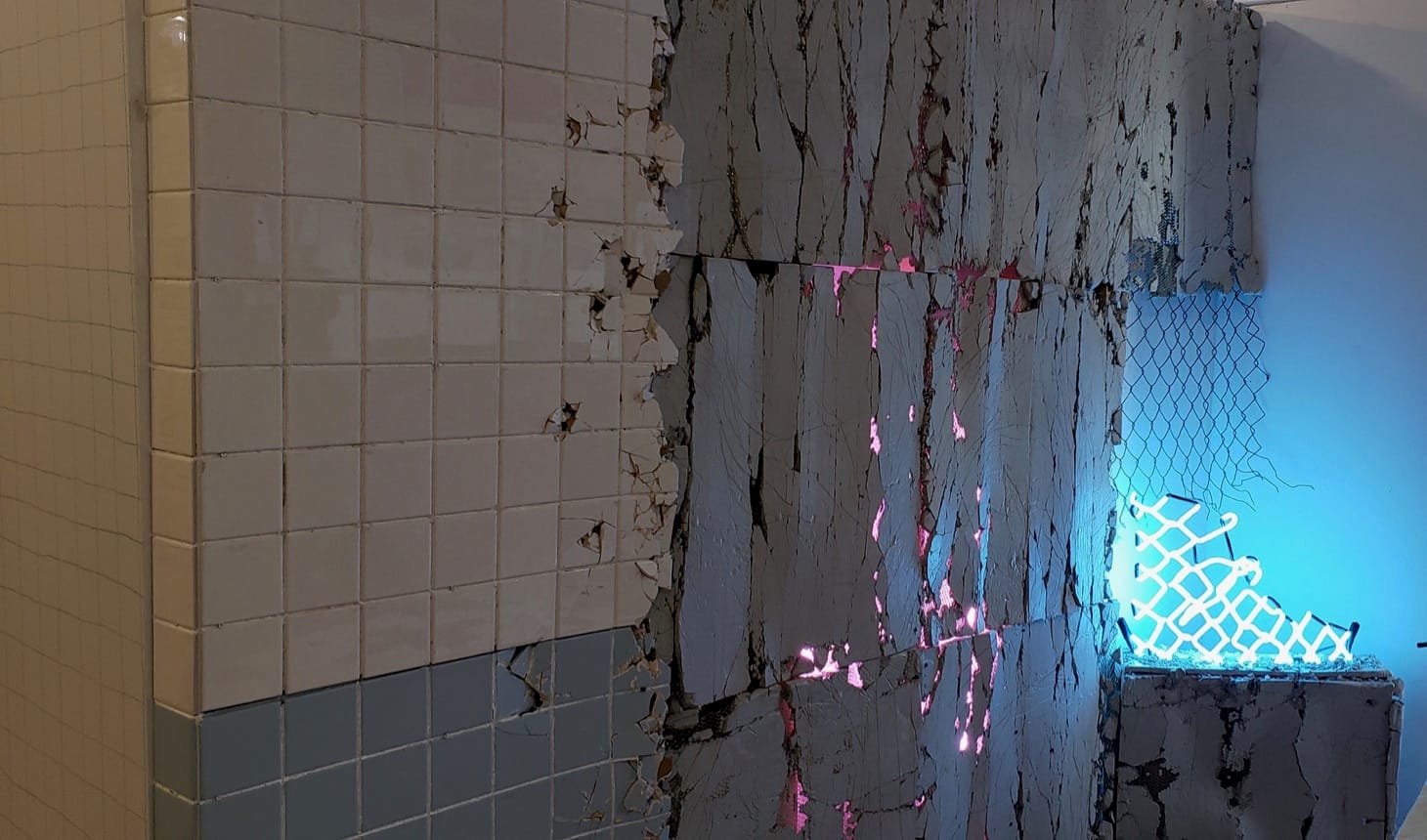 I very much liked the idea behind Nadine Faraj’s installation for Anna Zorina gallery. Her paintings are mounted in a cave-like grotto to give the feel of one of those ancient underground tunnels, like those at Lascaux, although here the images are of sexy and sexualized male and female forms, in some instances mere impressions and at others wholly realized bodies. One has to see it with a flashlight borrowed from the attendant standing outside. Another fully realized experience was Empty City, an exhibition of Stella Zhong’s work, curated by Wai Ying Zhao, which contains what look like whitewashed concrete structures, like monuments we might develop in the future. Unhee Park exhibited a booth (curated by Suechung Koh and Katelin Kim) mostly comprised of images she had found on the internet and then blew up to room size, mounted on cardboard, so that the cat, fireplace, and armoire within seem to float between two and three dimensions. The depths of the room are extended by the images that are wall size, but this illusion is also broken by the images’ white grid lines, resembling tiles. James Moore’s apocalyptic “Chernobyl Wall / Neon with Cement Pedestal” (2019), part of Elektra KB’s installation “The Politics of Healing, Destroying Silence” (2019), curated by Nico Roxe and Valeria Castro, features a wall that is left barely standing after being shelled by artillery. But this might as easily be the backdrop of a Berlin nightclub, with its accoutrement of neon fencing.