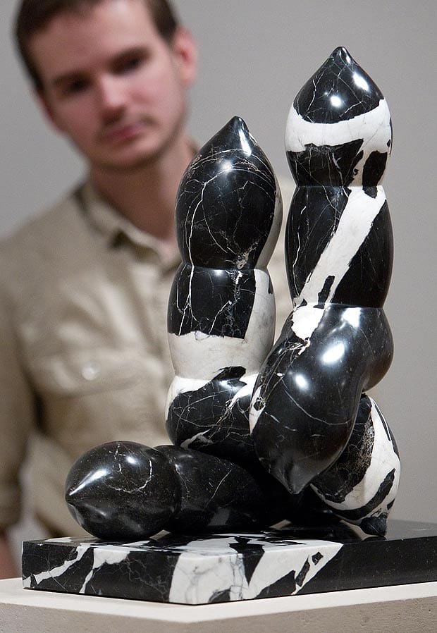 The strong pick for winner, artist Paul Noble is known chiefly as a master draughtsman. With just a pencil, Noble creates vast landscapes on paper that depict Nobson Newtown, a fictional world populated by what might be unkindly called turds. The anthropomorphized turds get up to all kinds of mischief — several sculptures featured in the Turner Prize exhibition show them in sexual couplings. Far from disturbing, these polished abstractions made from black and white stone are sensual and dramatic.