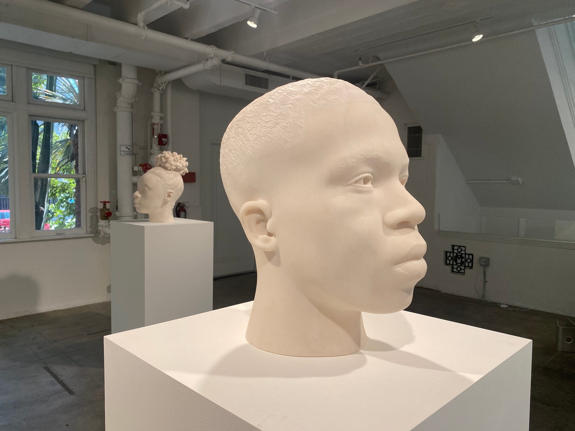 The works are based on amalgamations of 3D scans of real people — like large language models (LLMs), they are constructions based on reality. And while they occupy the most space, they’re accompanied by pink marble busts of heads, made in Italy. The busts are placed on white plinths, and as I circled each one, I started asking myself why my primary image of busts is based on Western European hair textures and facial features. In the back of the gallery is the first one Price ever exhibited publicly, which can fit in the palm of a hand.