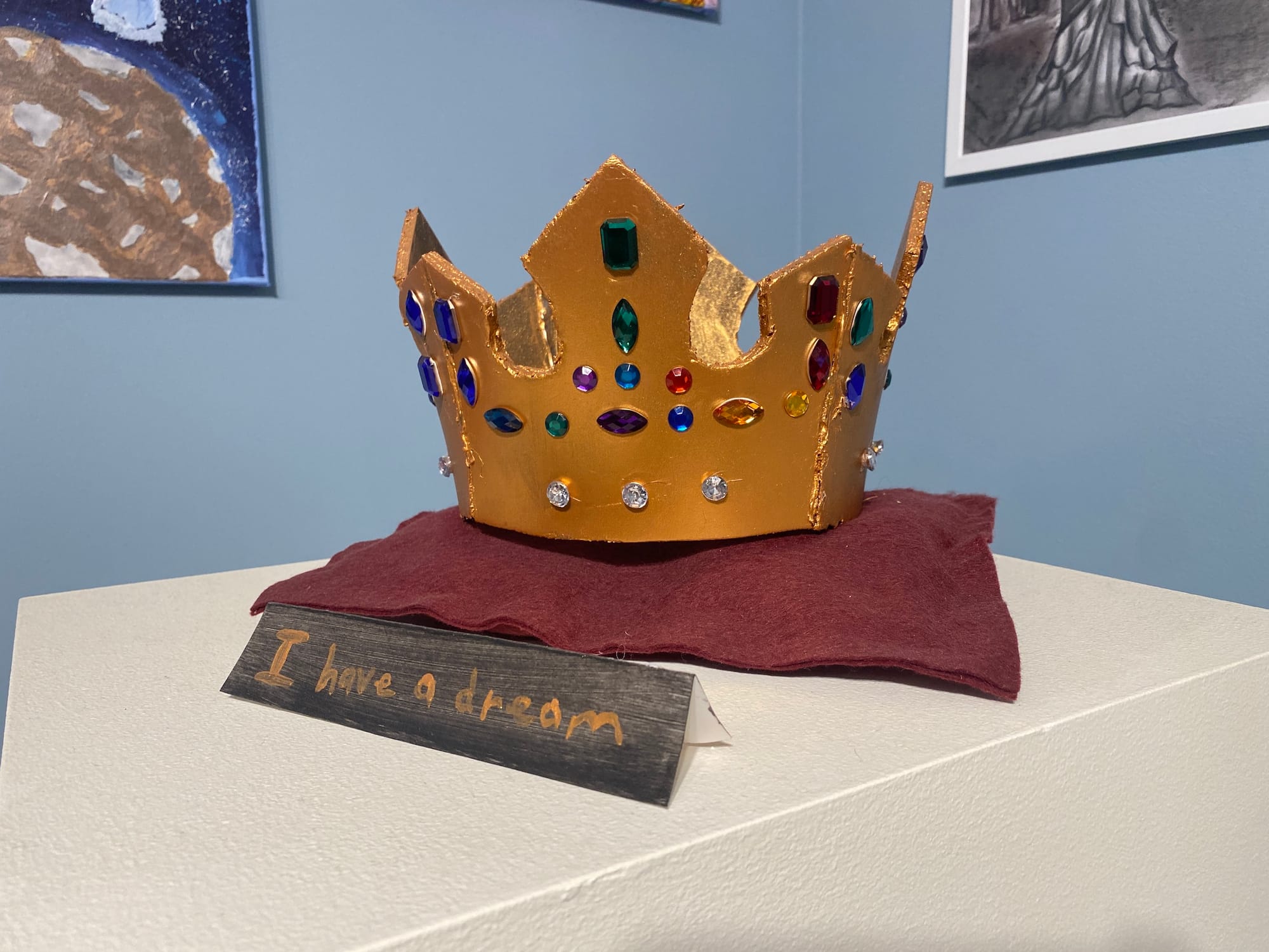 On a tour with students at the gallery, Price discussed the installation of this piece, which rests alone on a shelf on an otherwise empty wall: “It’s a small object on a big wall. You know when things are important, they often get a lot of space.” It’s titled “Mixed Feelings About Bus Drivers,” inspired by the fact that passengers on buses in London can only see drivers’ heads, as they operate the vehicle in a small cab. It’s also a celebration of bus drivers, considered essential workers during the COVID-19 pandemic lockdown but now largely ignored in much of our public discourse.