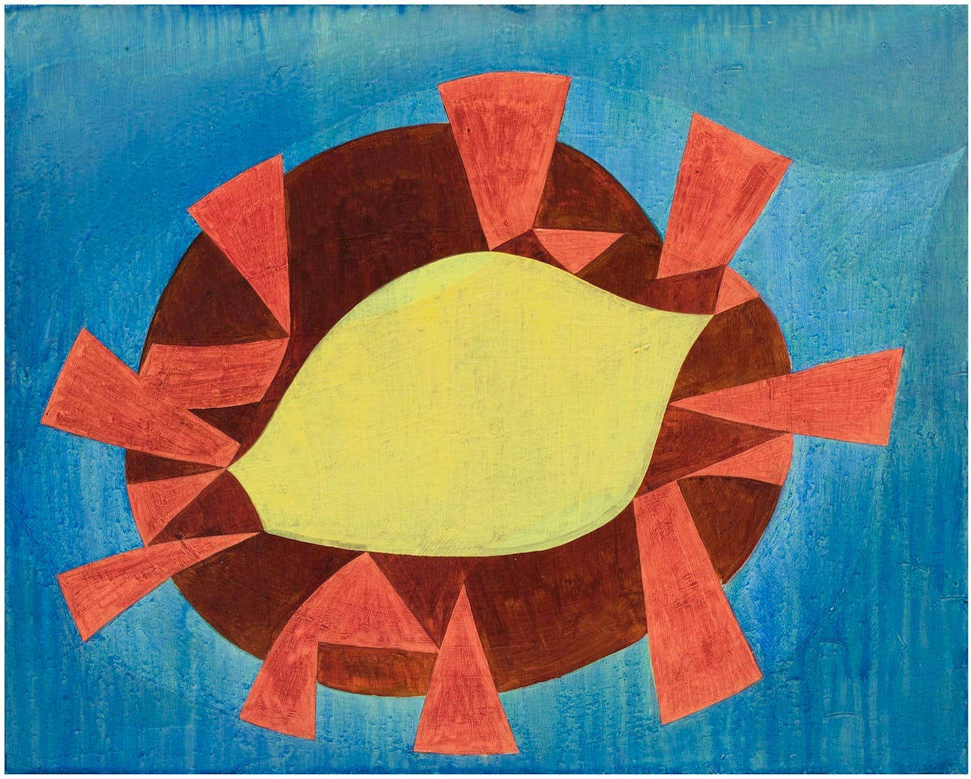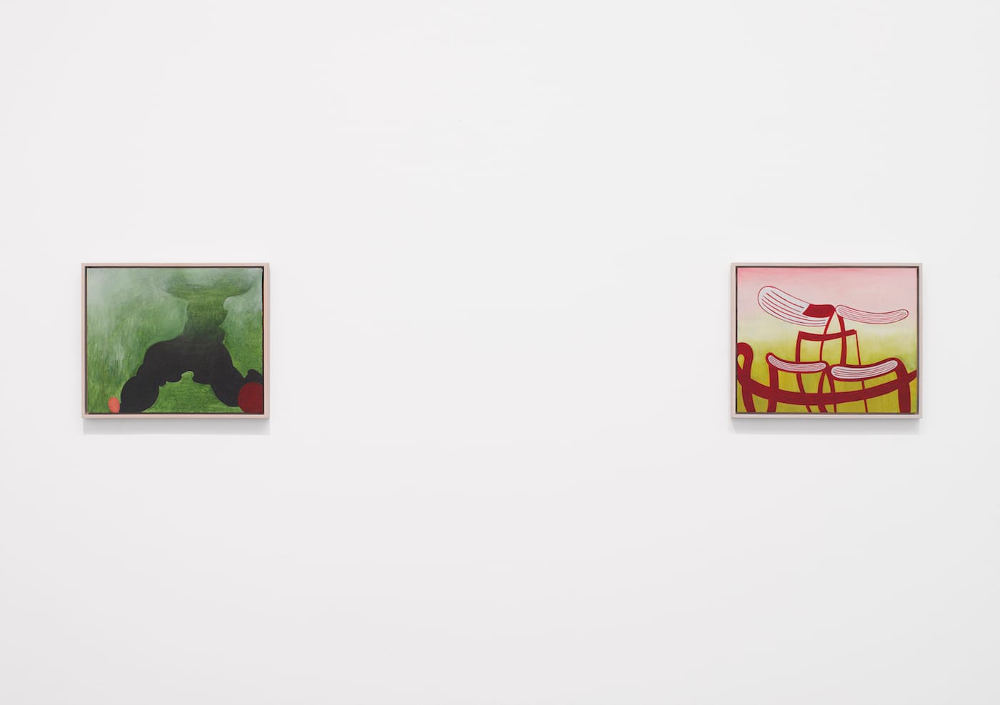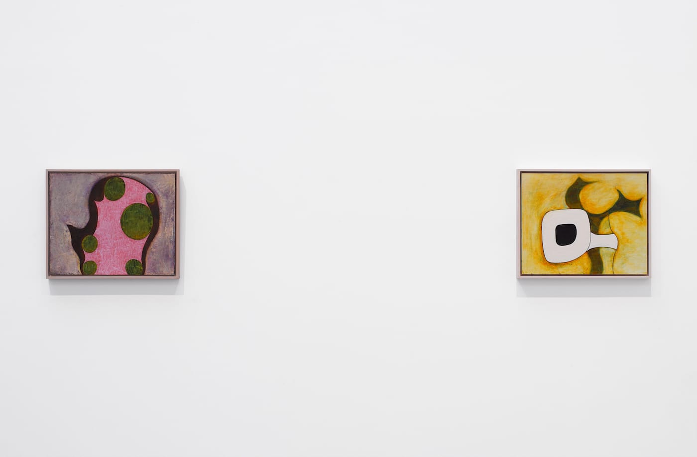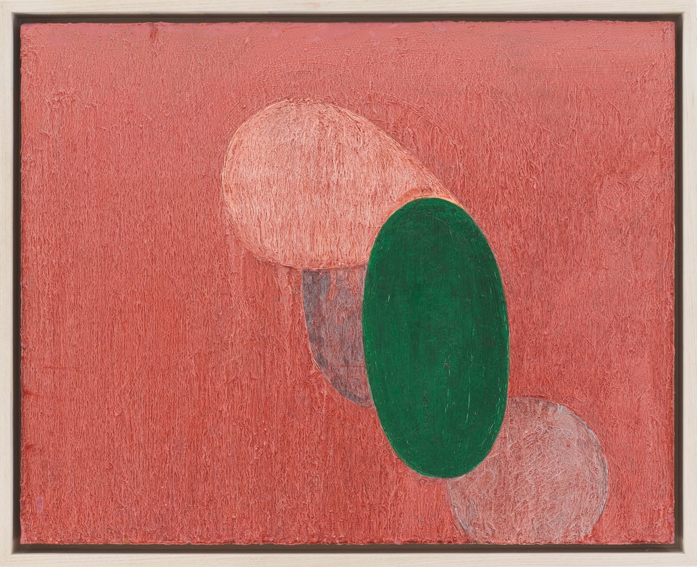 What about the internal pressure of the central form rising from the bottom edge in “Untitled (2-22)” (1982)? Made of four different shapes, each painted somewhat differently, the overall configuration comes off as awkward and blunt. There are four forms nestled in the melting raspberry-colored ground of “Untitled (6 – 73)” (1989). Three of them are porous and tonally related to the ground. However, Nozkowski overlays both the forms and the ground with a vertically aligned, solid green ellipse, as if he wanted to ensure that the painting wouldn’t melt away.