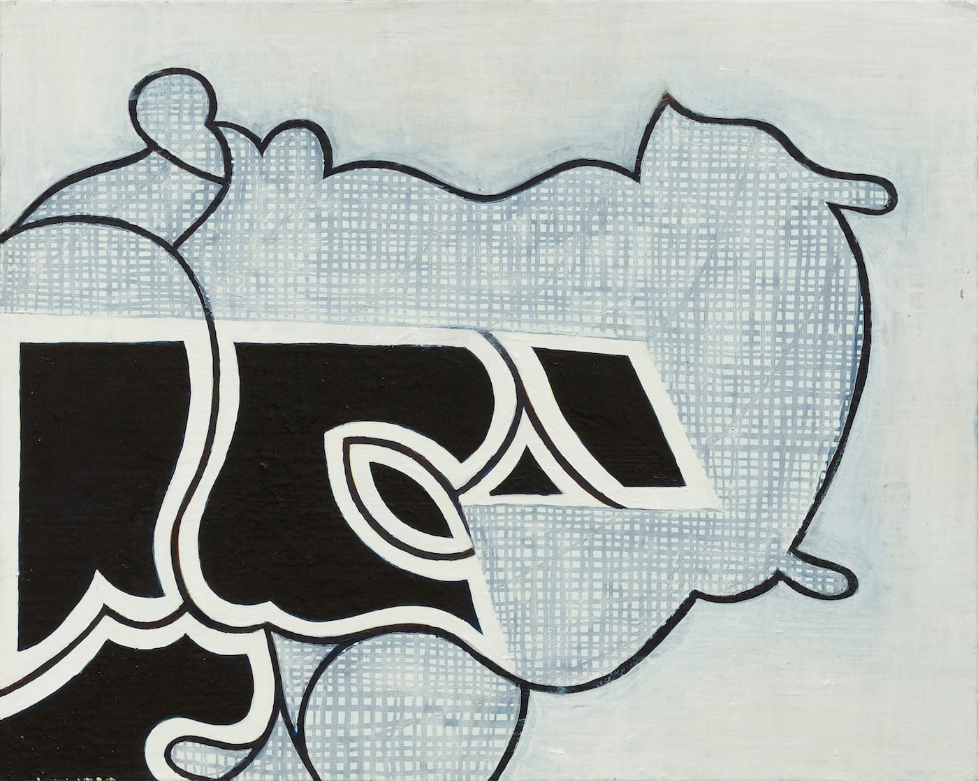 Throughout his career, Nozkowski has repeatedly found ways to do something unlikely and unexpected. He has coaxed a graphic, cartoony form out of a scumbled, outlined surface, and nestled a thinly painted shape between two solidly painted forms, undoing the stability of the figure-ground relationship. His paintings have pentimenti, clouds, and cascades. Shapes extend inward from all four sides or sit awkwardly near the center.