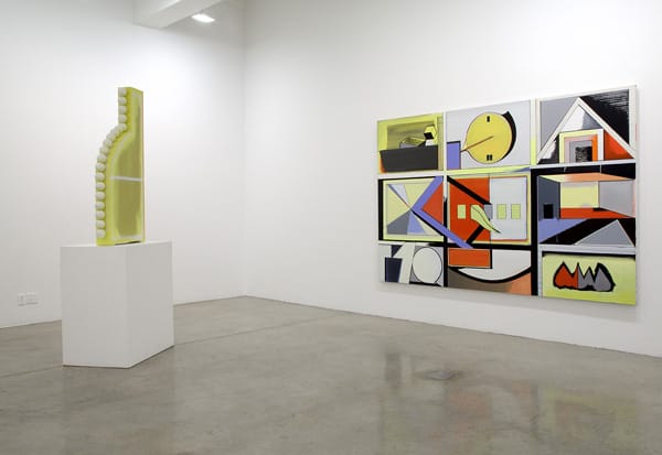 The viewer has to be attentive to the visual contradictions and recombinatory aspects of the forms and structures. In two areas, one shape can be read as extending into another, and near the center, an open, diagonally tilting rectangle — an echo of the falling painting in the main gallery — both pierces the picture plane and is flattened by it. By dividing the painting into nine rectangles, the artist subverts the idea of a wide-angled view. The shapes and forms within the rectangles are closely cropped, and they sit in a very shallow space. There is no panoramic or comprehensive view, no vantage point.