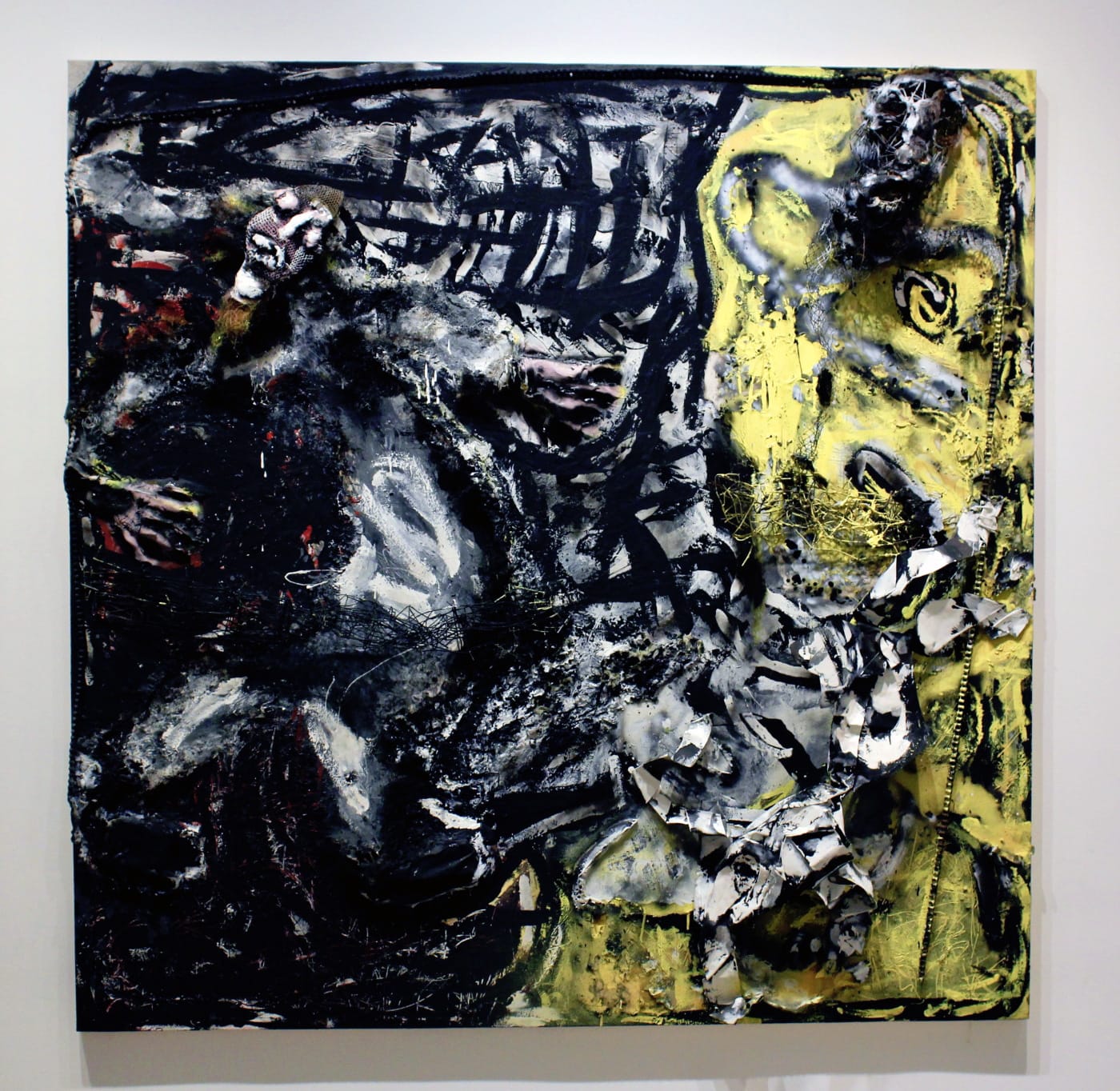“Looking Good” represents a slave auction, I was told. I first heard this anecdote while standing in front of the work, which shrieks and howls into three dimensional-space, seven and a half inches from the wall. Before learning this, its visual maelstrom suggested that I was witnessing the formation of some new cosmology. The slave auction anecdote sent shockwaves through my system as I glimpsed a profound understanding that comes with Dial’s expression of roots in the Deep South. “Looking Good”’s gripping narrative doesn’t stop there, however. The work was created in response to a controversial 60 Minutes segment, speeding the story through the twists and turns of contemporary media, and touching on questions of truth and exploitation that are perhaps even more relevant today than in 1993, when the 60 Minutes episode debuted.