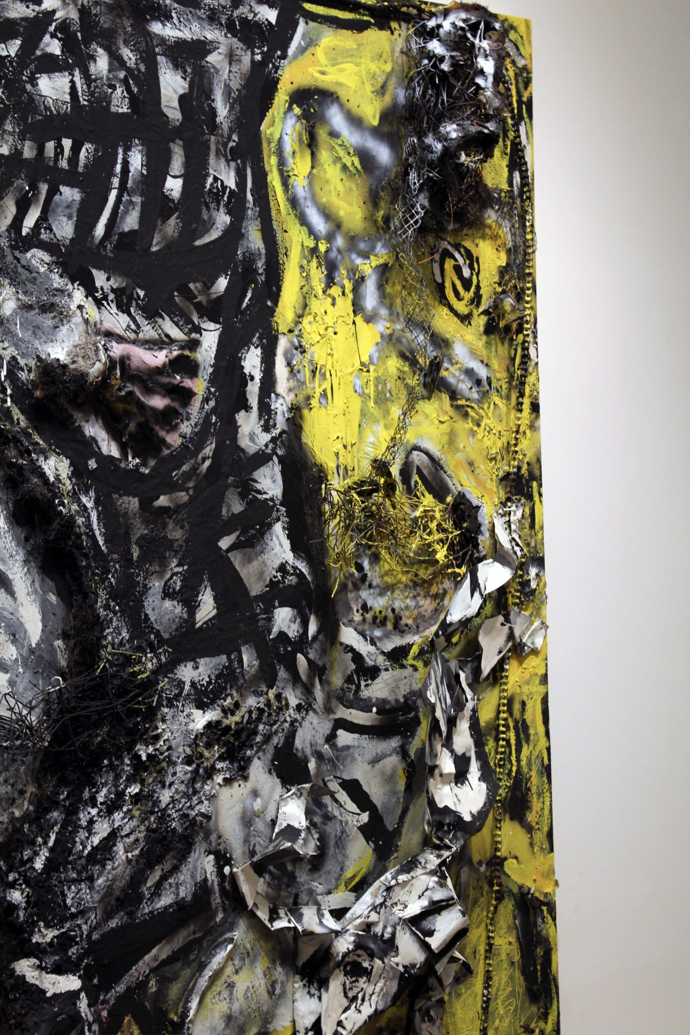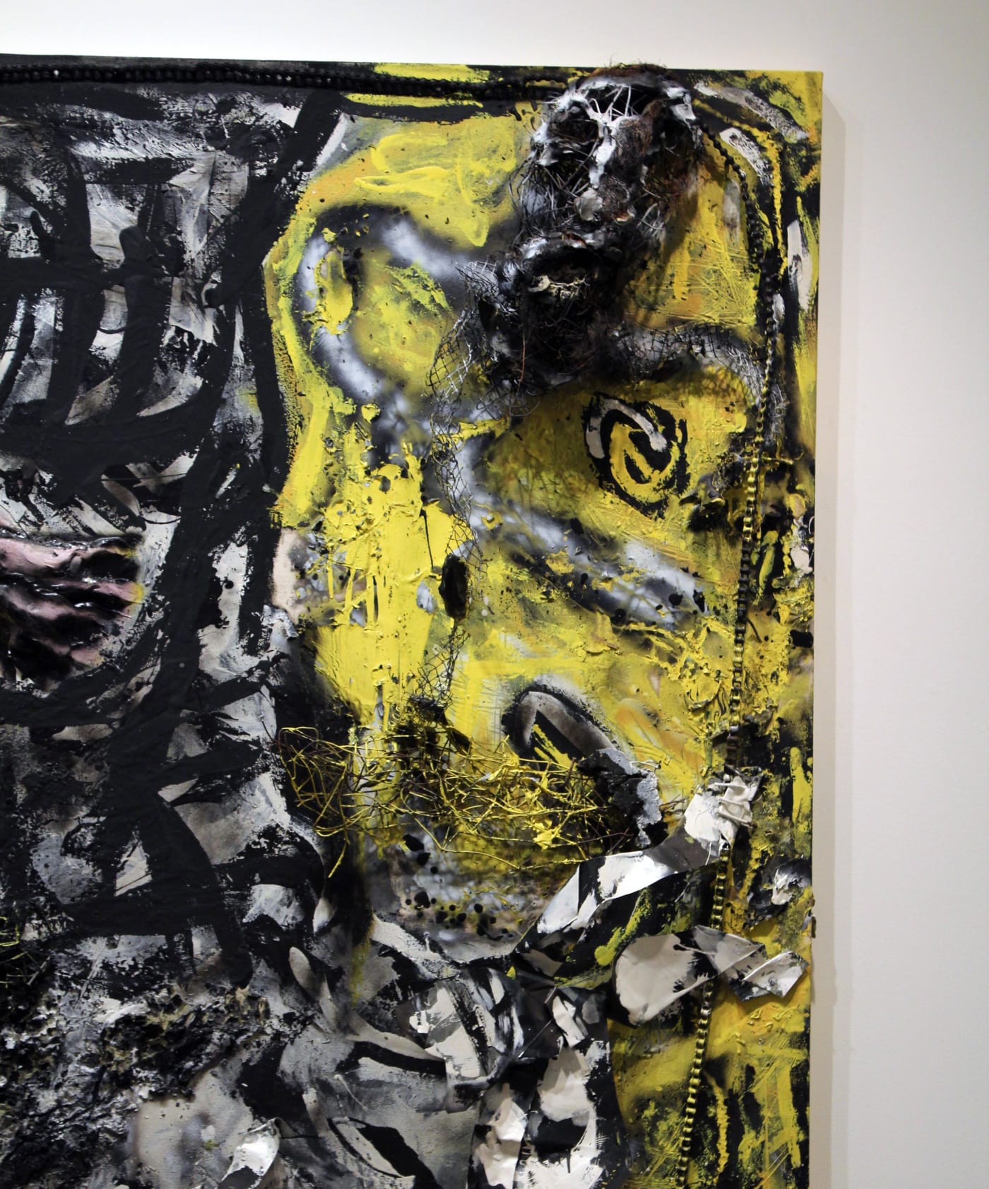 “Looking Good” is dark. Dial used a sledgehammer to shape tin and wire fencing into figures. Specters of men disfigured by the hammer attack erupt out of a blackened space. A bicycle chain lashes like a whip across three quarters of the square edge, while burned and shredded metal form hair and bodily features, the traces of a blow-torch creating an apocalyptic aura. Typical of Dial’s work, this assemblage is highly symbolic; the title, along with a bit of backstory, contain a wealth of meaning.