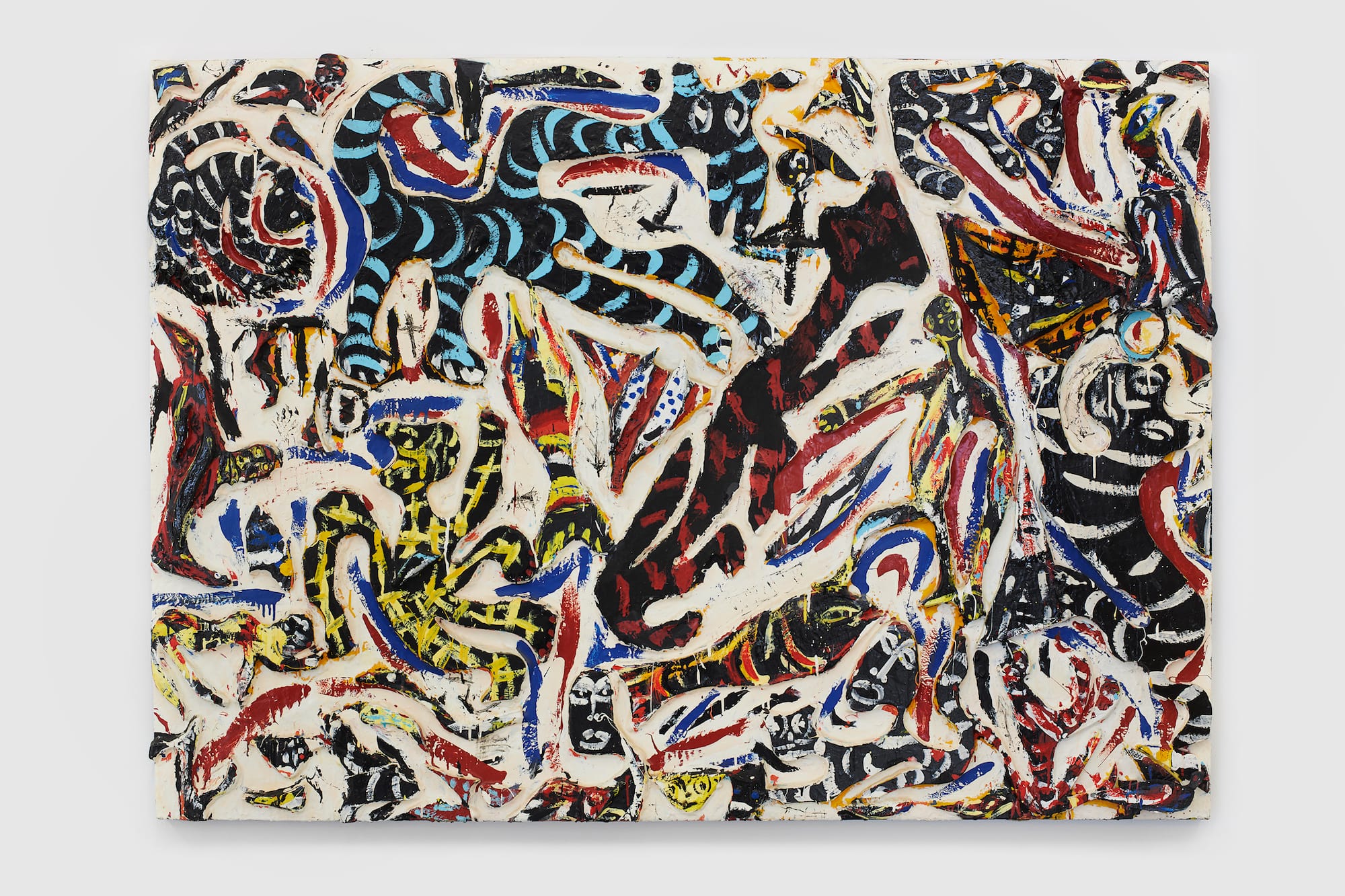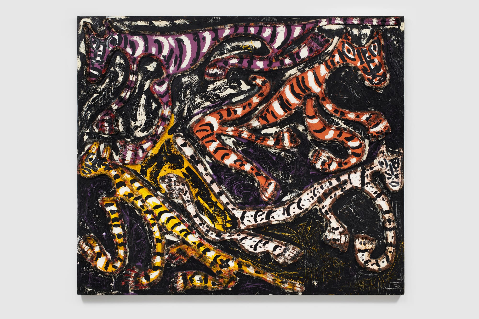 Embodiment, possibly of a tiger, is alluded to in “Meat” (2003) and “Bone Dry” (2011). The former signals the fleshiness of a living being —- either human or non-human —- with carnal pinks and reds, while the latter contains criss-crossed wooden slabs on the canvas, and the aforementioned jawbone. Both works utilize richly colored and energetic brushstrokes and designs, gesturing towards Dial’s experimentation with representing a tiger. “All the Cats in Town” (1993), on the other hand, emphasizes the body; four abstracted wild cats are entangled on the canvas. Painted in vibrant colors, the "cats" nod to jazz slang, adding a musical element to the rhythmic brushstrokes.