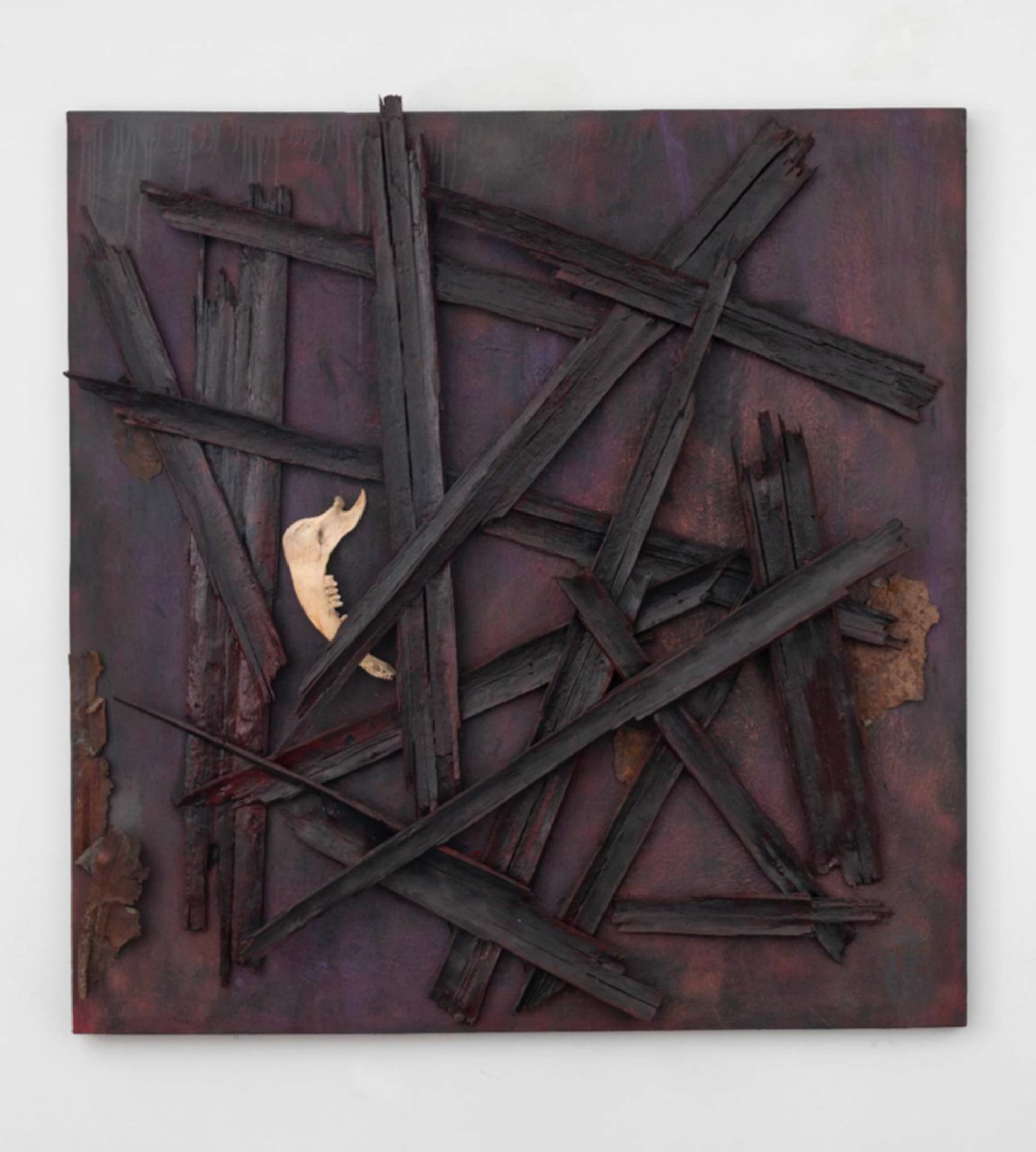 Thornton Dial, "Bone Dry" (2011), wood, tin, animal jawbone, and enamel on canvas on wood, 74 x 71 x 4 inches