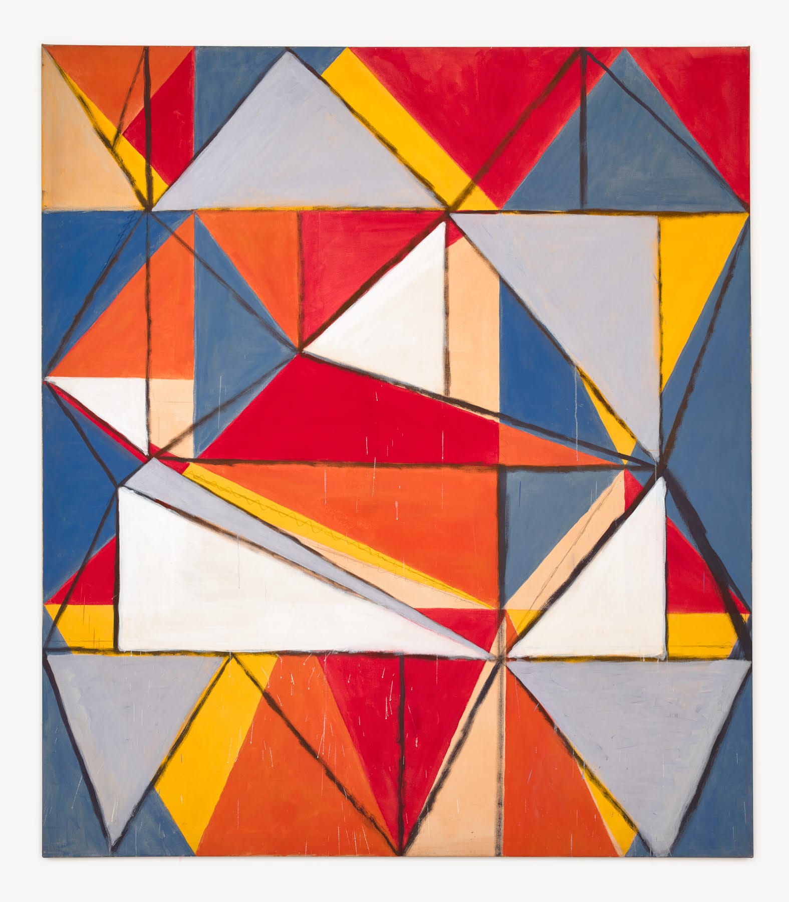 This ambiguity is more obvious in the two series Triangles and Prismatics, from the 1990s. In these series, triangles of different sizes divide up the painting’s rectangular picture plane. While the Triangles paintings consist of one layer, in Prismatics, a second group of triangles overlays the first; these are composed of solid-colored planes and linear outlines that do not completely cover the previous layer. The two sets of divided planes establish a space that, paradoxically, seems entirely flat. While this tension is specific to “Brooklyn Bridge” (1993), as a general rule Willis’s paintings are animated by the stress between figure and ground, surface and depth, completeness and incompleteness.