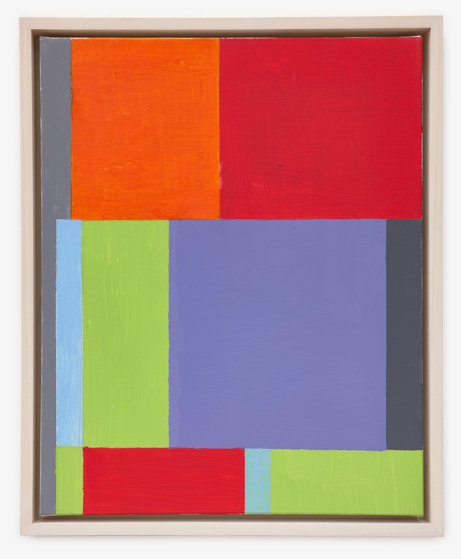 Glimpses of red line both the left and right edges of “Full House,” contrasting its yellow ground, along with hints of earlier colors extending just beyond the edges of the blue wedge that occupies much of this figure-ground painting. What is clear is that Willis loves the physical act of paint, but does not fetishize it.