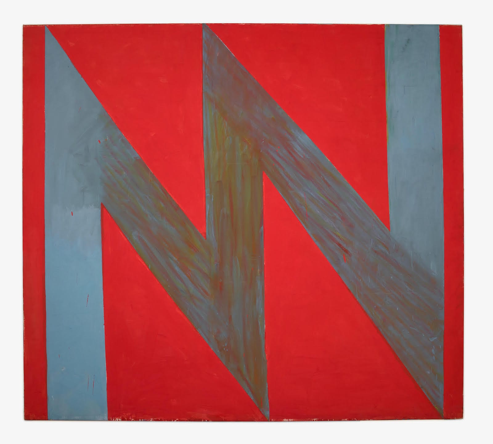 In “Hot Shot” Willis began applying red and yellow on the silver gray zigzag that traverses the red ground, but then stopped, leaving diluted streaks and smears. The two vertical bands of the zigzag, which frame the diagonals, are gray and unmarked except for a few drips of red. I got the feeling that the painting was simultaneously finished and unfinished.