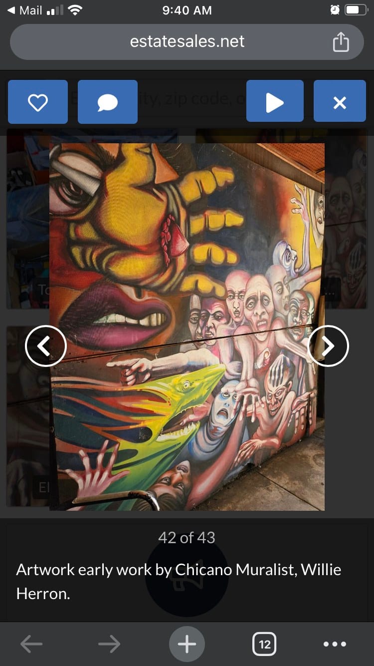 The two artworks had been included in an estate sale put on by the owners of Herrón’s old house. Jimenez purchased the mannequin for $100 and the mural panels for an undisclosed sum. "I saw his work every day on my way to school and church,” Jimenez told Hyperallergic. He grew up on Snow Drive, two blocks from “The Wall That Cracked Open” (1972), one of Herrón’s best-known murals, painted at the site where his younger brother was stabbed by gang members. “I told the lady, ‘This is important,’” he said.
