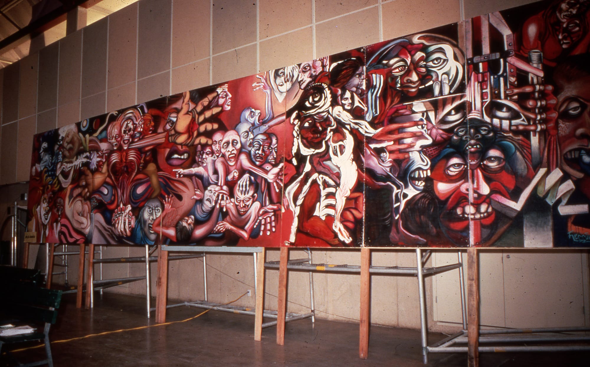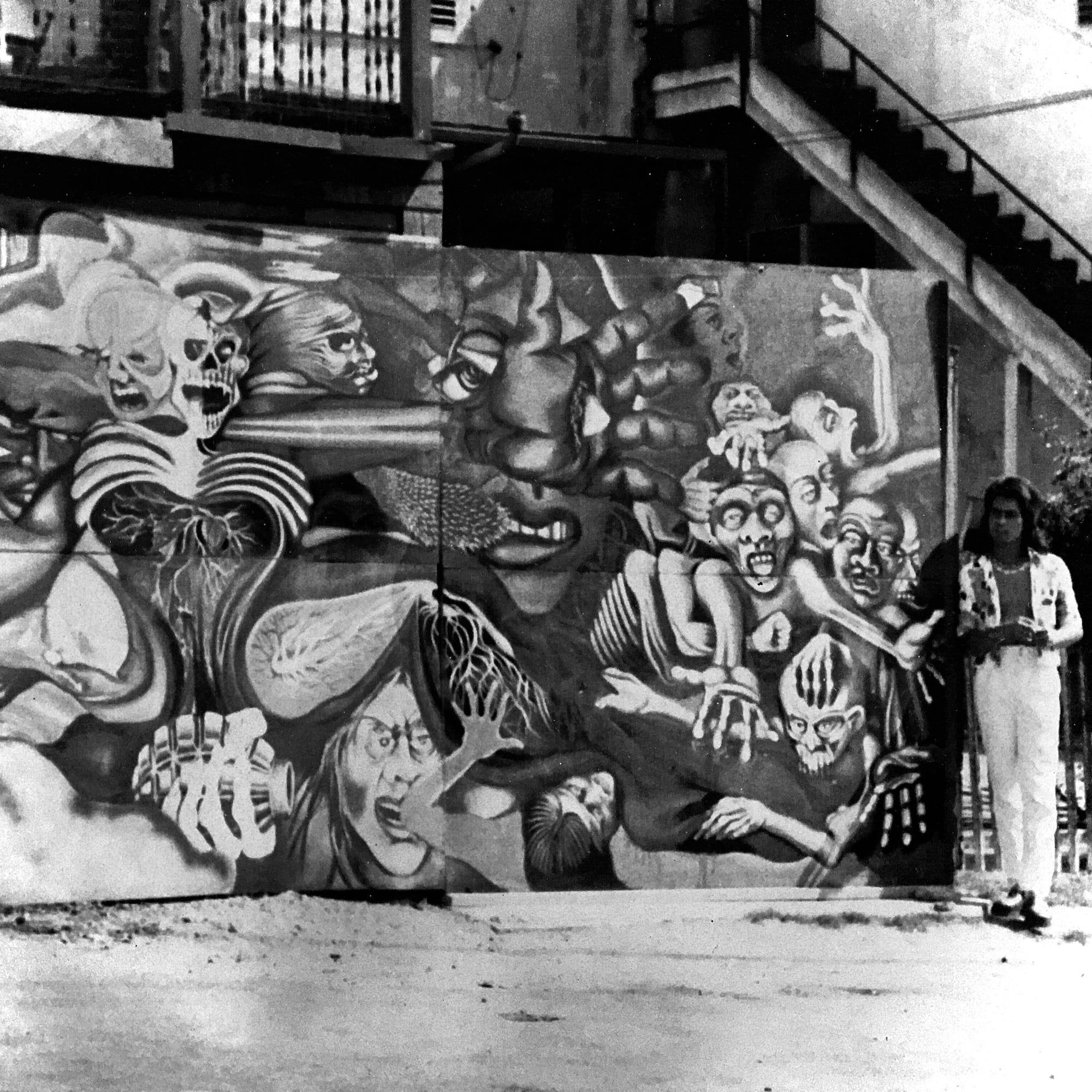 In 1987, artist Willie Herrón sold his home and studio located on the El Sereno-Alhambra border of Los Angeles and left for a short tour with his punk band Los Illegals. He asked some friends to help him move since he would be out of town. Upon his return, he realized some of his artwork was missing, most notably the left and right sections of a 36-foot-long multi-panel portable mural titled “Mi Vida y Sueños Locos” ("My Life and Crazy Dreams") (1973).