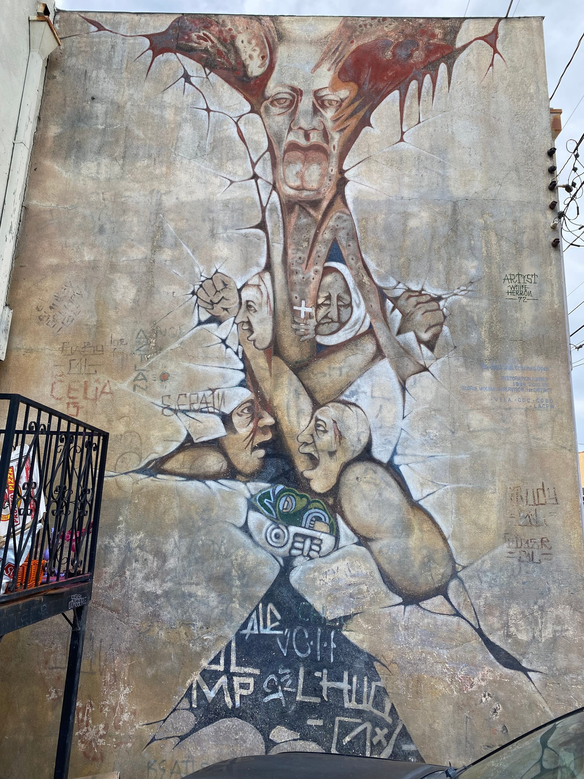 Herrón contacted the new owners of the house, who informed him that anything left behind had been disposed of. “‘Oh, your artwork, a lot of it was pretty dilapidated,'" the artist recalls being told. "'We broke it up and threw it out last week.’” Though dismayed by the destruction of the piece, he still had possession of part of the mural’s central section depicting a skeleton flanked by anguished faces, which he reimagined as a standalone artwork titled simply “Sueños Locos” ("Crazy Dreams").