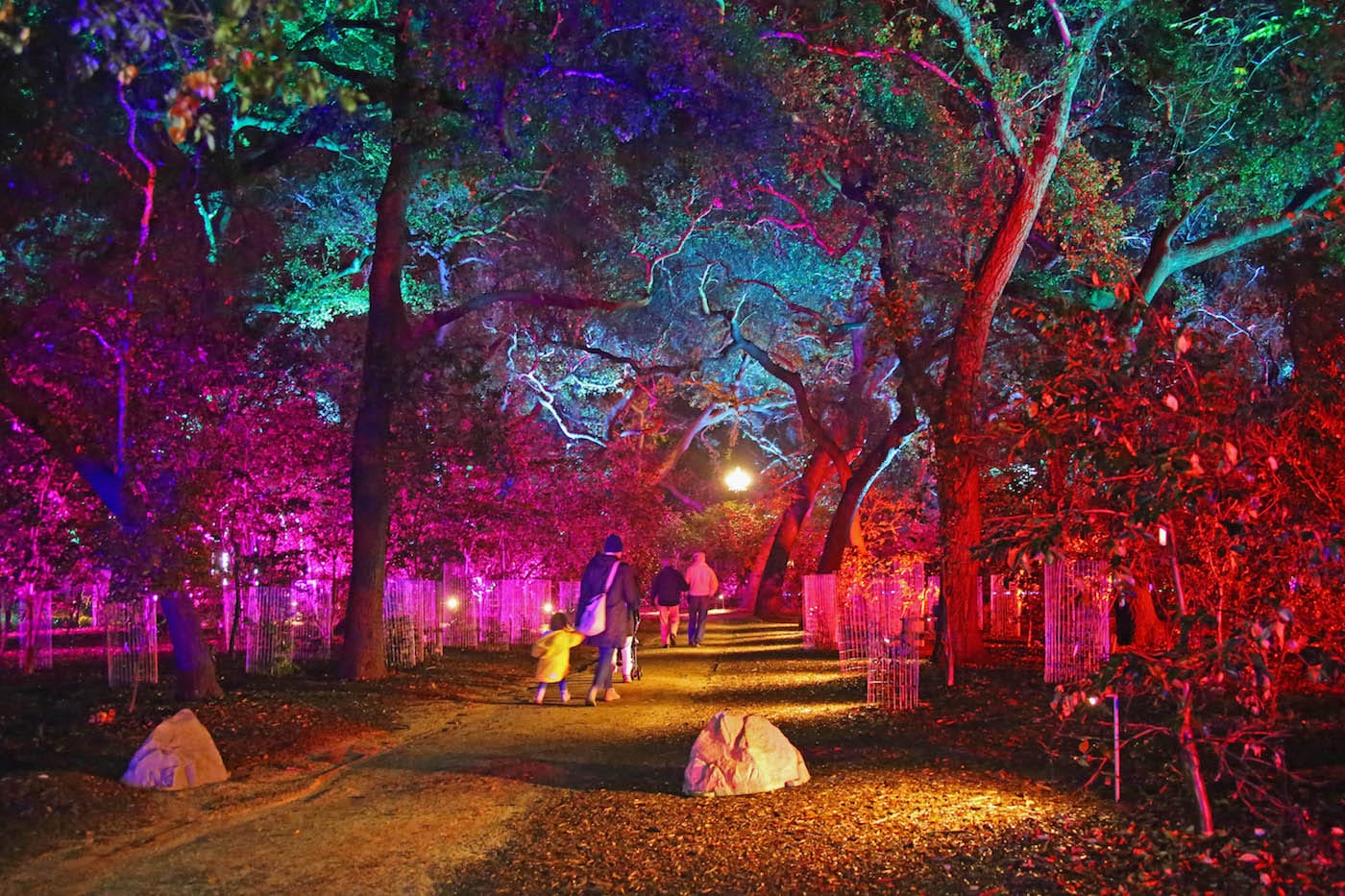 Descanso Gardens houses one of Southern California’s most impressive collections of flora, comprising a Rose Garden, Japanese Garden, Ancient Forest, and a section devoted to California Native Plants. During the holiday season, the gardens come alive each evening with a mile-long walk full of interactive, large-scale light displays, the Enchanted Forest of Light. Highlights from the program include “Celestial Shadows,” spinning polyhedral installations by HYBYCOZO; “stained glass” creations by Tom Fruin; and Jen Lewin’s glowing, meandering pathways, “Aqueous.”